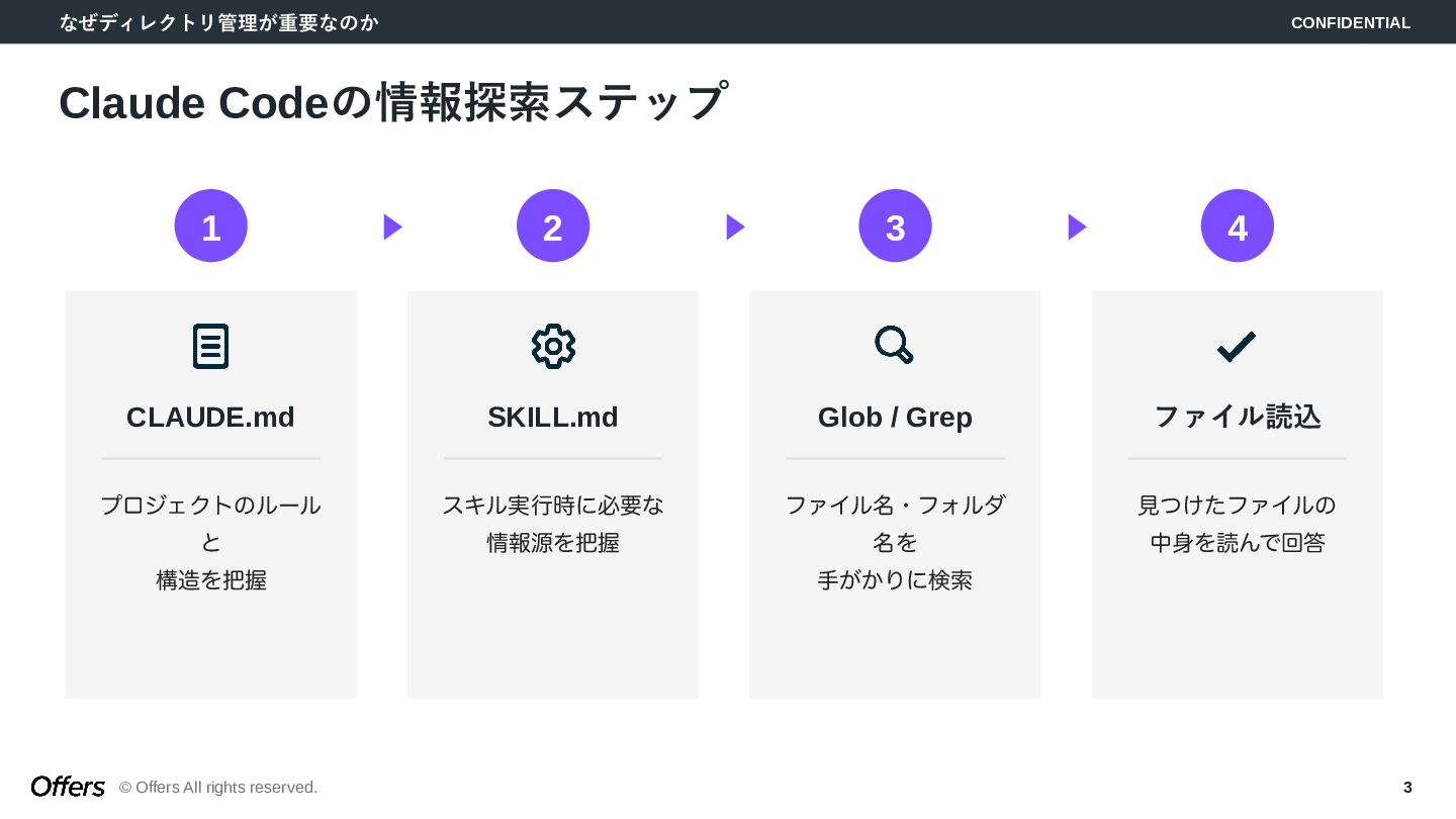 3. なぜディレクトリ管理が重要なのか CONFIDENTIAL © Offers All rights reserved. 3 Claude Codeの情報探索ステップ