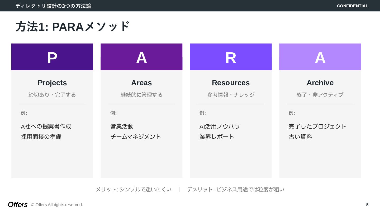 5. ディレクトリ設計の3つの方法論 CONFIDENTIAL © Offers All rights reserved. 5 方法1: PARAメソッド