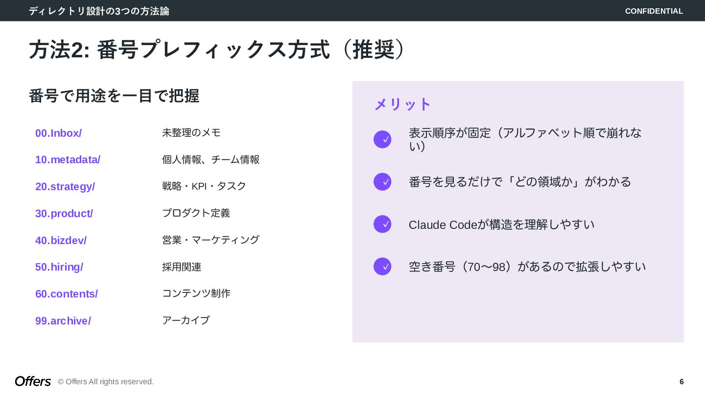 6. ディレクトリ設計の3つの方法論 CONFIDENTIAL © Offers All rights reserved. 6 方法2: 番号プレフィックス方式(推奨)