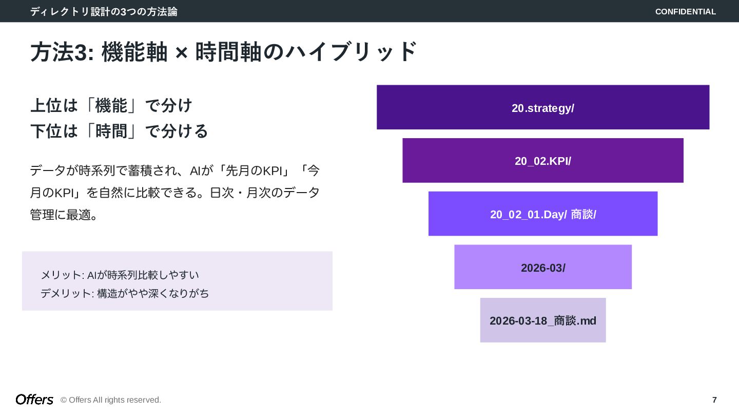 × 時間軸のハイブリッド 上位は「機能」で分け 下位は「時間」で分ける データが時系列で蓄積され、AIが「先月のKPI」「今 月のKPI」を自然に比較できる。日次・月次のデータ 管理に最適。 メリット: AIが時系列比較しやすい デメリット: 構造がやや深くなりがち 20.strategy/ 20_02.KPI/ 20_02_01.Day/ 商談/ 2026-03/ 2026-03-18_商談.md