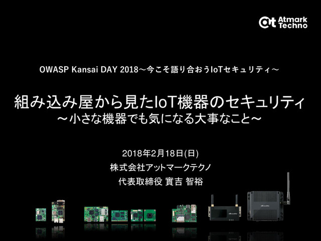 OWASP Kansai DAY 2018~今こそ語り合おうIoTセキュリティ~ 組み込み屋から見たIoT機器のセキュリティ ~小さな機器でも気になる大事なこと~ 2018年2月18日(日) 株式会社アットマークテクノ 代表取締役 實吉