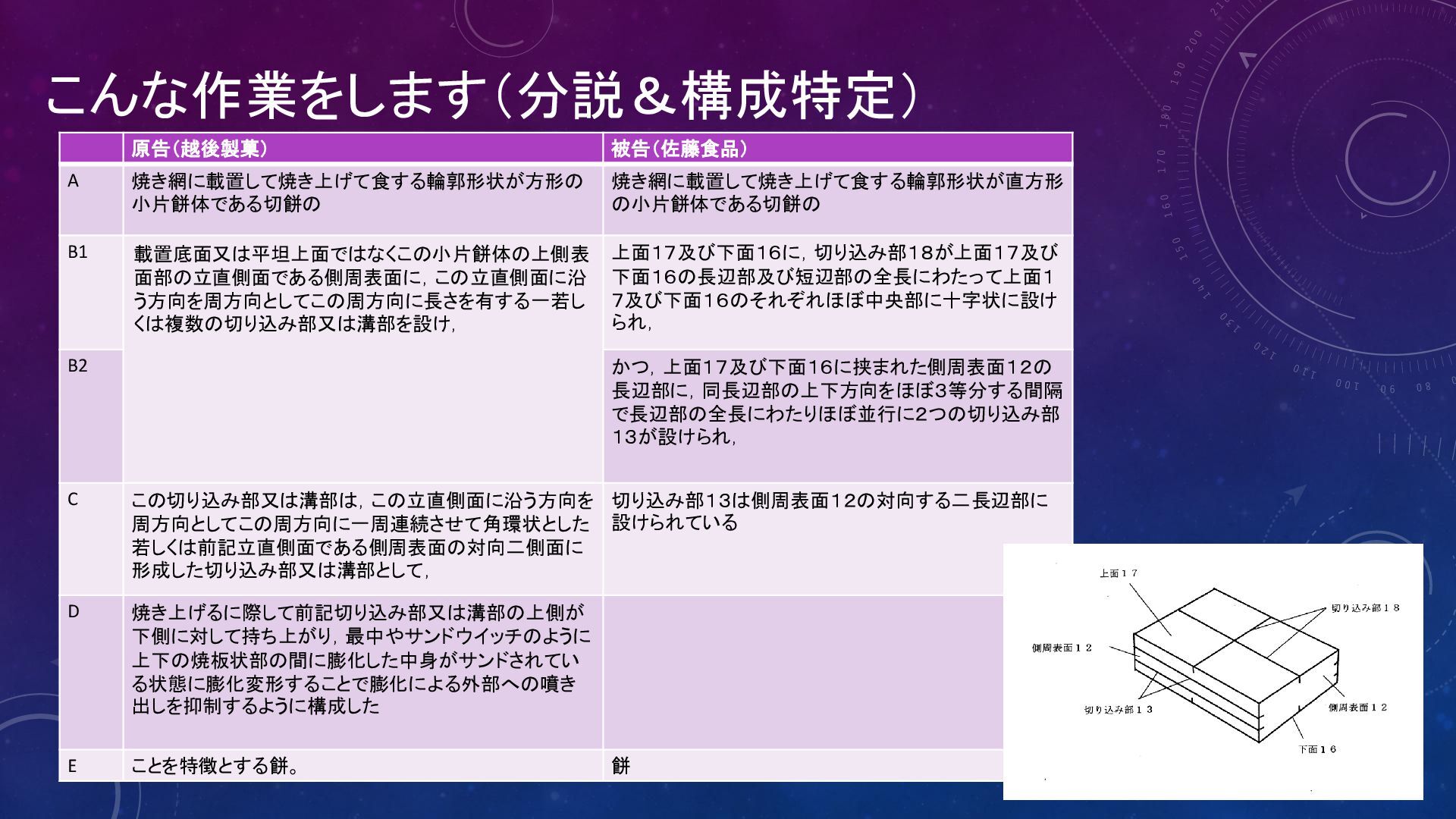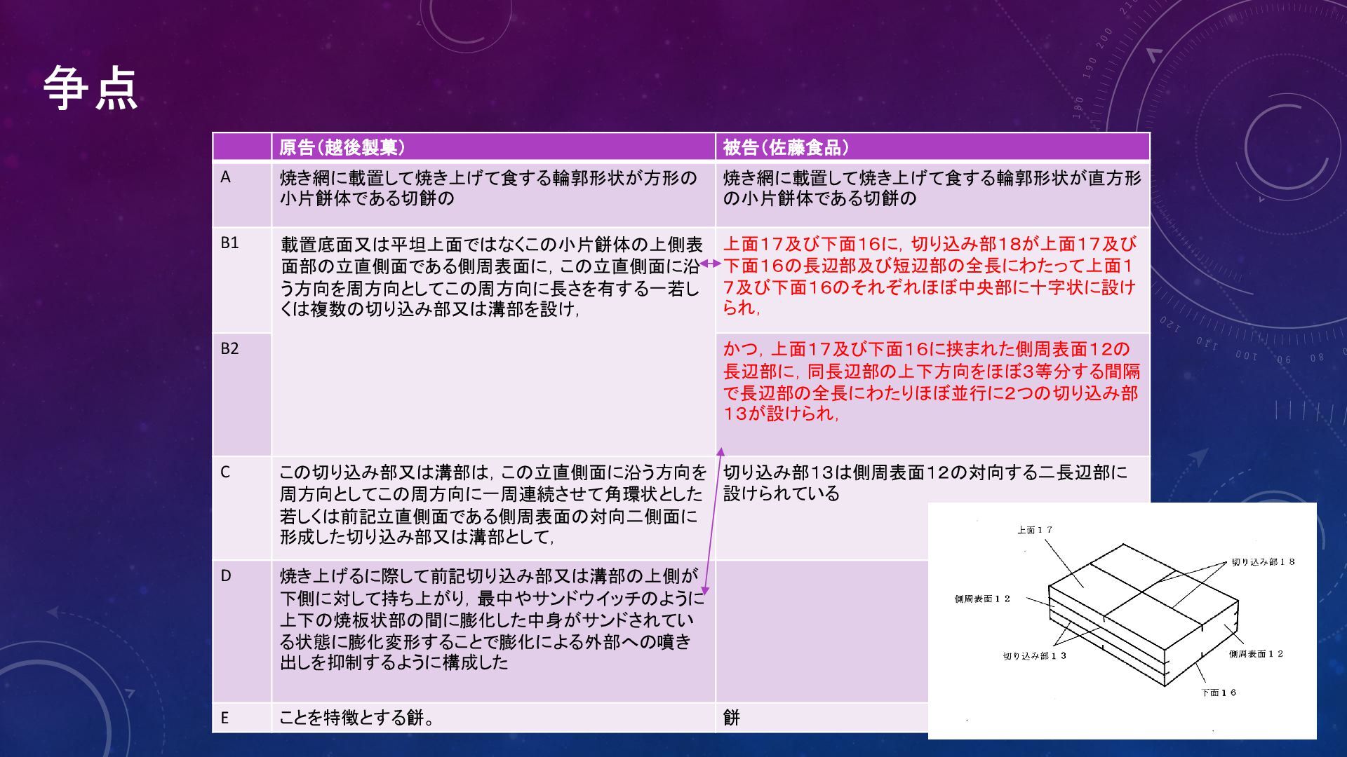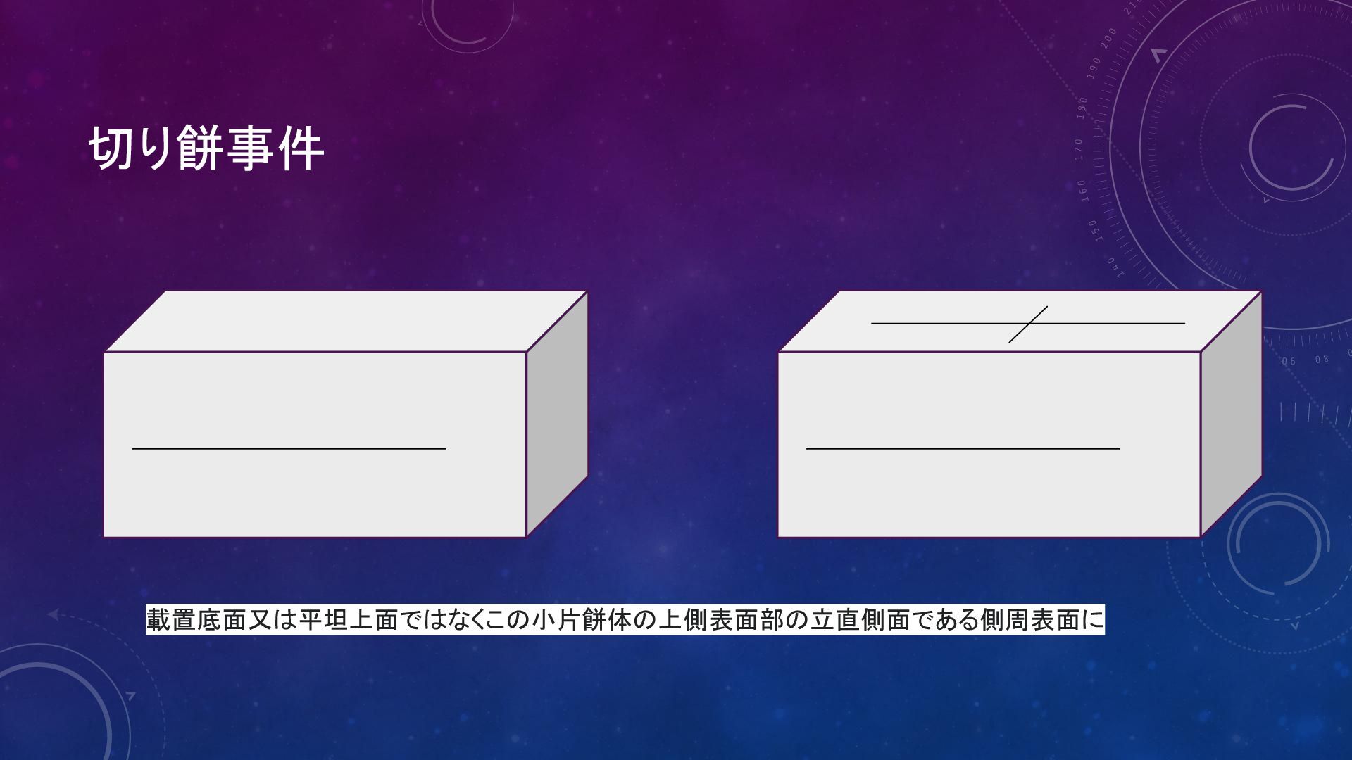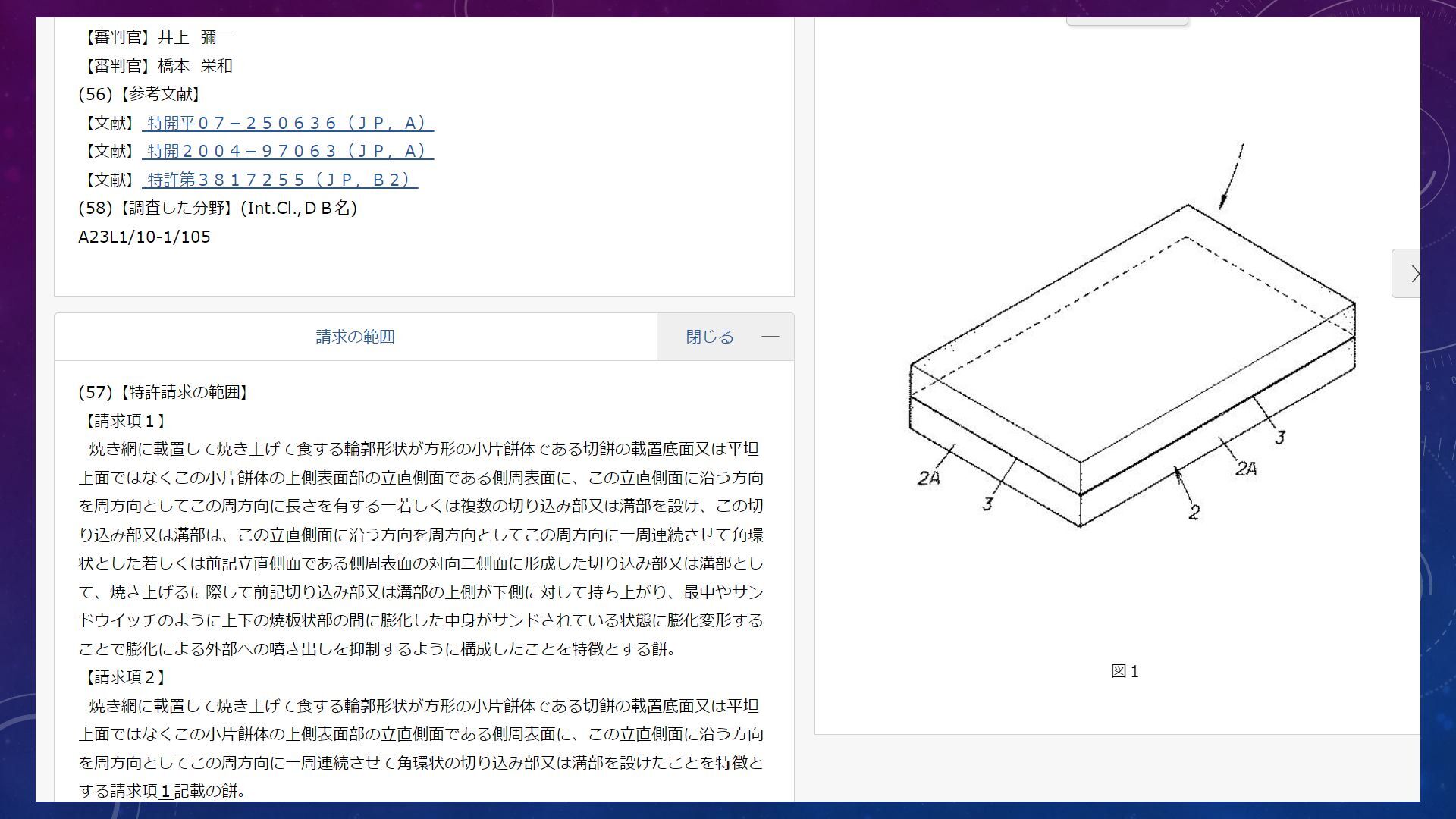 面部の立直側面である側周表面に,この立直側面に沿 う方向を周方向としてこの周方向に長さを有する一若し くは複数の切り込み部又は溝部を設け, 上面17及び下面16に,切り込み部18が上面17及び 下面16の長辺部及び短辺部の全長にわたって上面1 7及び下面16のそれぞれほぼ中央部に十字状に設け られ, B2 かつ,上面17及び下面16に挟まれた側周表面12の 長辺部に,同長辺部の上下方向をほぼ3等分する間隔 で長辺部の全長にわたりほぼ並行に2つの切り込み部 13が設けられ, C この切り込み部又は溝部は,この立直側面に沿う方向を 周方向としてこの周方向に一周連続させて角環状とした 若しくは前記立直側面である側周表面の対向二側面に 形成した切り込み部又は溝部として, 切り込み部13は側周表面12の対向する二長辺部に 設けられている D 焼き上げるに際して前記切り込み部又は溝部の上側が 下側に対して持ち上がり,最中やサンドウイッチのように 上下の焼板状部の間に膨化した中身がサンドされてい る状態に膨化変形することで膨化による外部への噴き 出しを抑制するように構成した E ことを特徴とする餅。 餅