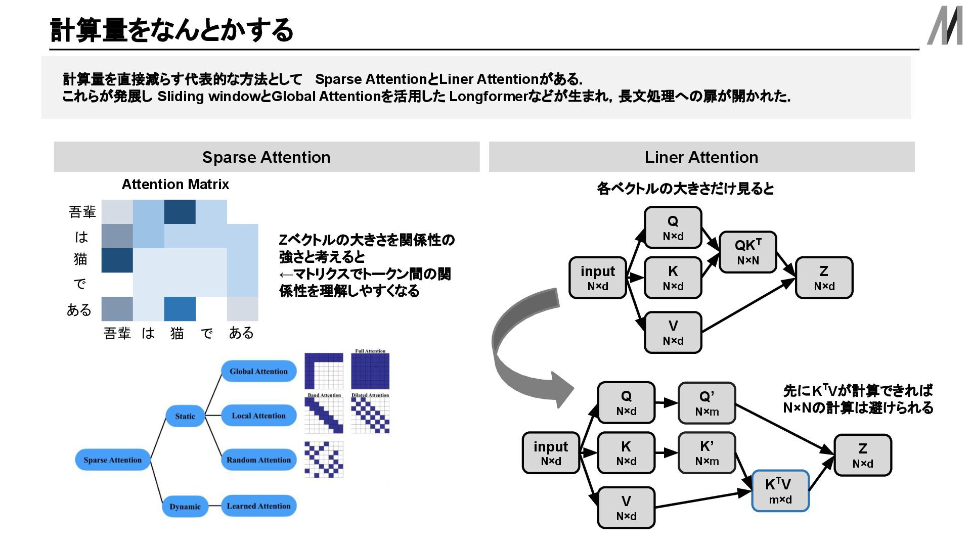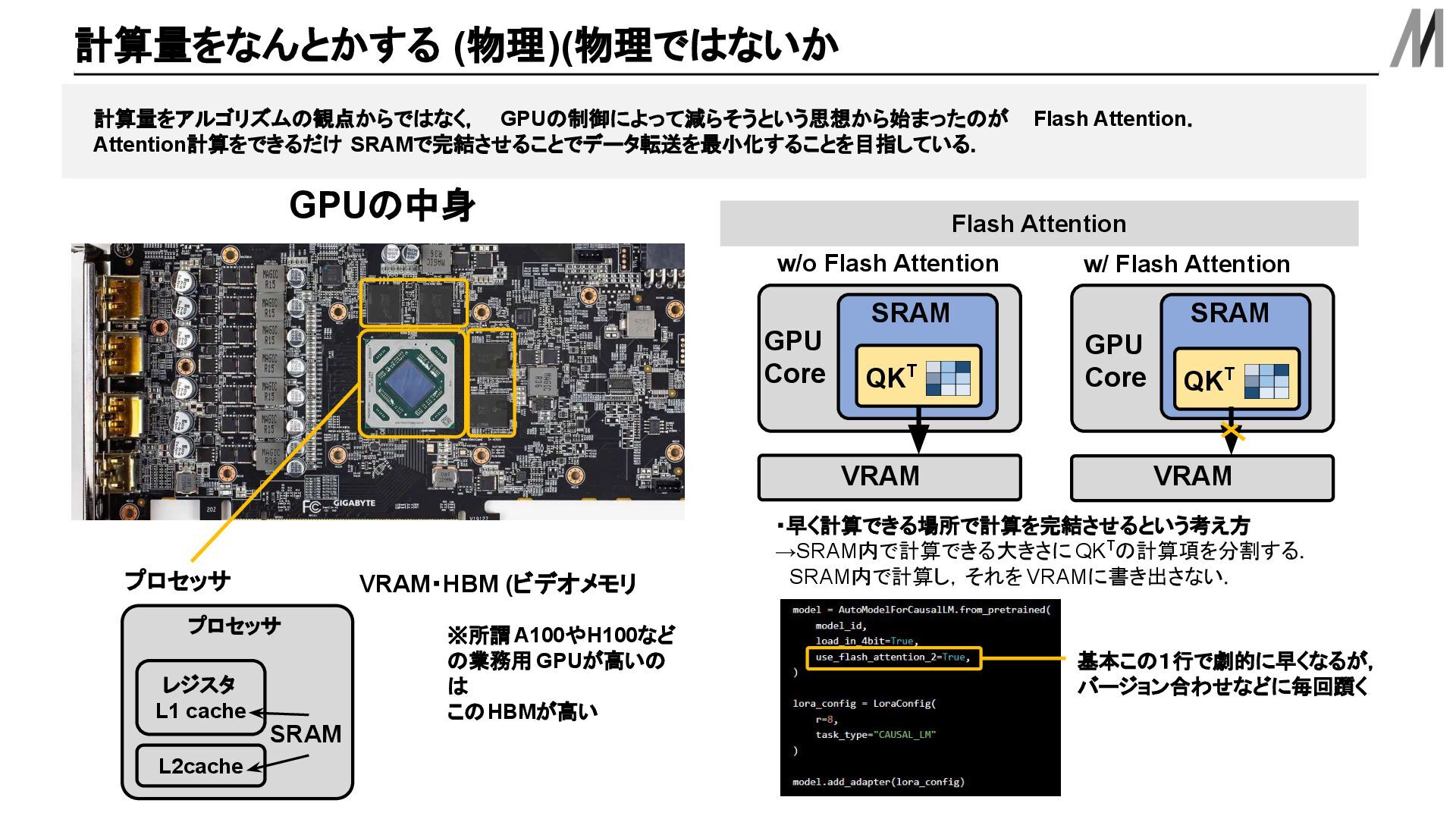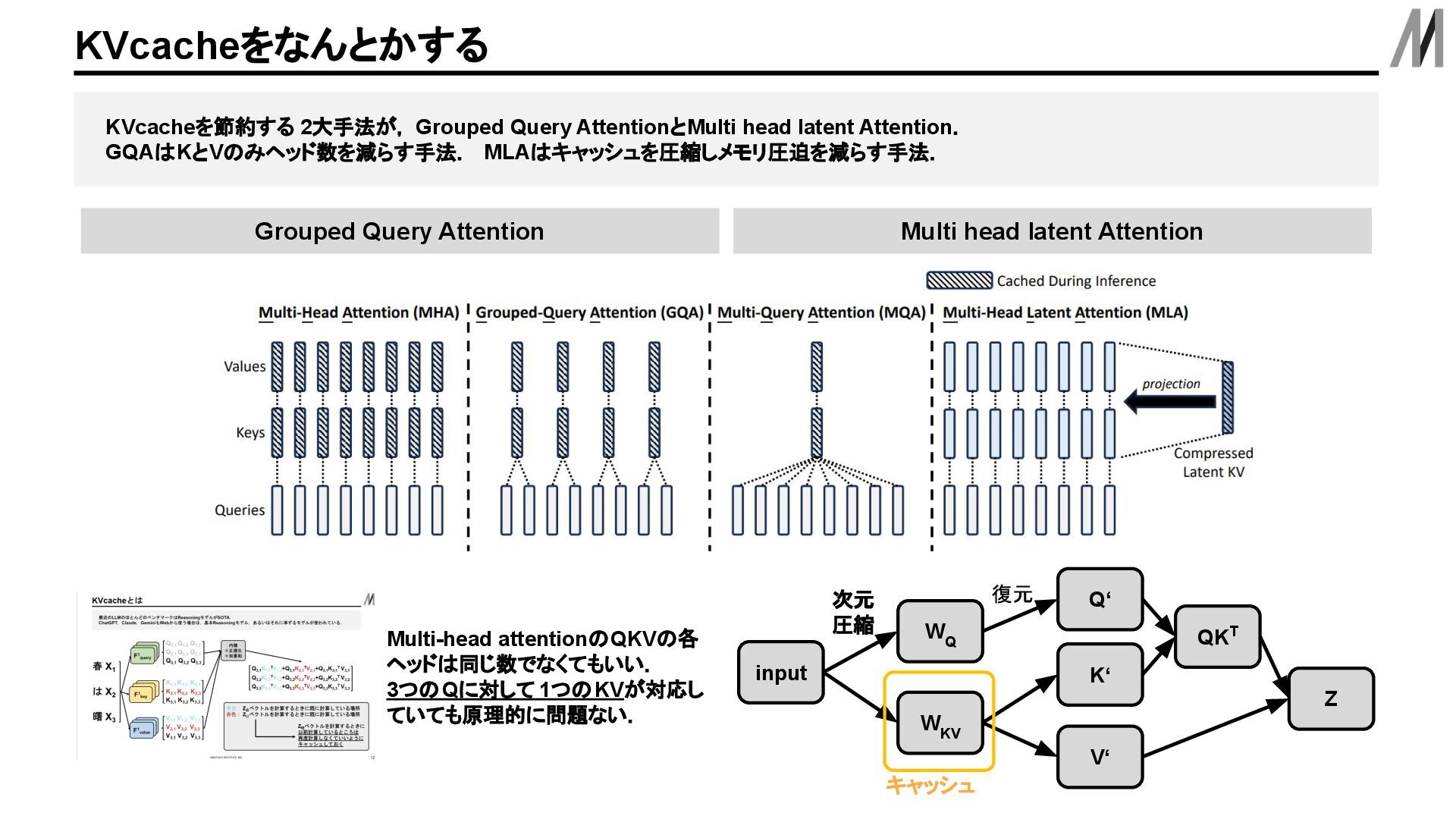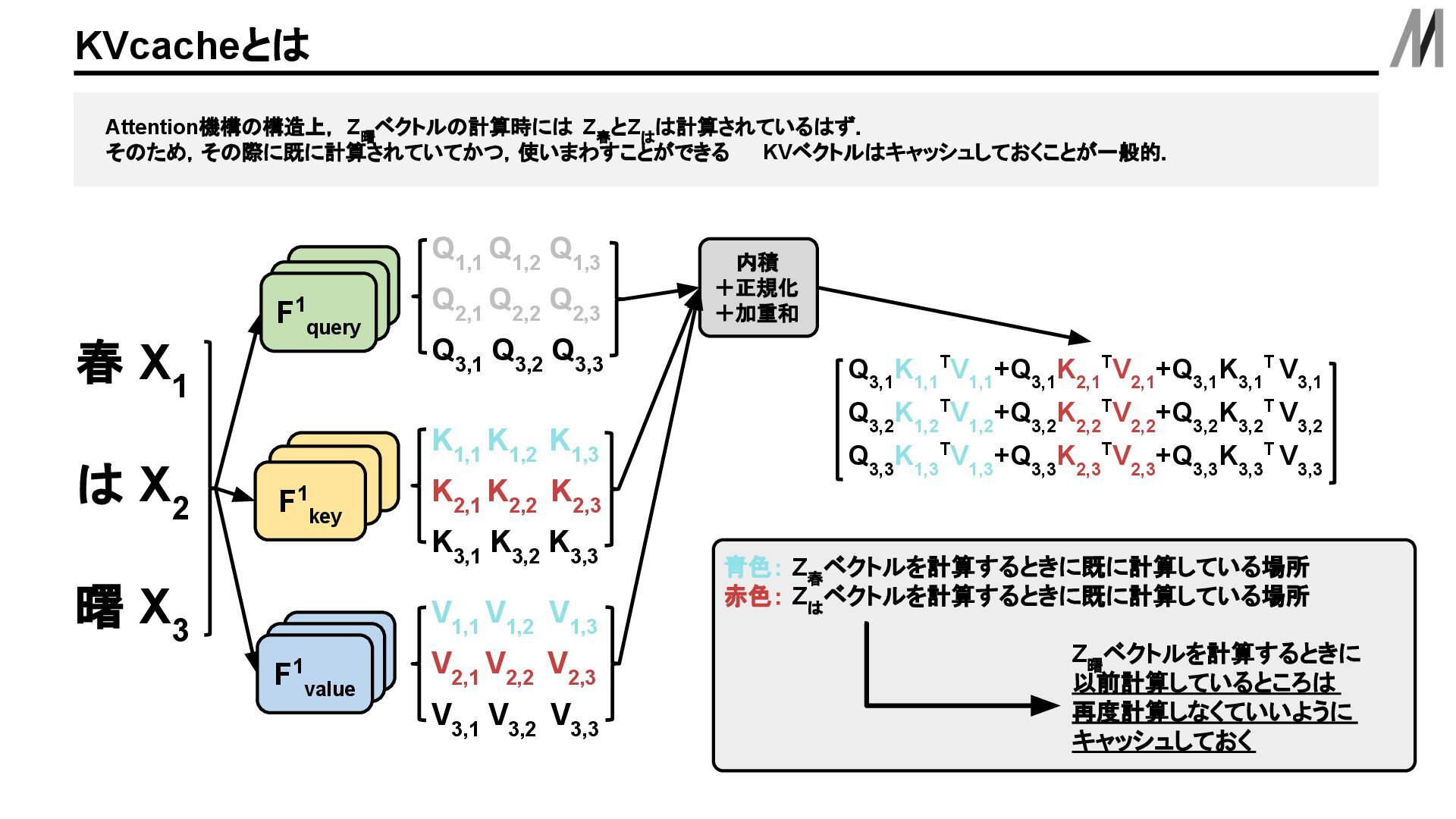 KVベクトルはキャッシュしておくことが一般的. KVcacheとは は X 2 春 X 1 曙 X 3 内積 +正規化 +加重和 Q 1,1 Q 1,2 Q 1,3 Q 2,1 Q 2,2 Q 2,3 Q 3,1 Q 3,2 Q 3,3 F query F1 query F1 query F key F key F1 key F query F1 query F1 value K 1,1 K 1,2 K 1,3 K 2,1 K 2,2 K 2,3 K 3,1 K 3,2 K 3,3 V 1,1 V 1,2 V 1,3 V 2,1 V 2,2 V 2,3 V 3,1 V 3,2 V 3,3 Q 3,1 K 1,1 TV 1,1 +Q 3,1 K 2,1 TV 2,1 +Q 3,1 K 3,1 T V 3,1 Q 3,2 K 1,2 TV 1,2 +Q 3,2 K 2,2 TV 2,2 +Q 3,2 K 3,2 T V 3,2 Q 3,3 K 1,3 TV 1,3 +Q 3,3 K 2,3 TV 2,3 +Q 3,3 K 3,3 T V 3,3 青色: Z 春 ベクトルを計算するときに既に計算している場所 赤色: Z は ベクトルを計算するときに既に計算している場所 Z 曙 ベクトルを計算するときに 以前計算しているところは 再度計算しなくていいように キャッシュしておく