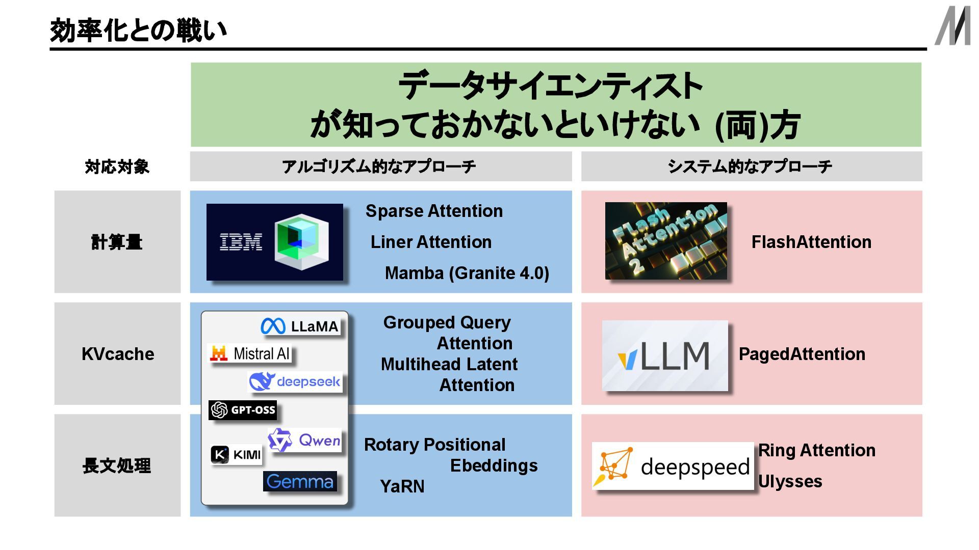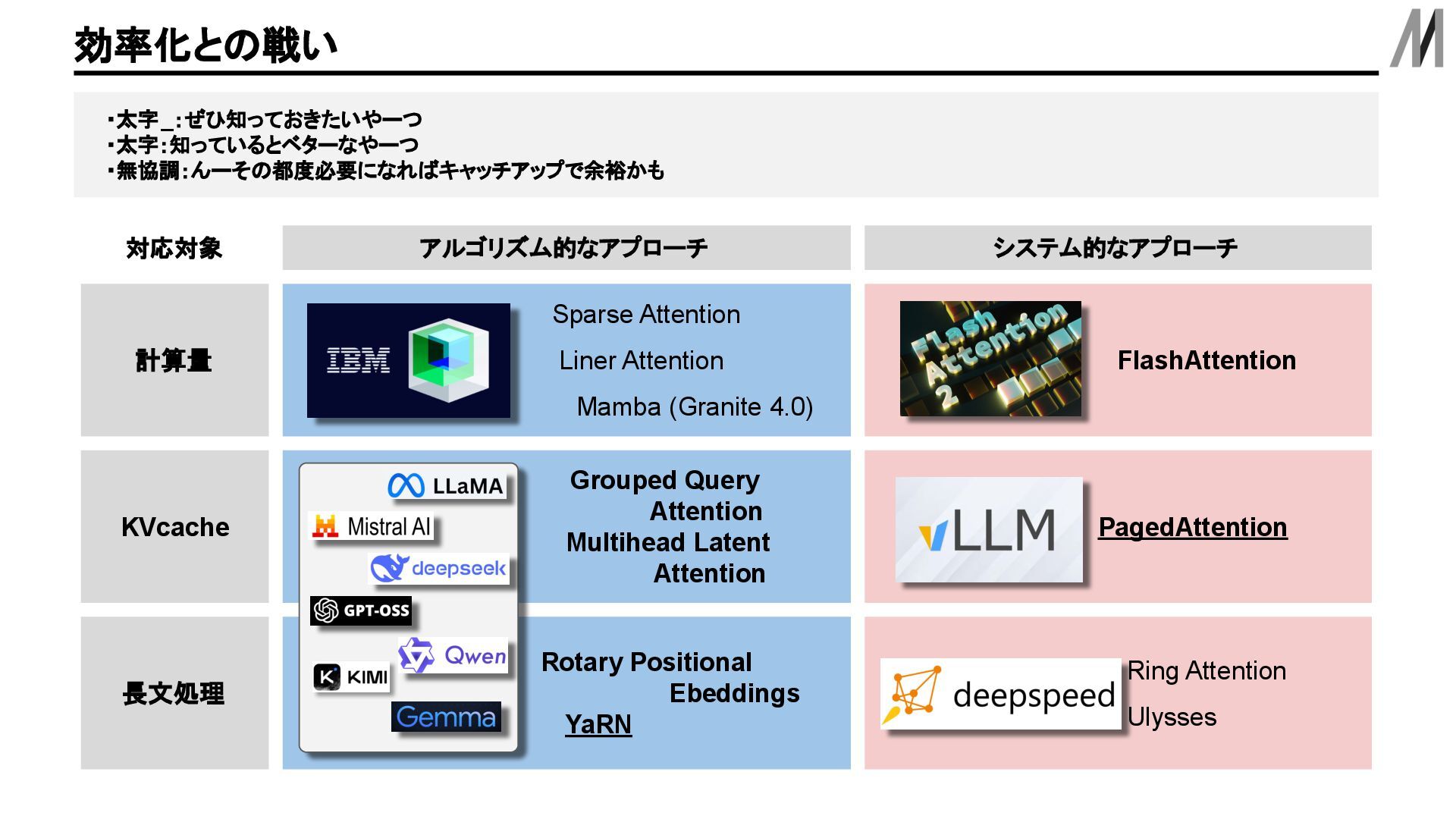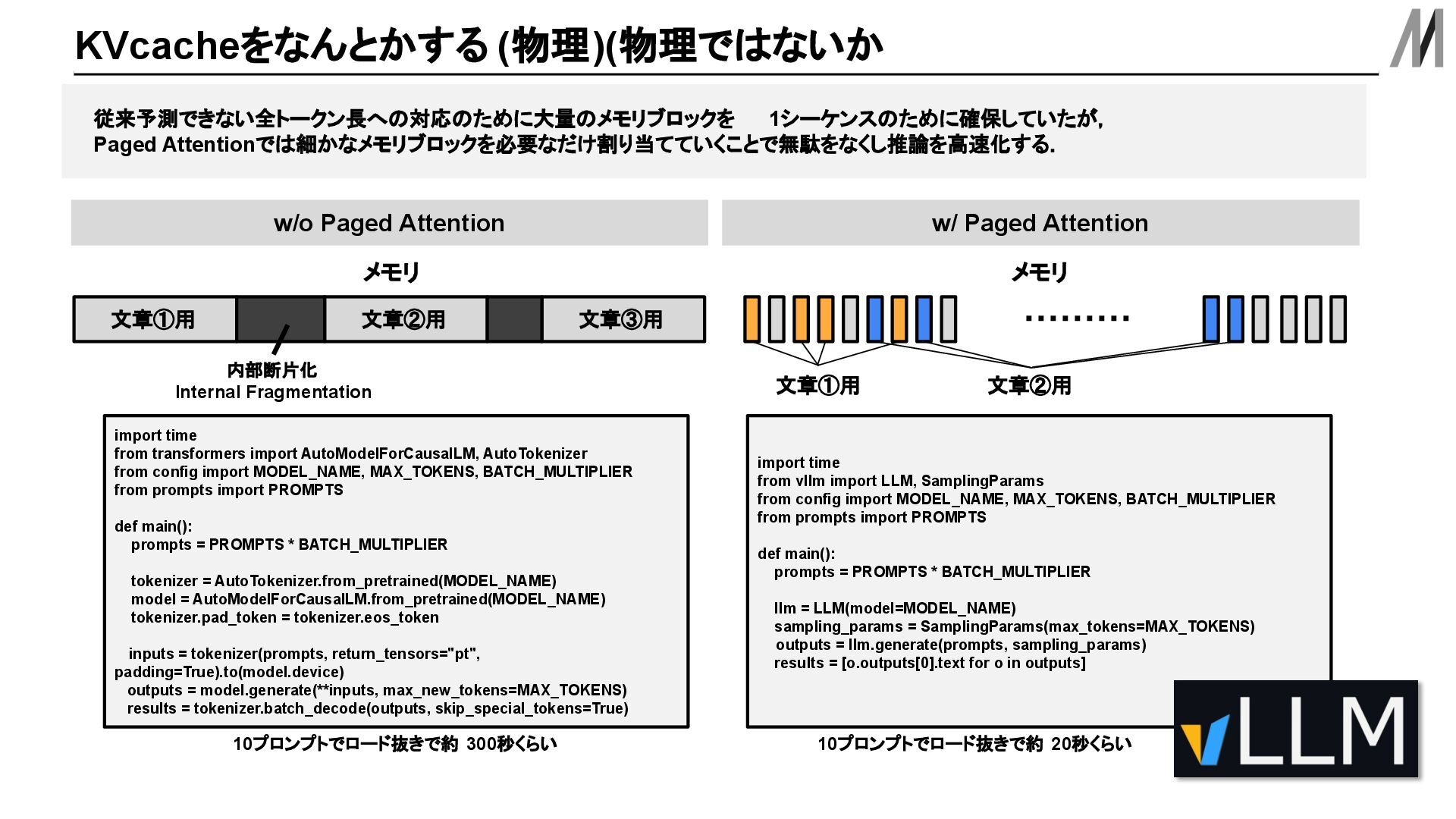 KVベクトルはキャッシュしておくことが一般的. KVcacheとは は X 2 春 X 1 曙 X 3 内積 +正規化 +加重和 Q 1,1 Q 1,2 Q 1,3 Q 2,1 Q 2,2 Q 2,3 Q 3,1 Q 3,2 Q 3,3 F query F1 query F1 query F key F key F1 key F query F1 query F1 value K 1,1 K 1,2 K 1,3 K 2,1 K 2,2 K 2,3 K 3,1 K 3,2 K 3,3 V 1,1 V 1,2 V 1,3 V 2,1 V 2,2 V 2,3 V 3,1 V 3,2 V 3,3 Q 3,1 K 1,1 TV 1,1 +Q 3,1 K 2,1 TV 2,1 +Q 3,1 K 3,1 T V 3,1 Q 3,2 K 1,2 TV 1,2 +Q 3,2 K 2,2 TV 2,2 +Q 3,2 K 3,2 T V 3,2 Q 3,3 K 1,3 TV 1,3 +Q 3,3 K 2,3 TV 2,3 +Q 3,3 K 3,3 T V 3,3 青色: Z 春 ベクトルを計算するときに既に計算している場所 赤色: Z は ベクトルを計算するときに既に計算している場所 Z 曙 ベクトルを計算するときに 以前計算しているところは 再度計算しなくていいように キャッシュしておく