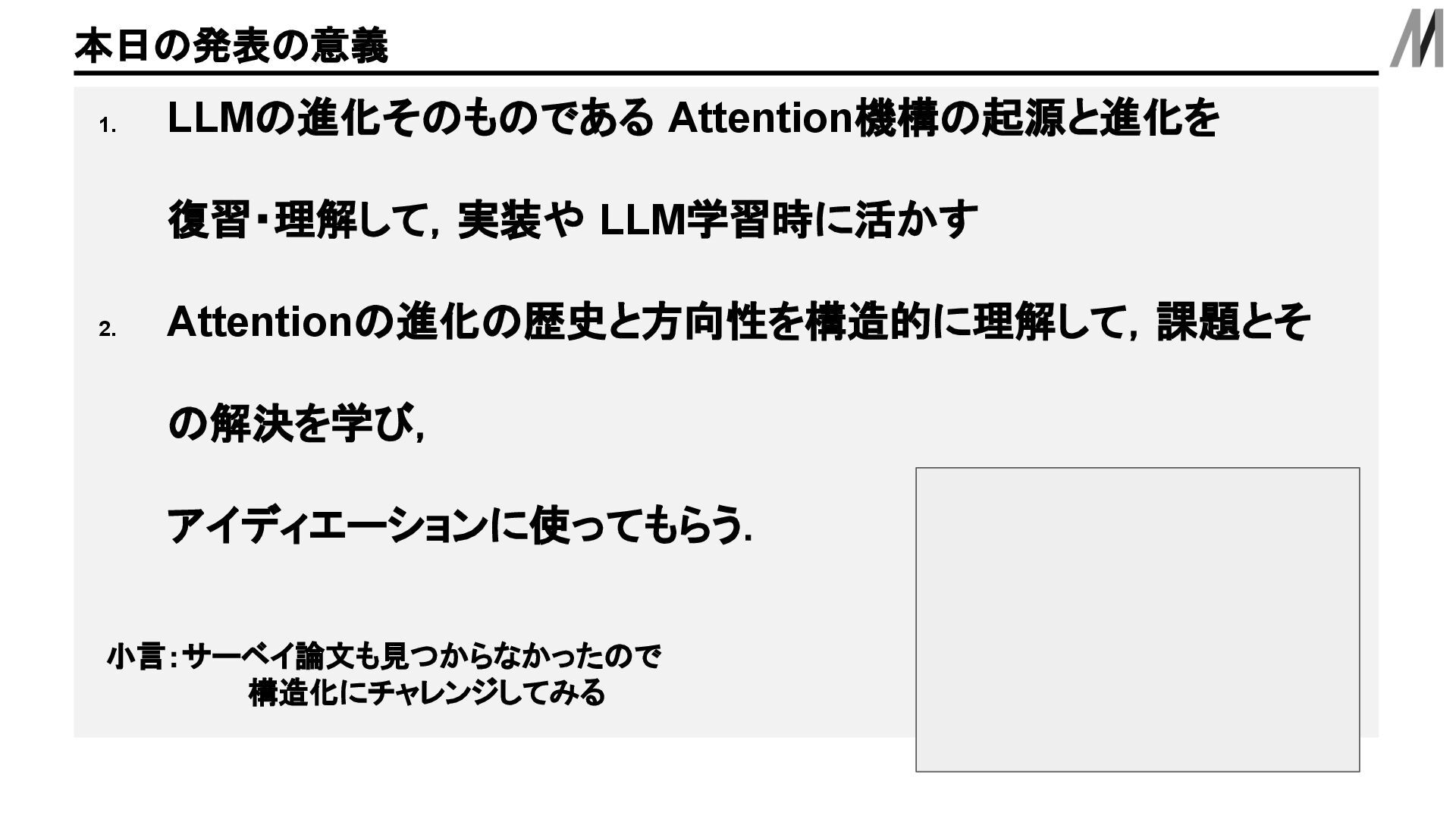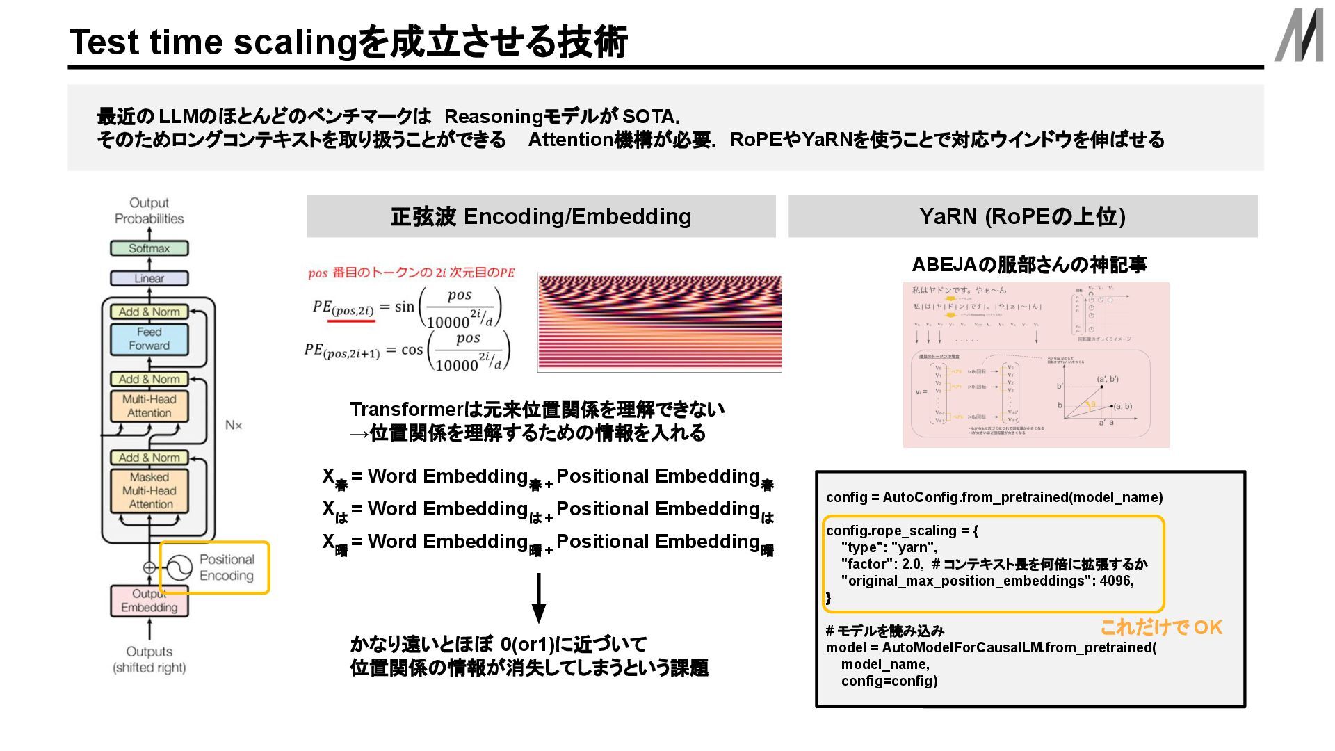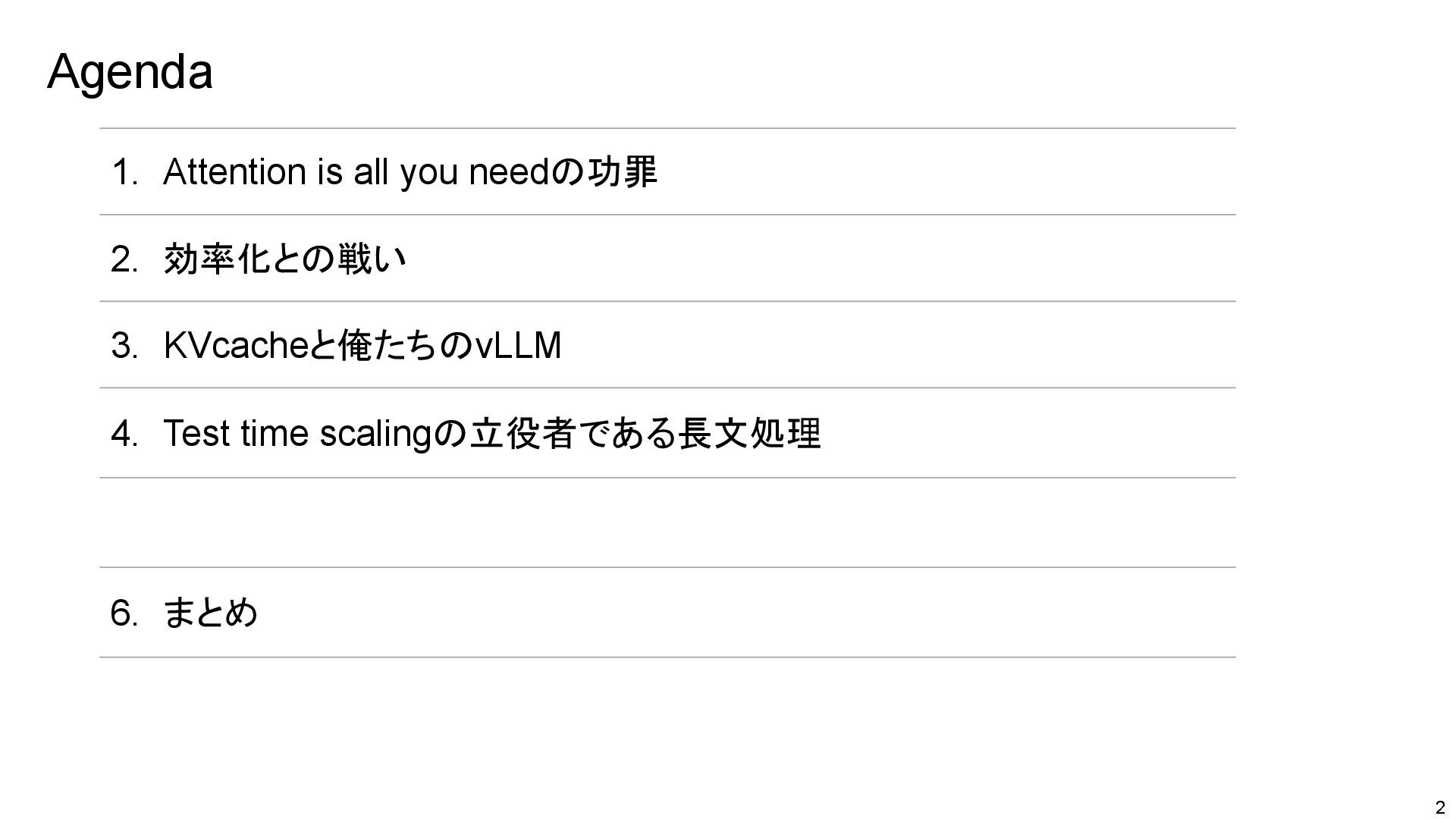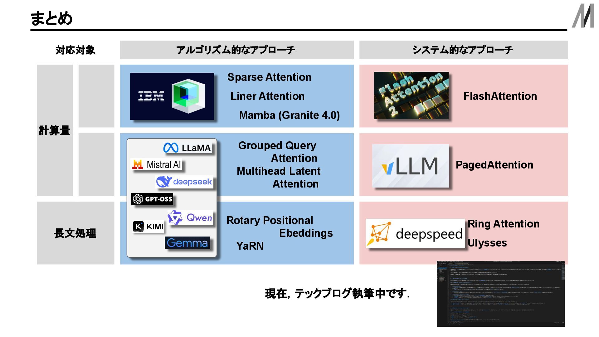 KVベクトルはキャッシュしておくことが一般的. KVcacheとは は X 2 春 X 1 曙 X 3 内積 +正規化 +加重和 Q 1,1 Q 1,2 Q 1,3 Q 2,1 Q 2,2 Q 2,3 Q 3,1 Q 3,2 Q 3,3 F query F1 query F1 query F key F key F1 key F query F1 query F1 value K 1,1 K 1,2 K 1,3 K 2,1 K 2,2 K 2,3 K 3,1 K 3,2 K 3,3 V 1,1 V 1,2 V 1,3 V 2,1 V 2,2 V 2,3 V 3,1 V 3,2 V 3,3 Q 3,1 K 1,1 TV 1,1 +Q 3,1 K 2,1 TV 2,1 +Q 3,1 K 3,1 T V 3,1 Q 3,2 K 1,2 TV 1,2 +Q 3,2 K 2,2 TV 2,2 +Q 3,2 K 3,2 T V 3,2 Q 3,3 K 1,3 TV 1,3 +Q 3,3 K 2,3 TV 2,3 +Q 3,3 K 3,3 T V 3,3 青色: Z 春 ベクトルを計算するときに既に計算している場所 赤色: Z は ベクトルを計算するときに既に計算している場所 Z 曙 ベクトルを計算するときに 以前計算しているところは 再度計算しなくていいように キャッシュしておく