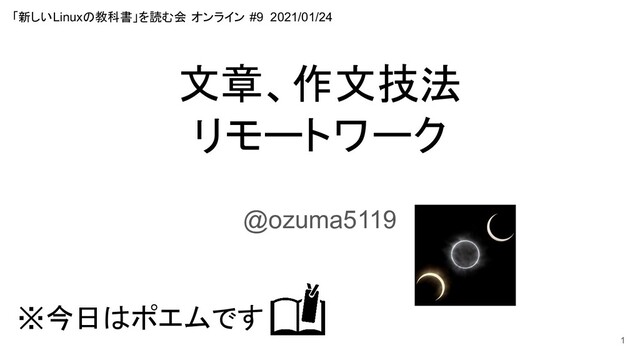 文章、作文技法 リモートワーク @ozuma5119 1 「新しいLinuxの教科書」を読む会 オンライン #9 2021/01/24 ※今日はポエムです