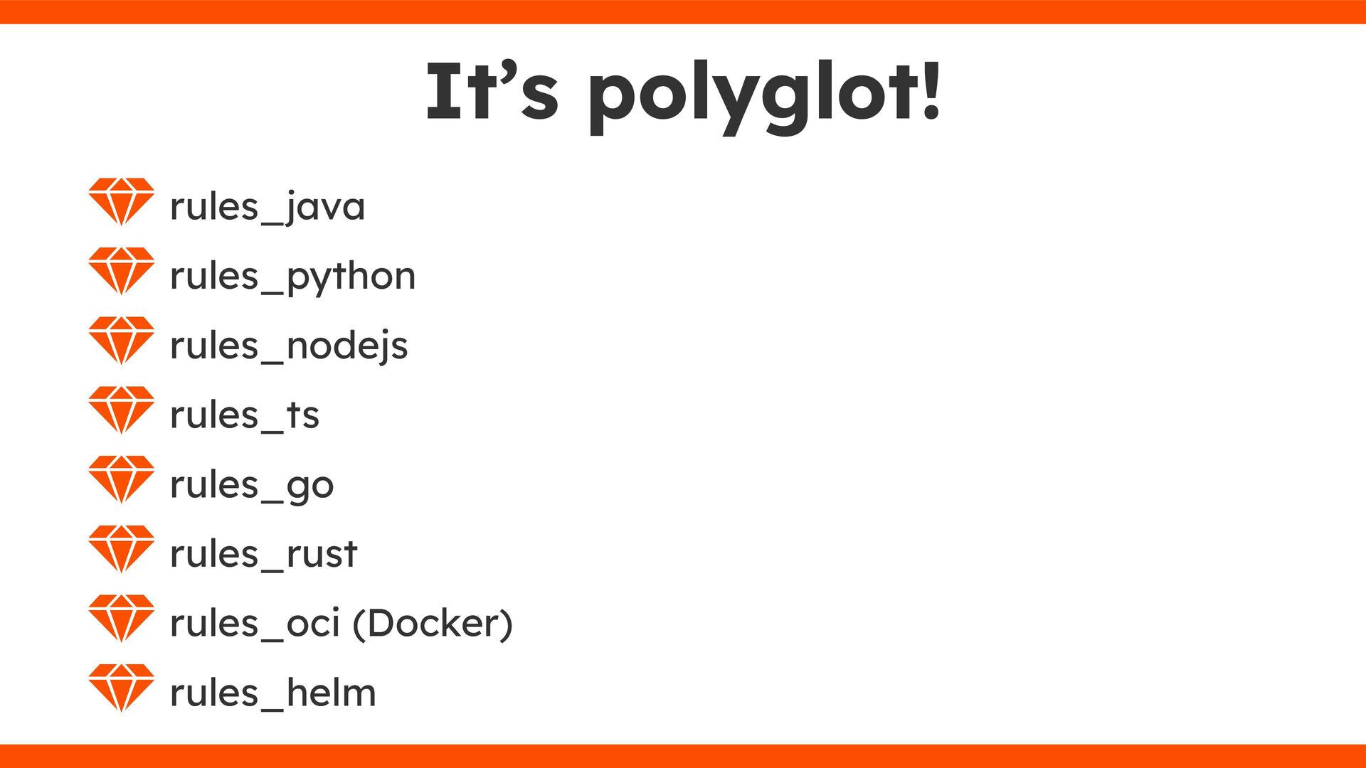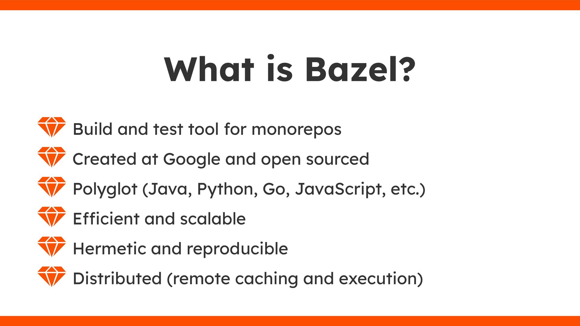 at Google and open sourced Polyglot (Java, Python, Go, JavaScript, etc.) E ffi cient and scalable Hermetic and reproducible Distributed (remote caching and execution)