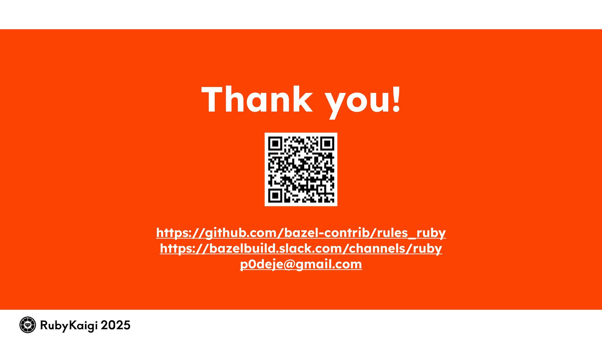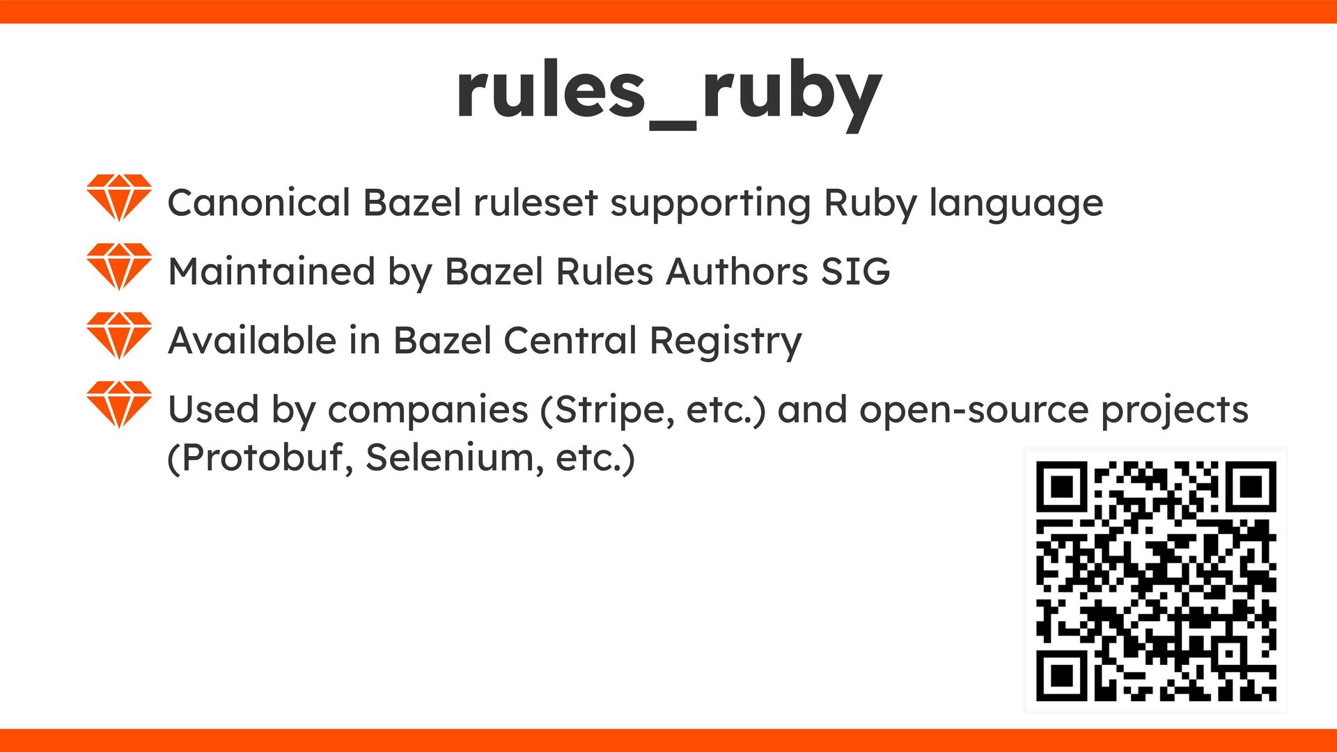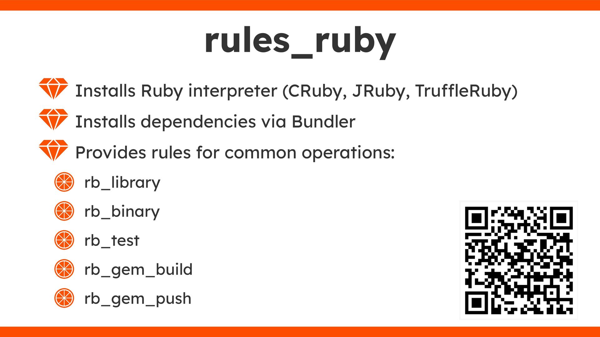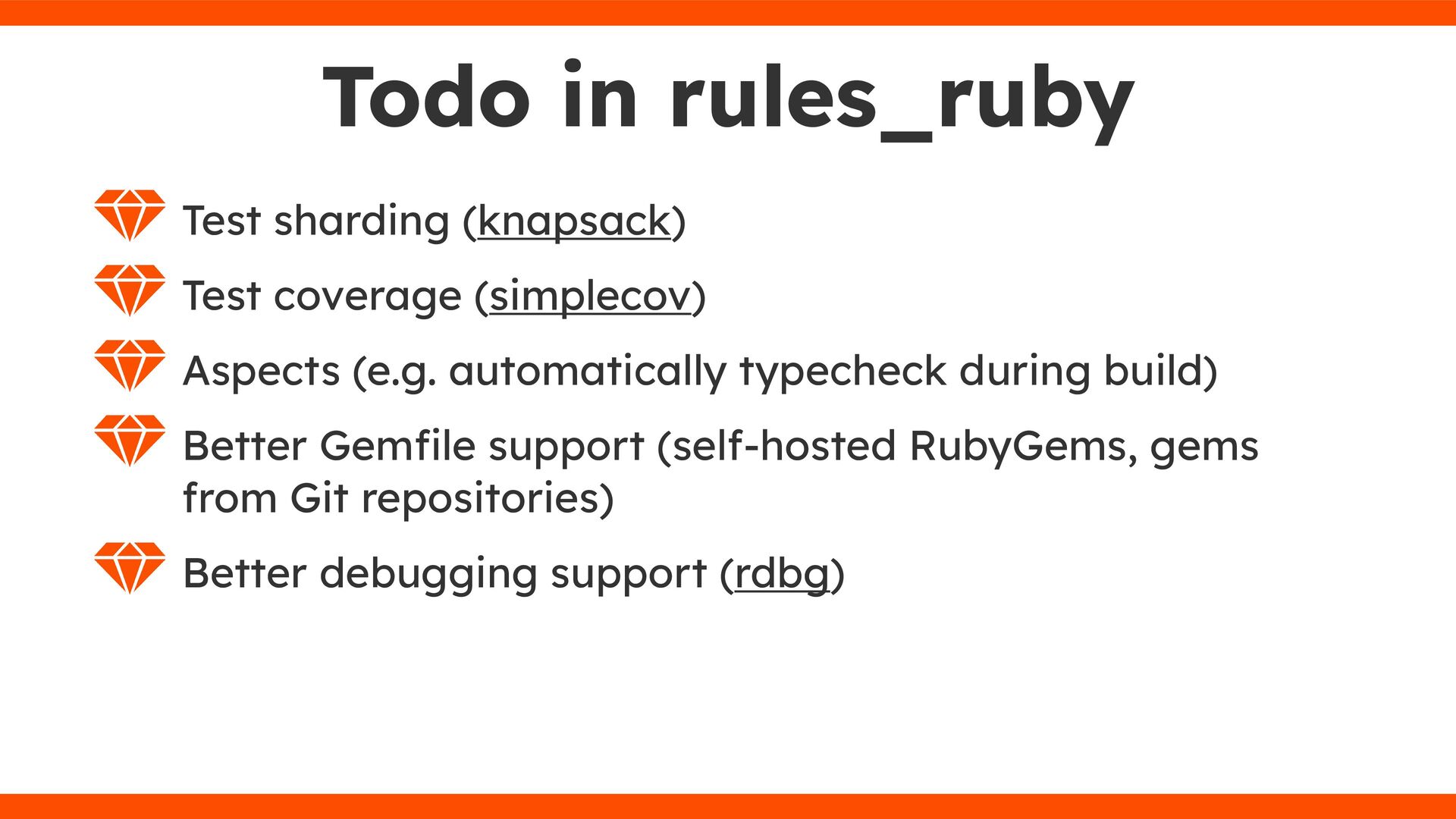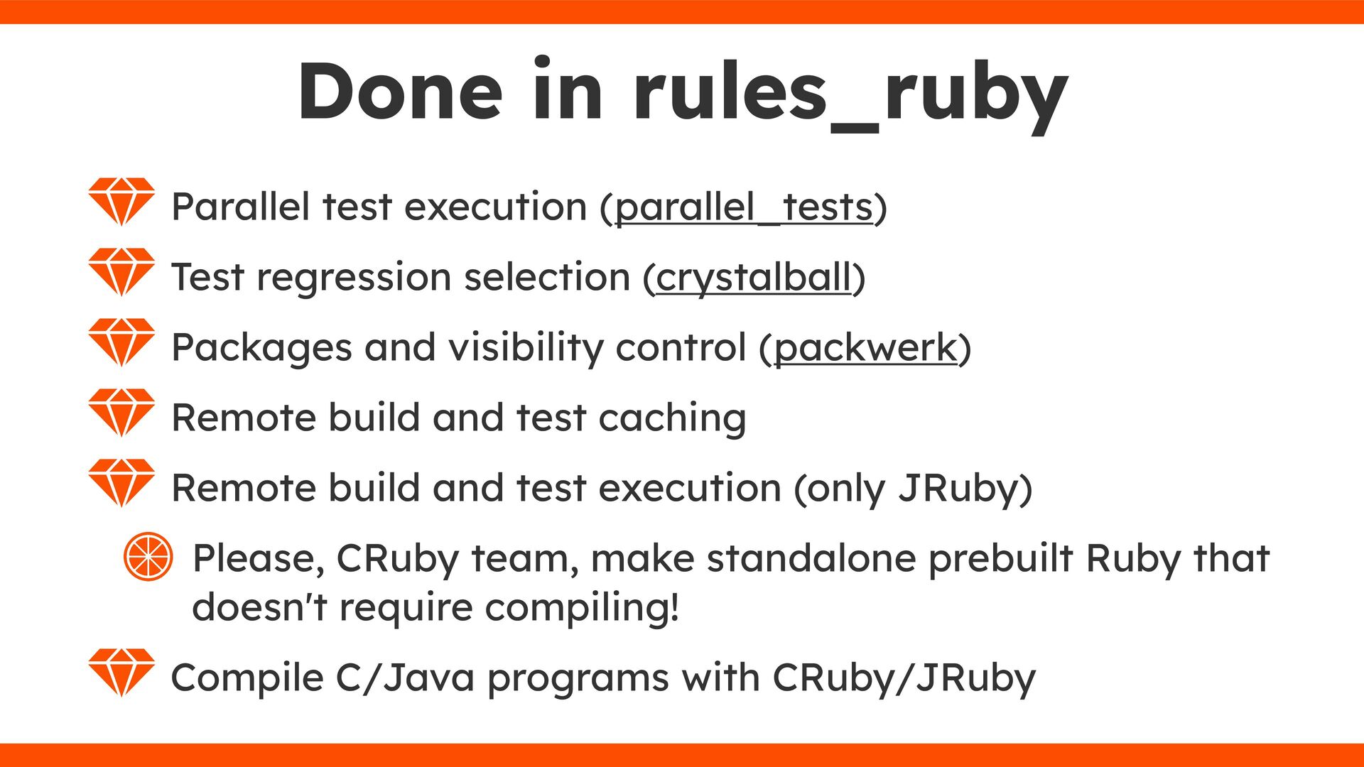 visibility control (packwerk) Remote build and test caching Remote build and test execution (only JRuby) Please, CRuby team, make standalone prebuilt Ruby that doesn't require compiling! Compile C/Java programs with CRuby/JRuby Done in rules_ruby