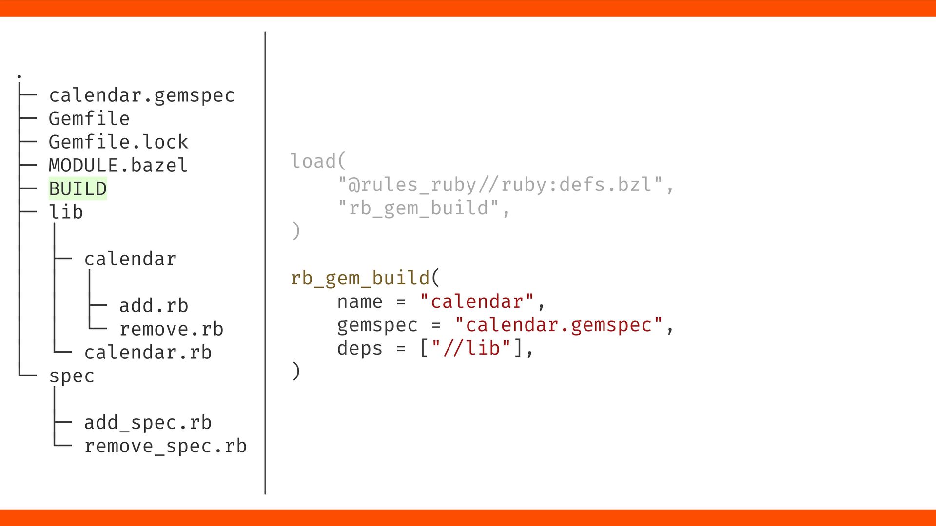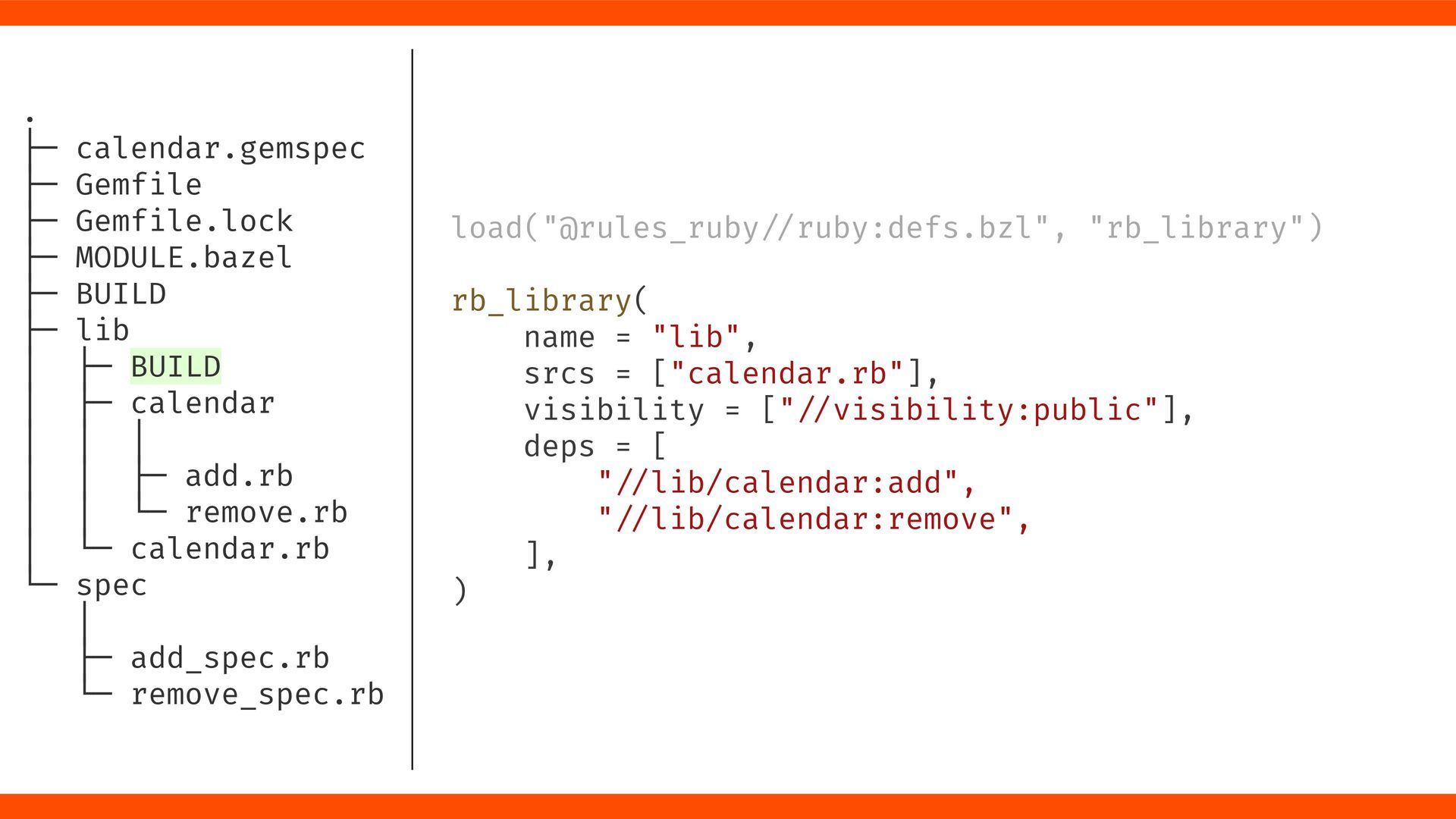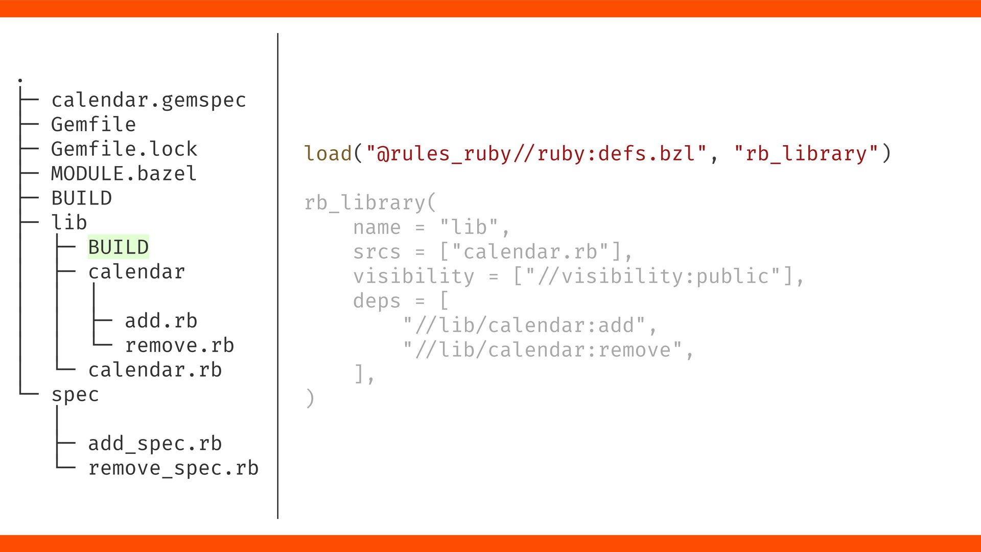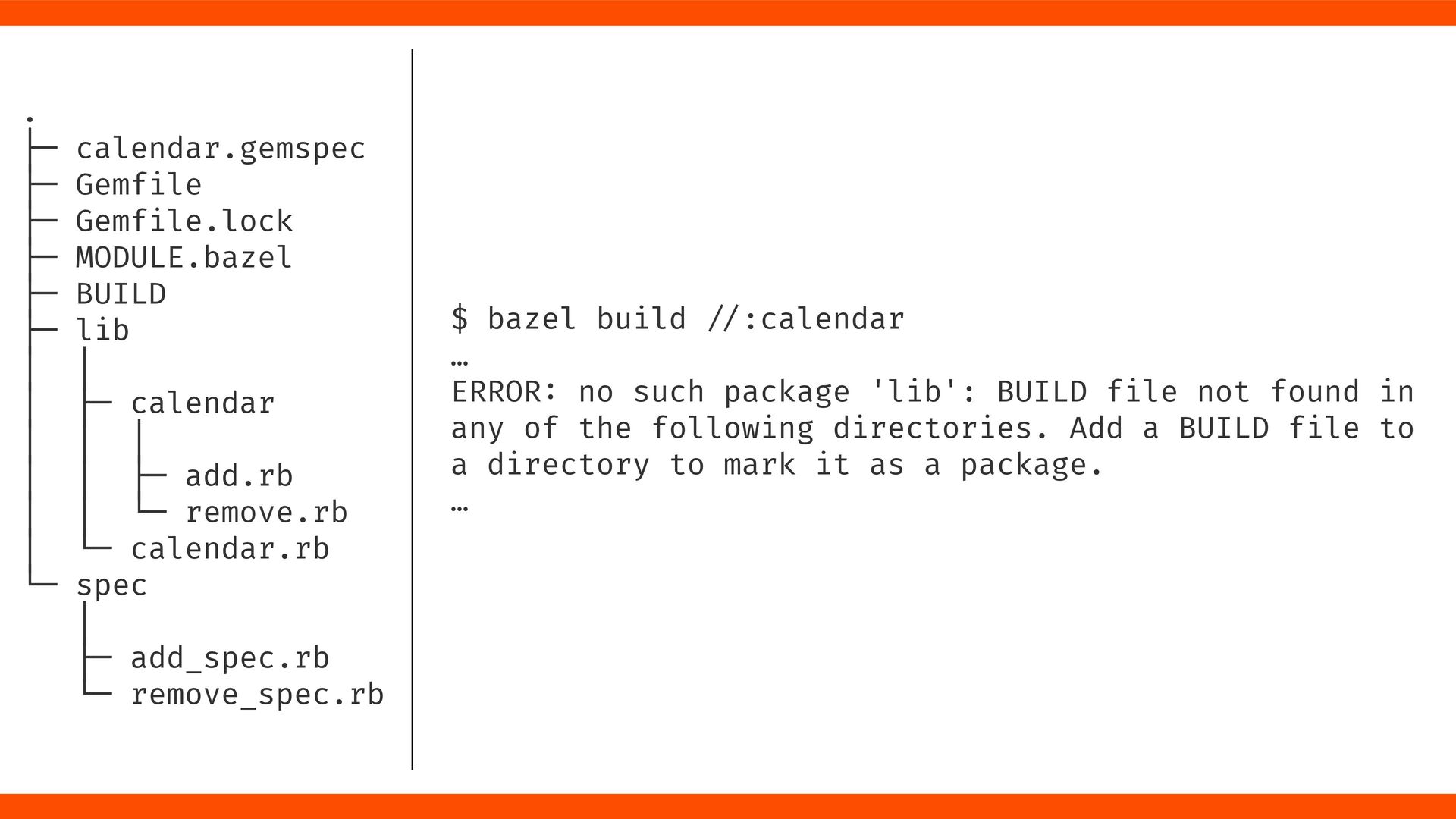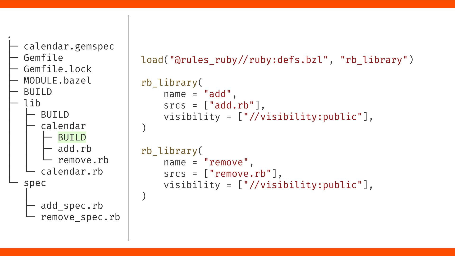 package 'lib': BUILD file not found in any of the following directories. Add a BUILD file to a directory to mark it as a package. … . ├─ calendar.gemspec ├─ Gemfile ├─ Gemfile.lock ├─ MODULE.bazel ├─ BUILD ├─ lib │ │ │ ├─ calendar │ │ │ │ │ ├─ add.rb │ │ └─ remove.rb │ └─ calendar.rb └─ spec │ ├─ add_spec.rb └─ remove_spec.rb