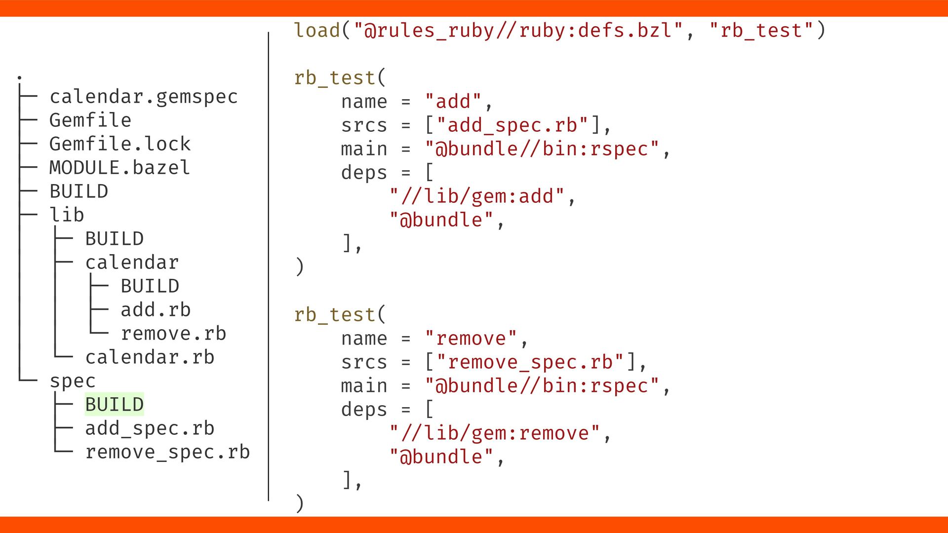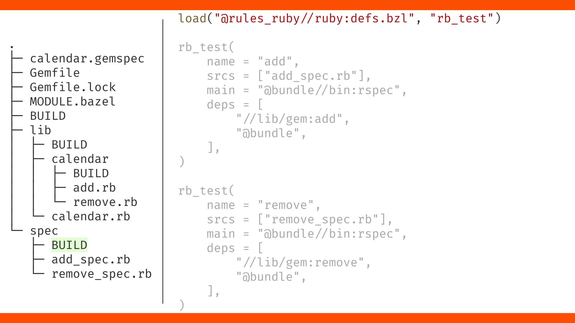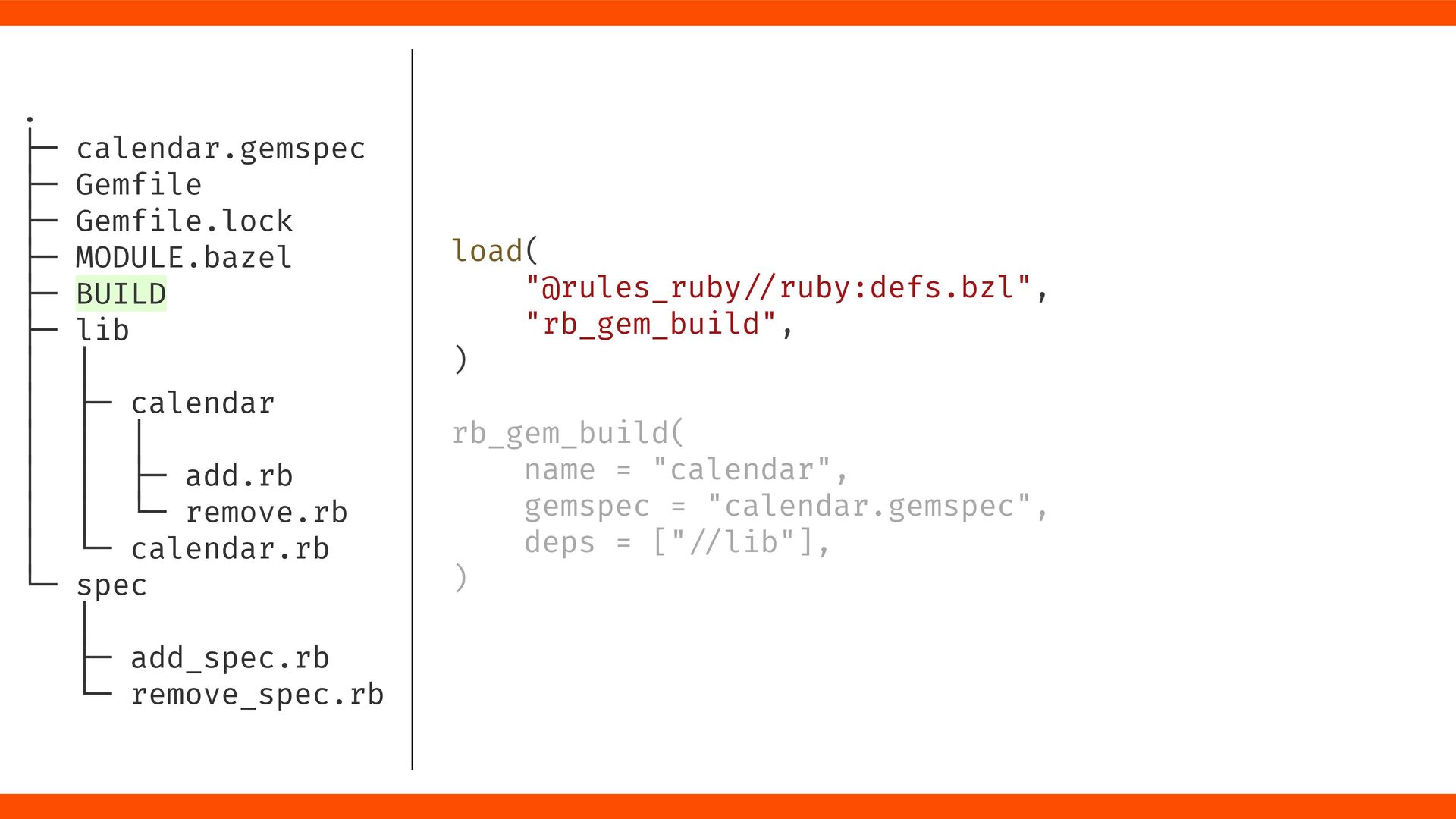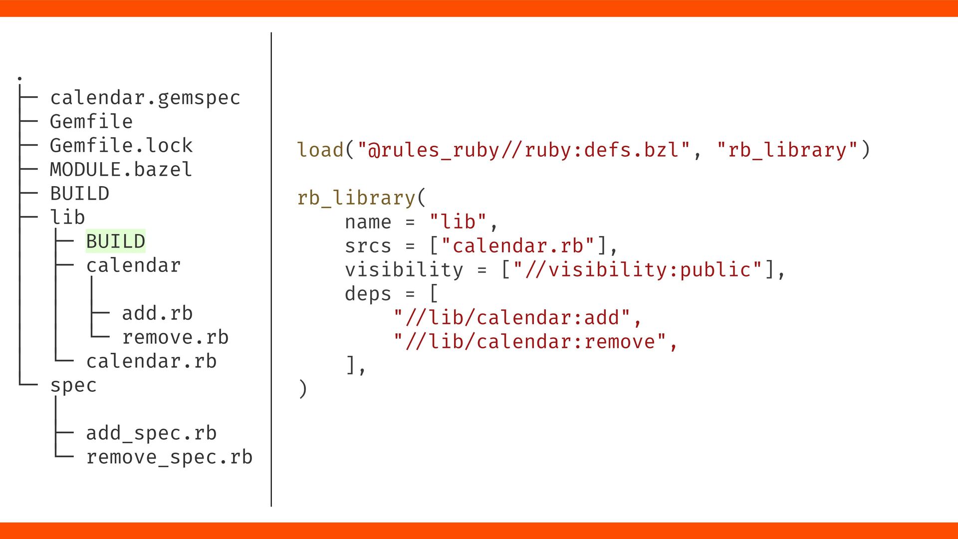 package 'lib': BUILD file not found in any of the following directories. Add a BUILD file to a directory to mark it as a package. … . ├─ calendar.gemspec ├─ Gemfile ├─ Gemfile.lock ├─ MODULE.bazel ├─ BUILD ├─ lib │ │ │ ├─ calendar │ │ │ │ │ ├─ add.rb │ │ └─ remove.rb │ └─ calendar.rb └─ spec │ ├─ add_spec.rb └─ remove_spec.rb