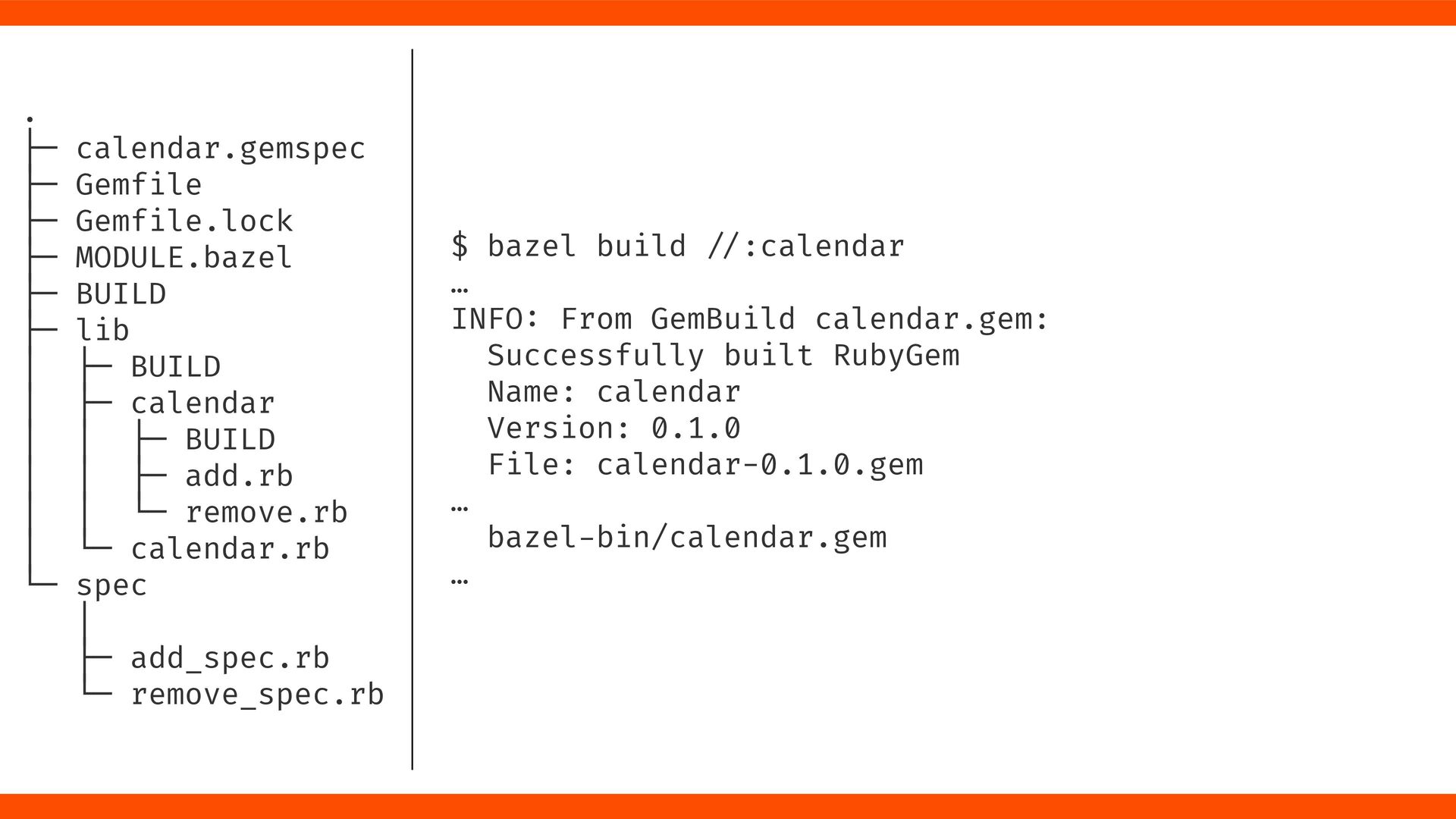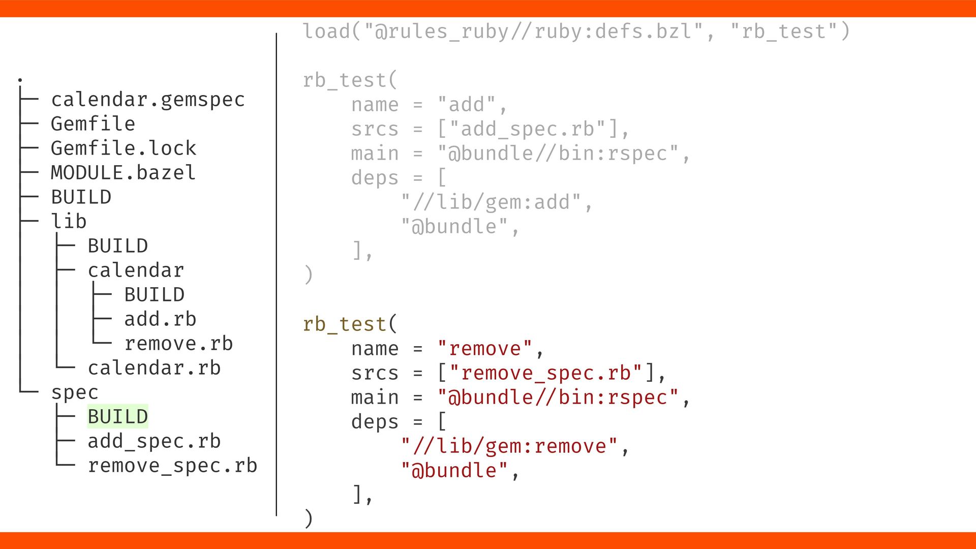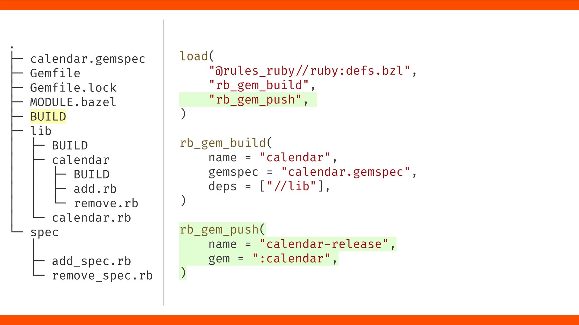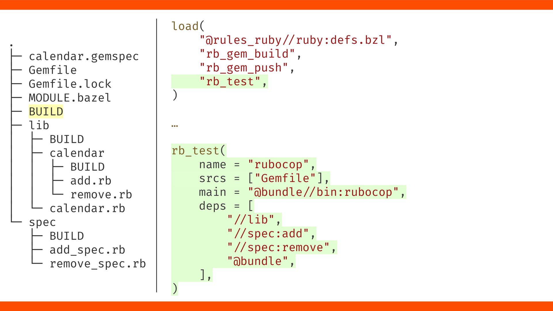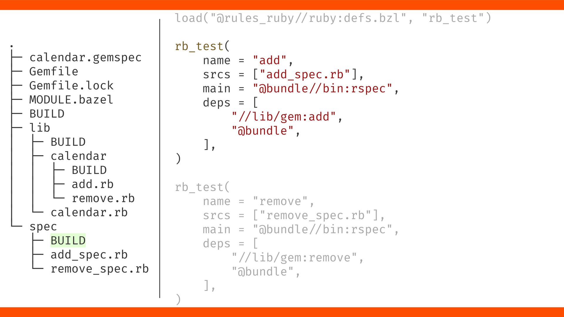 package 'lib': BUILD file not found in any of the following directories. Add a BUILD file to a directory to mark it as a package. … . ├─ calendar.gemspec ├─ Gemfile ├─ Gemfile.lock ├─ MODULE.bazel ├─ BUILD ├─ lib │ │ │ ├─ calendar │ │ │ │ │ ├─ add.rb │ │ └─ remove.rb │ └─ calendar.rb └─ spec │ ├─ add_spec.rb └─ remove_spec.rb