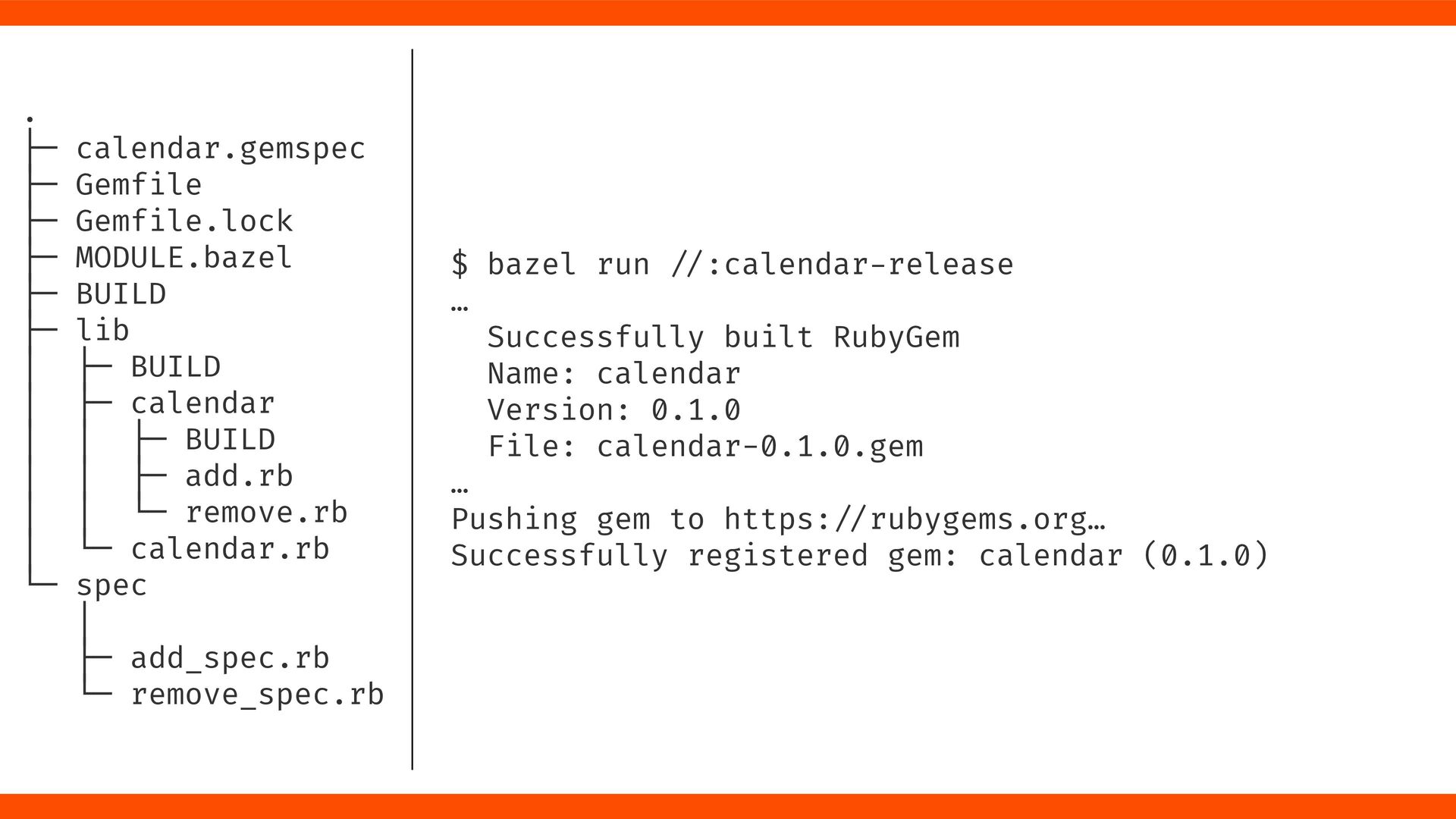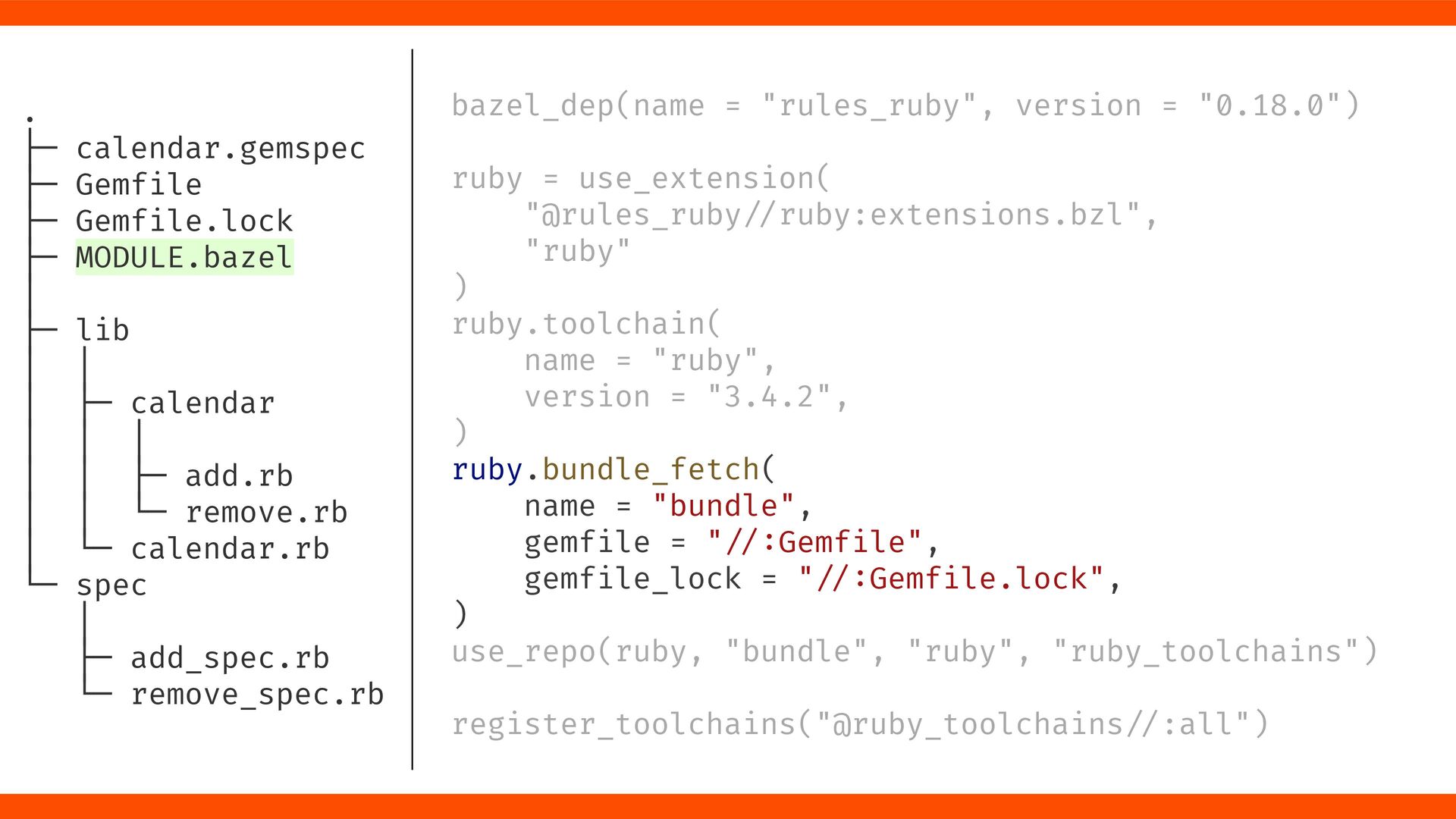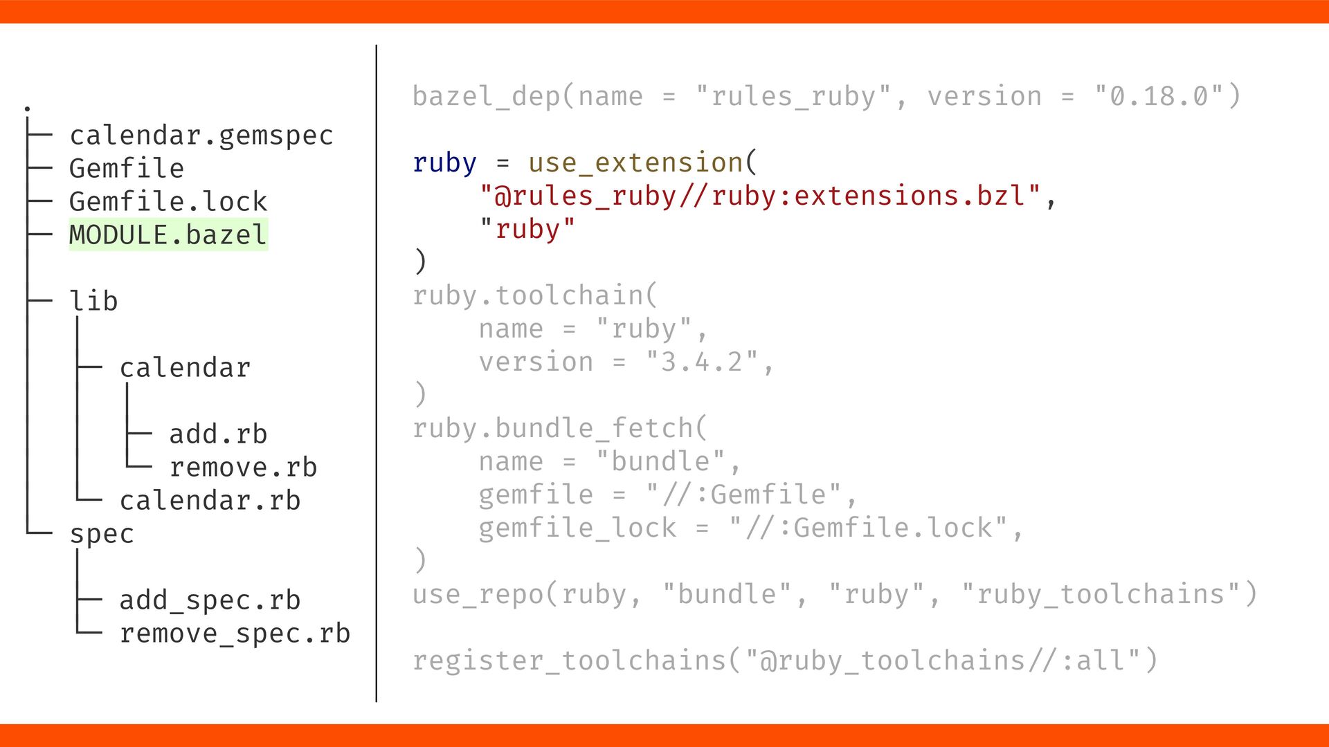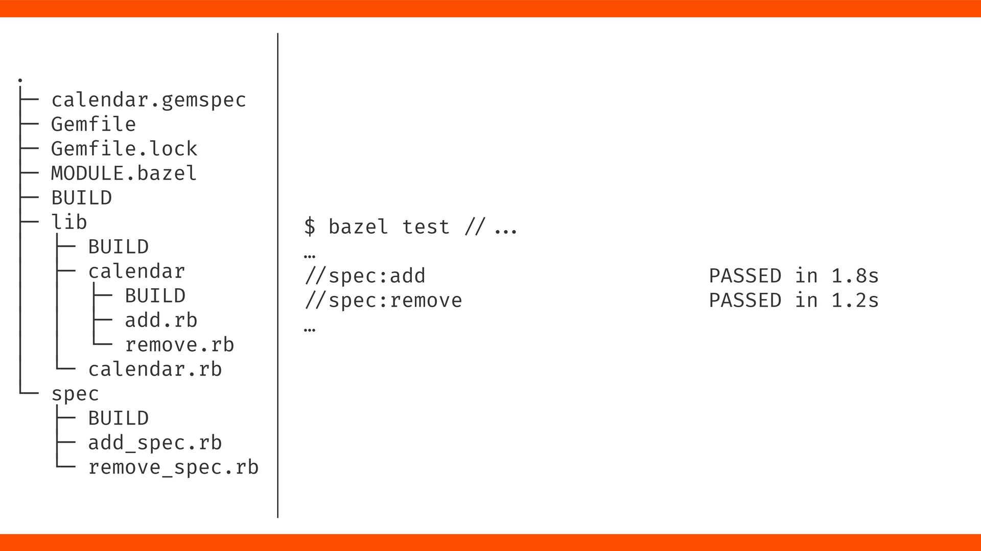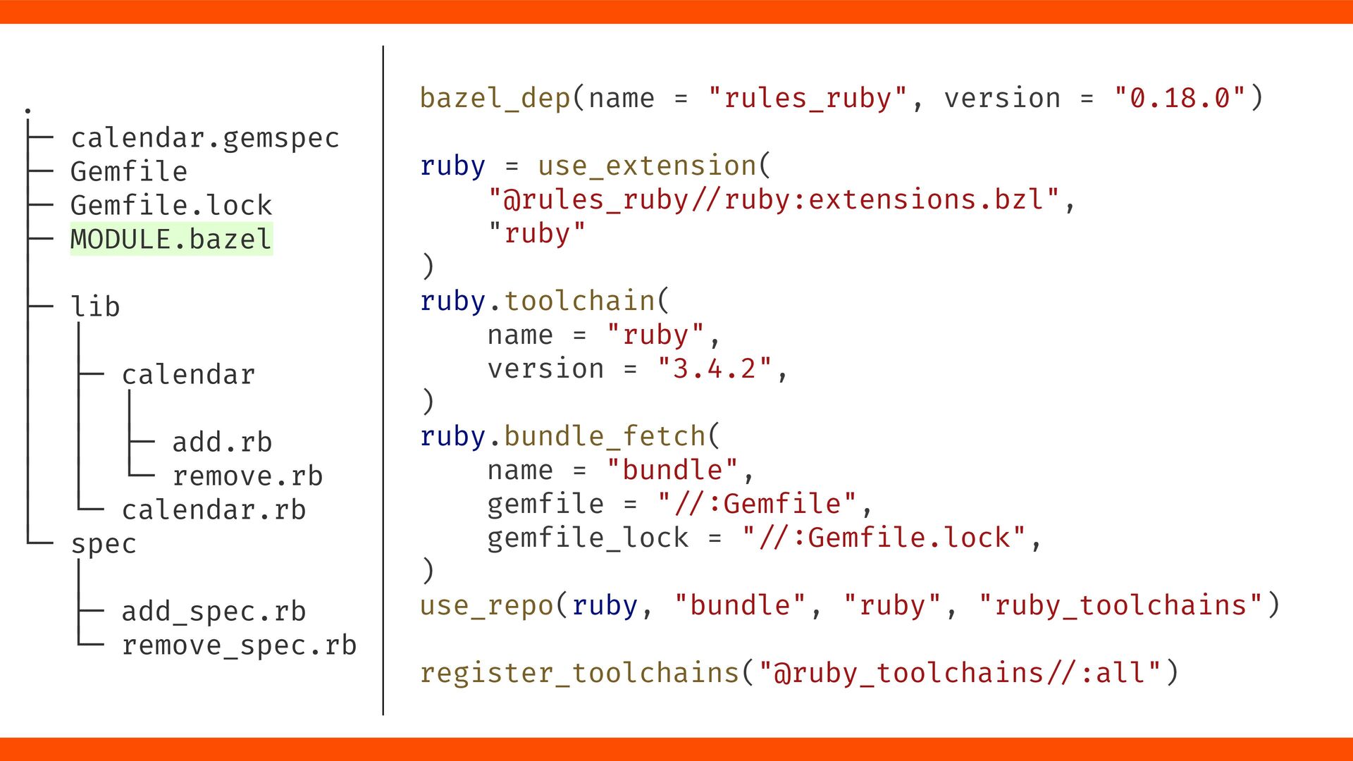 package 'lib': BUILD file not found in any of the following directories. Add a BUILD file to a directory to mark it as a package. … . ├─ calendar.gemspec ├─ Gemfile ├─ Gemfile.lock ├─ MODULE.bazel ├─ BUILD ├─ lib │ │ │ ├─ calendar │ │ │ │ │ ├─ add.rb │ │ └─ remove.rb │ └─ calendar.rb └─ spec │ ├─ add_spec.rb └─ remove_spec.rb