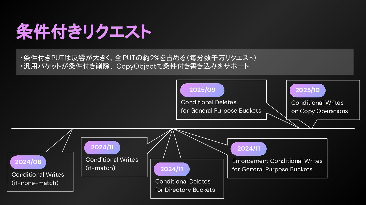 Enforcement Conditional Writes for General Purpose Buckets 2024/11 Conditional Deletes for Directory Buckets ・条件付きPUTは反響が大きく、全PUTの約2%を占める(毎分数千万リクエスト) ・汎用バケットが条件付き削除、 CopyObjectで条件付き書き込みをサポート 2025/10 Conditional Writes on Copy Operations 2025/09 Conditional Deletes for General Purpose Buckets