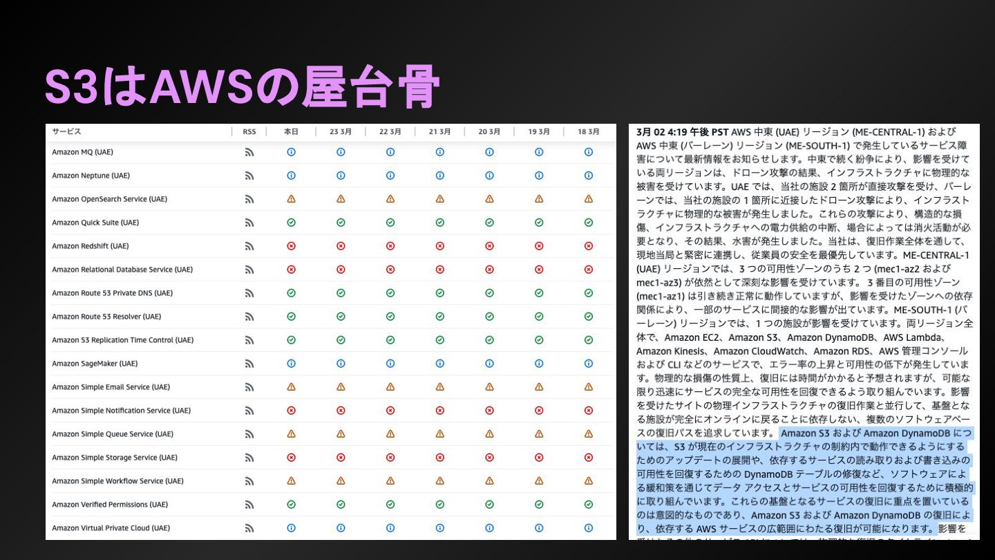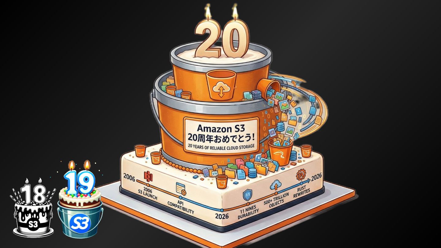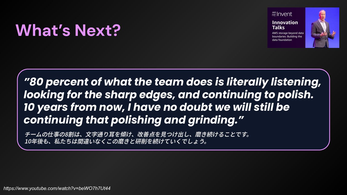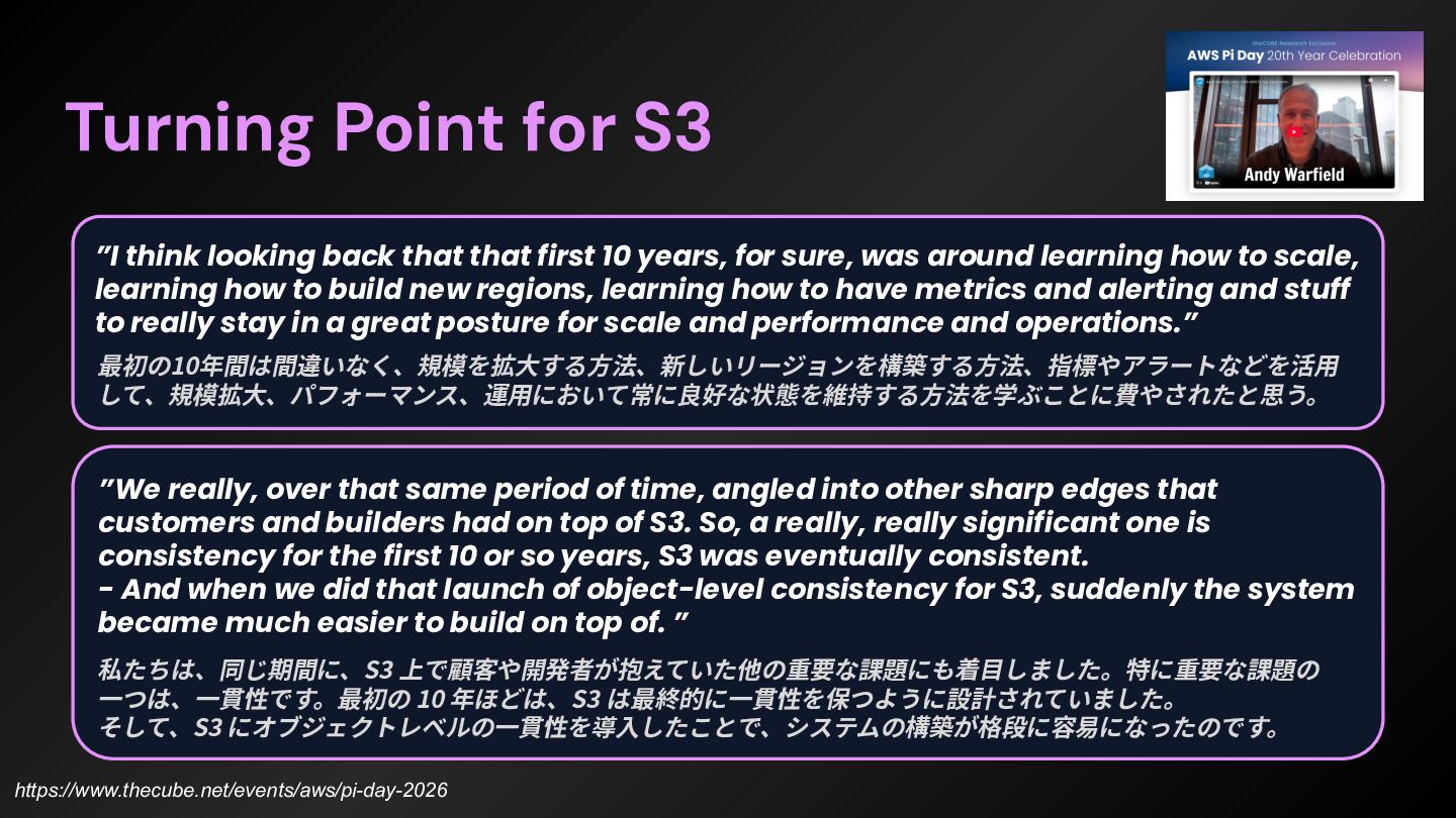 first 10 years, for sure, was around learning how to scale, learning how to build new regions, learning how to have metrics and alerting and stuff to really stay in a great posture for scale and performance and operations.” 最初の10年間は間違いなく、規模を拡⼤する⽅法、新しいリージョンを構築する⽅法、指標やアラートなどを活⽤ して、規模拡⼤、パフォーマンス、運⽤において常に良好な状態を維持する⽅法を学ぶことに費やされたと思う。 https://www.thecube.net/events/aws/pi-day-2026 ”We really, over that same period of time, angled into other sharp edges that customers and builders had on top of S3. So, a really, really significant one is consistency for the first 10 or so years, S3 was eventually consistent. - And when we did that launch of object-level consistency for S3, suddenly the system became much easier to build on top of. ” 私たちは、同じ期間に、S3 上で顧客や開発者が抱えていた他の重要な課題にも着⽬しました。特に重要な課題の ⼀つは、⼀貫性です。最初の 10 年ほどは、S3 は最終的に⼀貫性を保つように設計されていました。 そして、S3 にオブジェクトレベルの⼀貫性を導⼊したことで、システムの構築が格段に容易になったのです。
