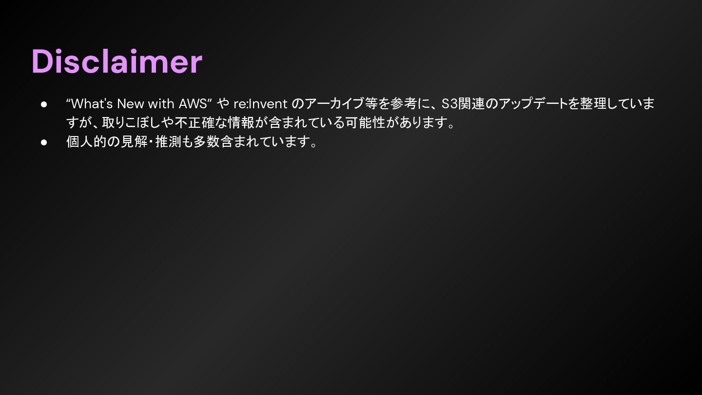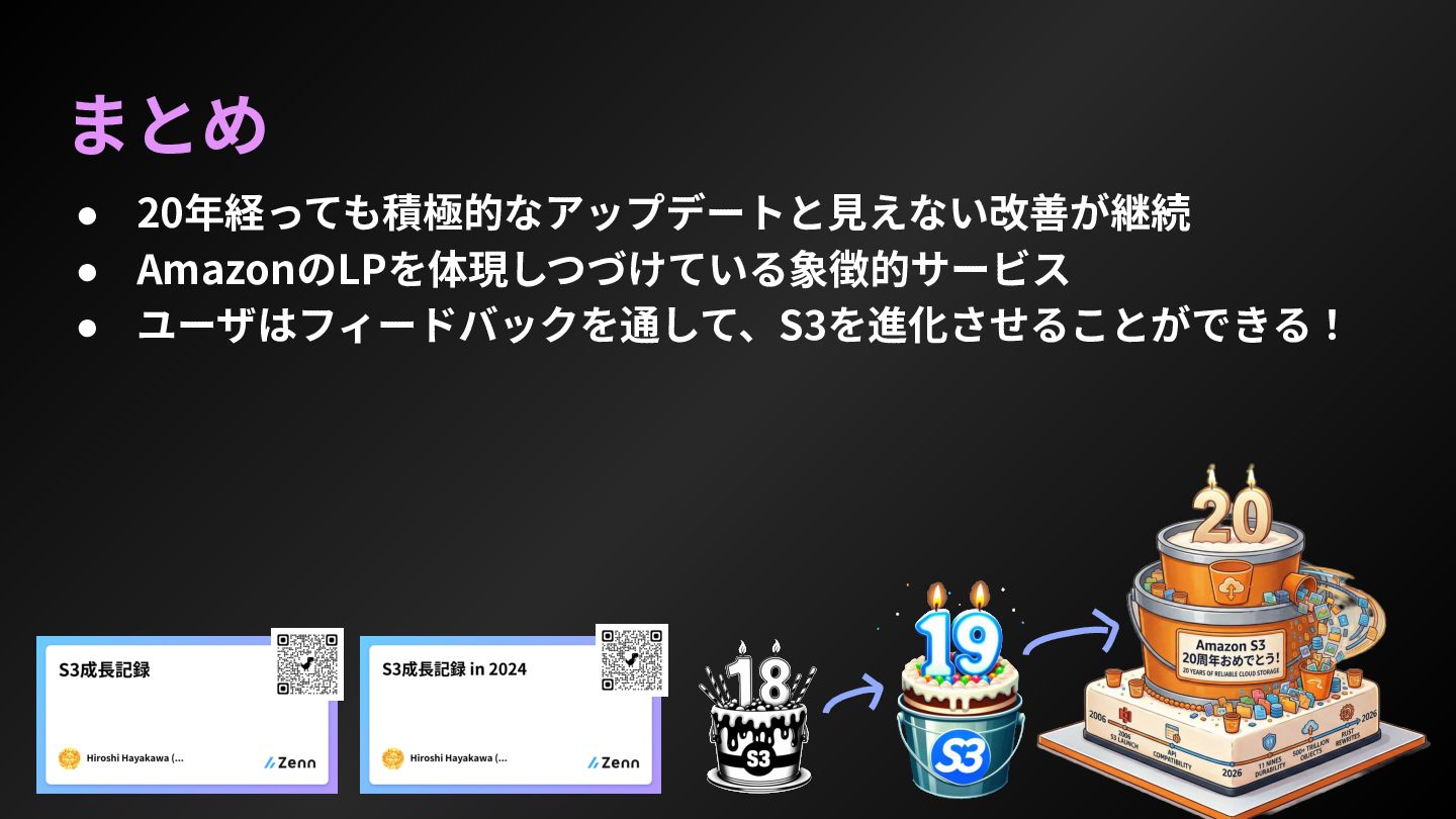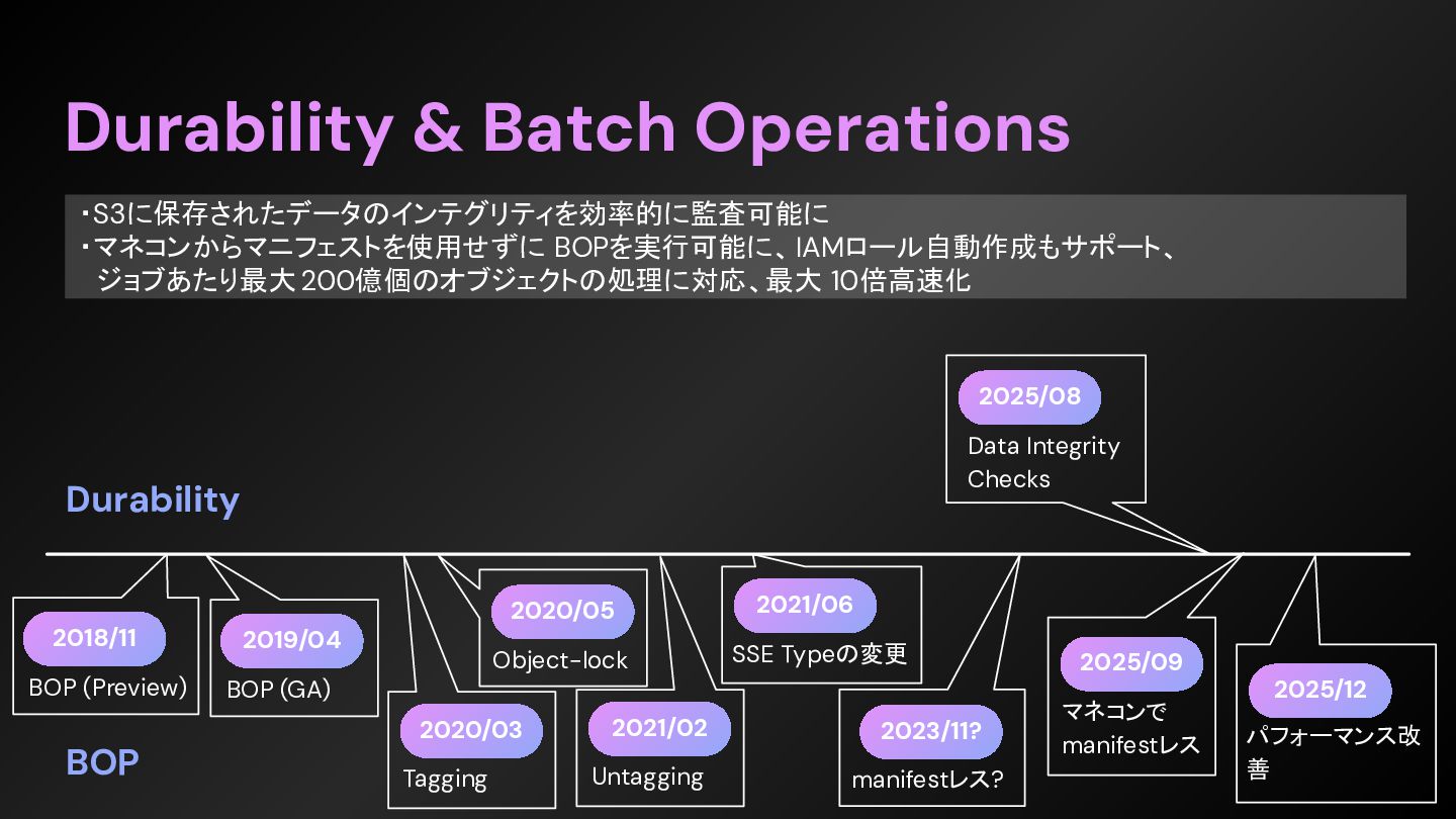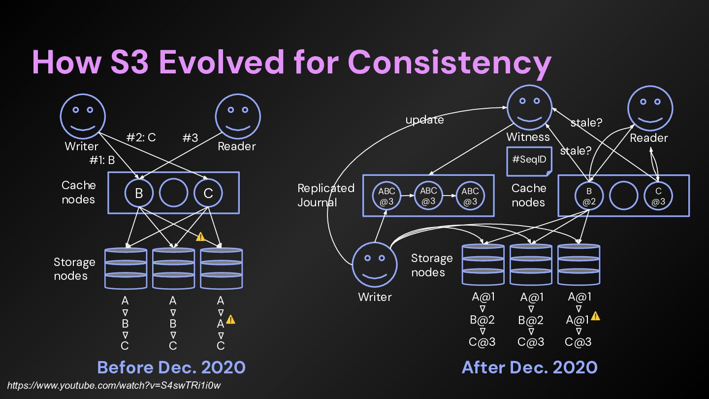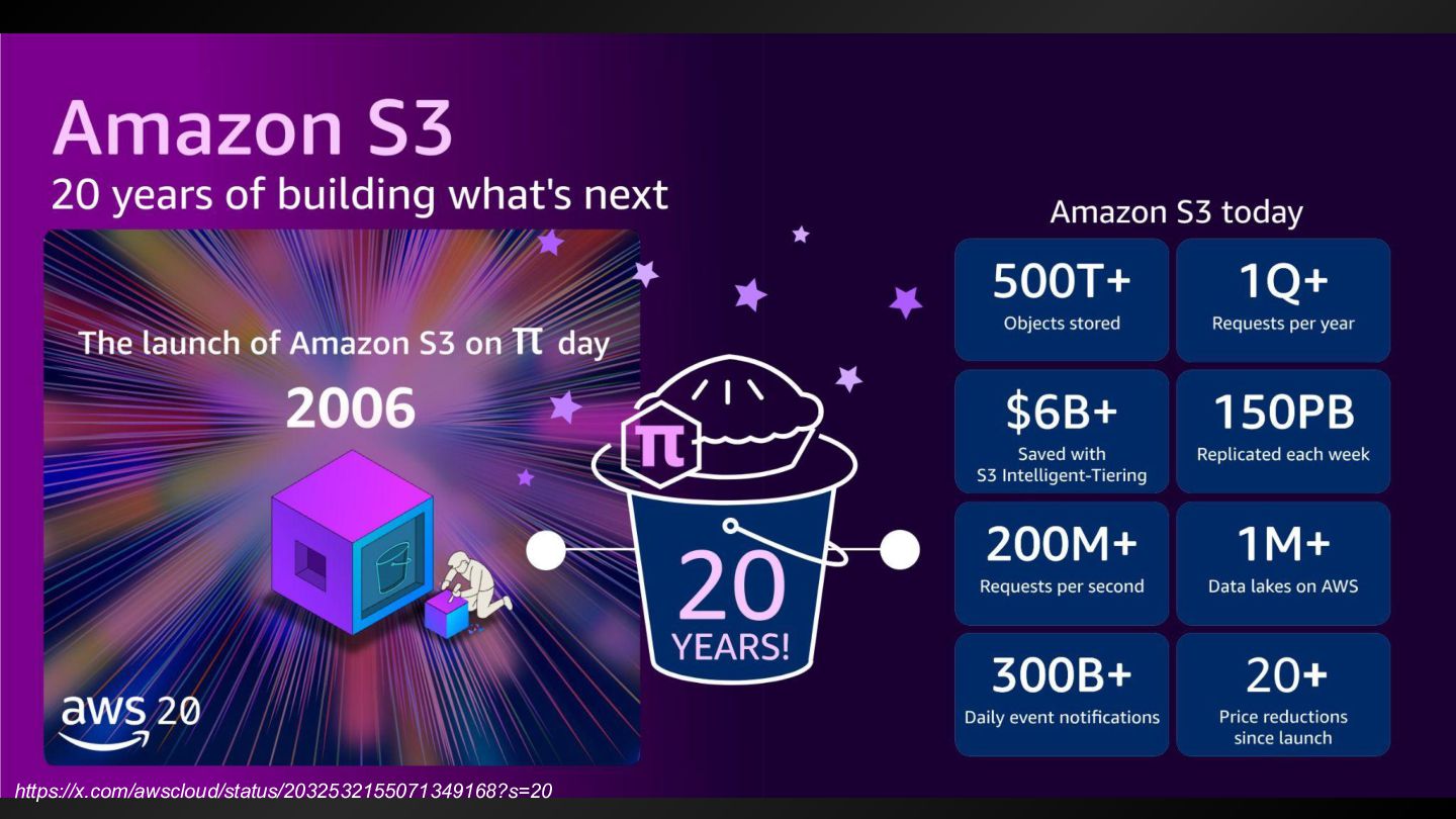 first 10 years, for sure, was around learning how to scale, learning how to build new regions, learning how to have metrics and alerting and stuff to really stay in a great posture for scale and performance and operations.” 最初の10年間は間違いなく、規模を拡⼤する⽅法、新しいリージョンを構築する⽅法、指標やアラートなどを活⽤ して、規模拡⼤、パフォーマンス、運⽤において常に良好な状態を維持する⽅法を学ぶことに費やされたと思う。 https://www.thecube.net/events/aws/pi-day-2026 ”We really, over that same period of time, angled into other sharp edges that customers and builders had on top of S3. So, a really, really significant one is consistency for the first 10 or so years, S3 was eventually consistent. - And when we did that launch of object-level consistency for S3, suddenly the system became much easier to build on top of. ” 私たちは、同じ期間に、S3 上で顧客や開発者が抱えていた他の重要な課題にも着⽬しました。特に重要な課題の ⼀つは、⼀貫性です。最初の 10 年ほどは、S3 は最終的に⼀貫性を保つように設計されていました。 そして、S3 にオブジェクトレベルの⼀貫性を導⼊したことで、システムの構築が格段に容易になったのです。