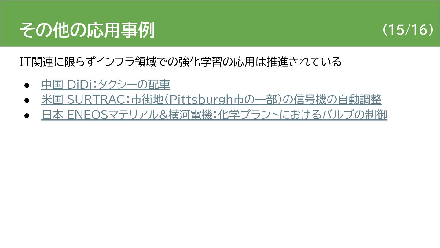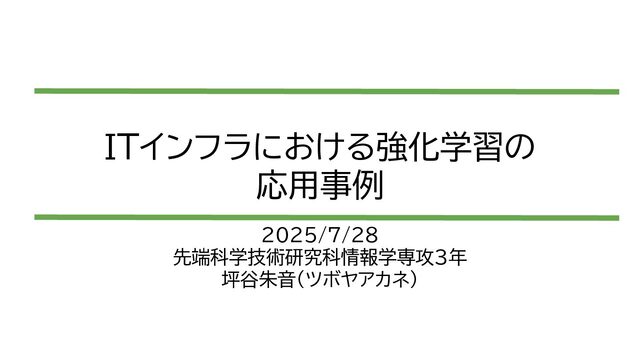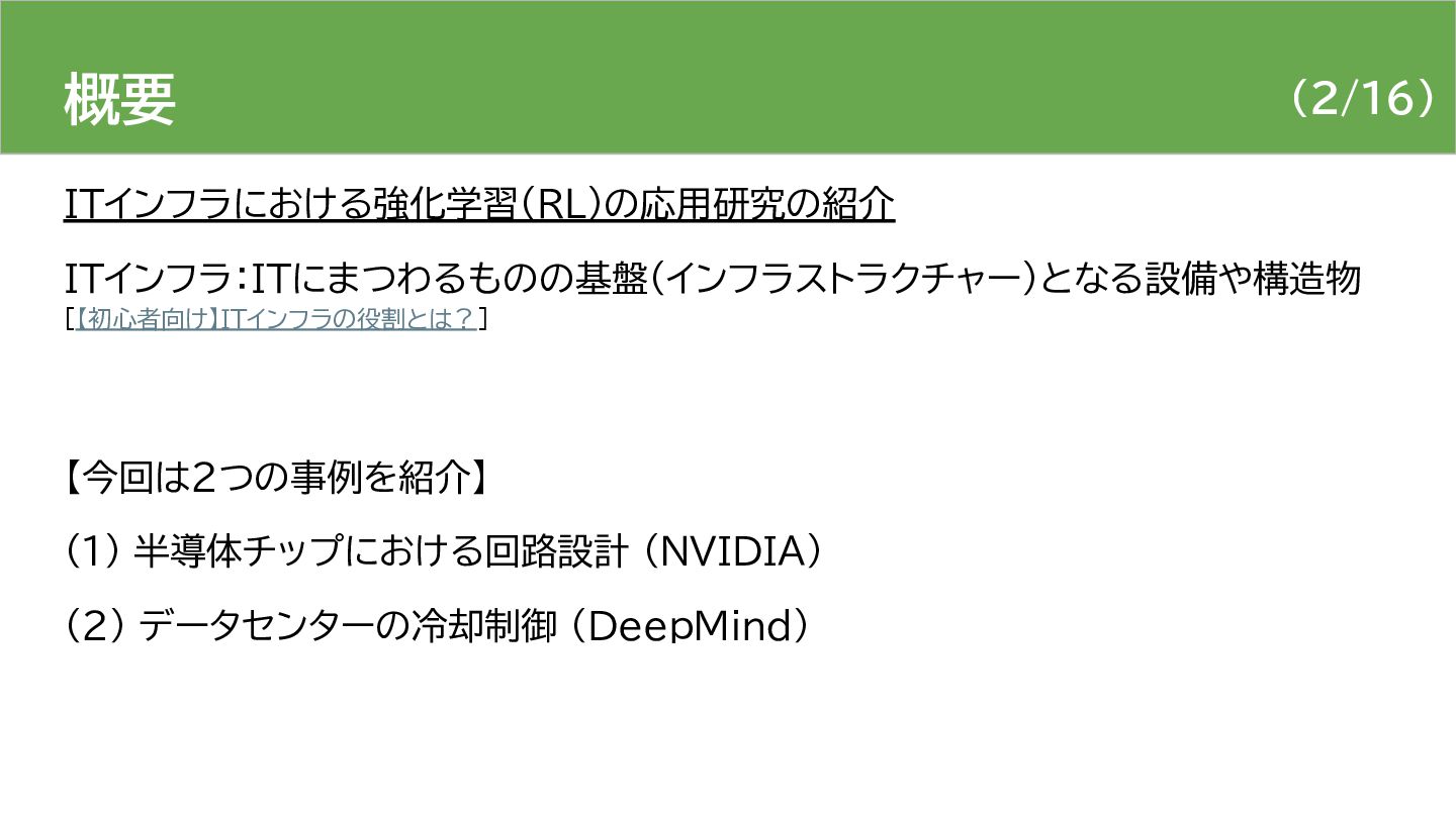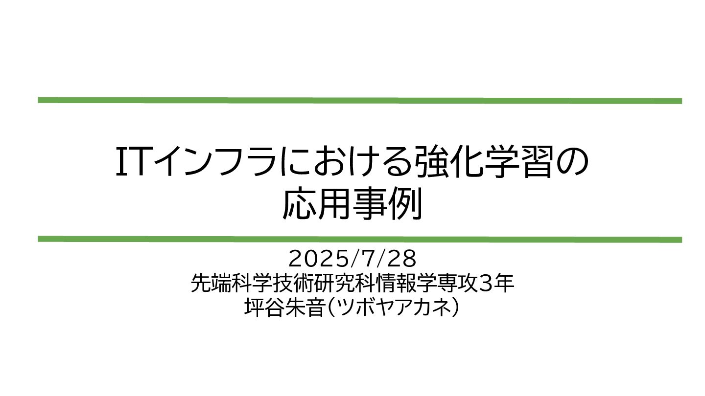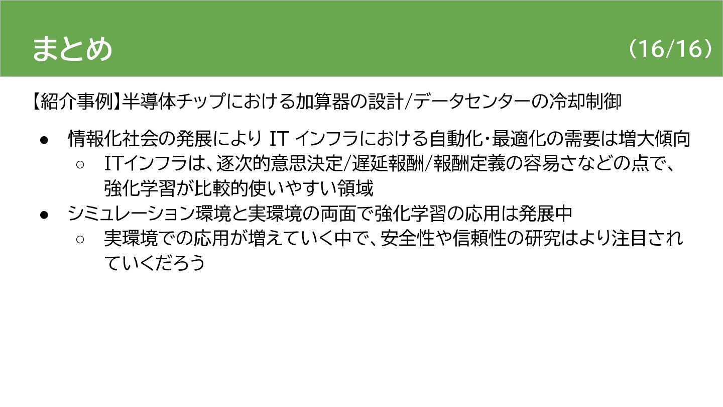 深層強化学習の応用範囲は、ゲームAIなどのシミュレーション環境に留まらず、実環境にも広まりつつあります。本スライドでは、その中でも IT インフラ領域における応用事例をいくつか紹介します。