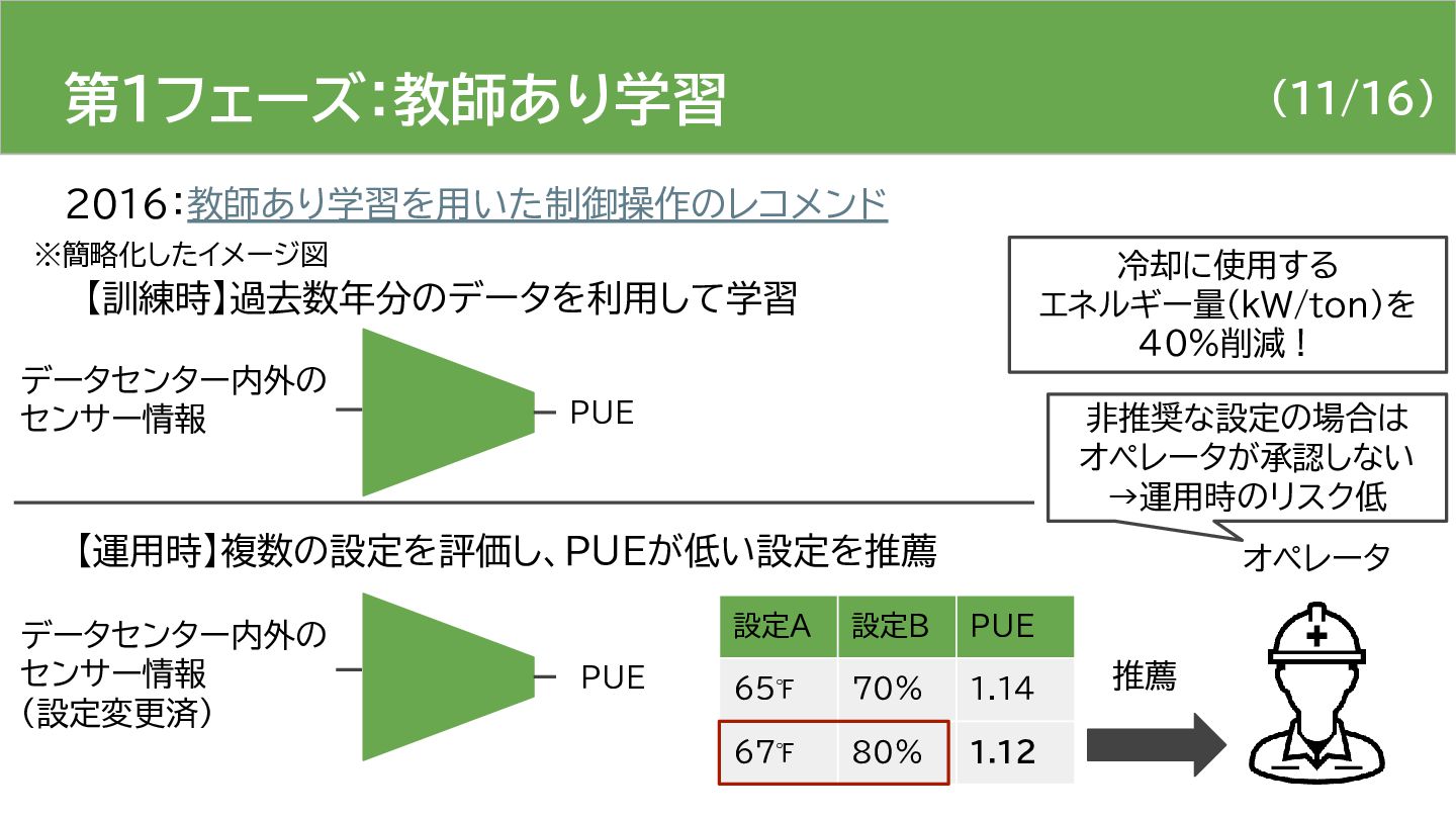 (設定変更済) 設定A 設定B PUE 65℉ 70% 1.14 67℉ 80% 1.12 オペレータ 推薦 冷却に使用する エネルギー量(kW/ton)を 40%削減! 非推奨な設定の場合は オペレータが承認しない →運用時のリスク低 ※簡略化したイメージ図 (11/16)