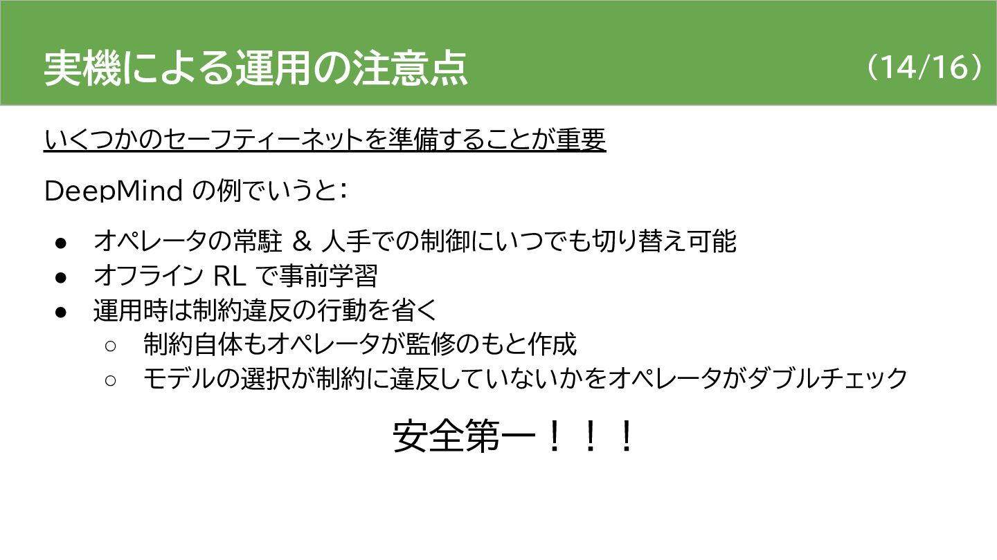 9. 実機による運用の注意点 いくつかのセーフティーネットを準備することが重要 DeepMind の例でいうと: • オペレータの常駐 & 人手での制御にいつでも切り替え可能 • オフライン