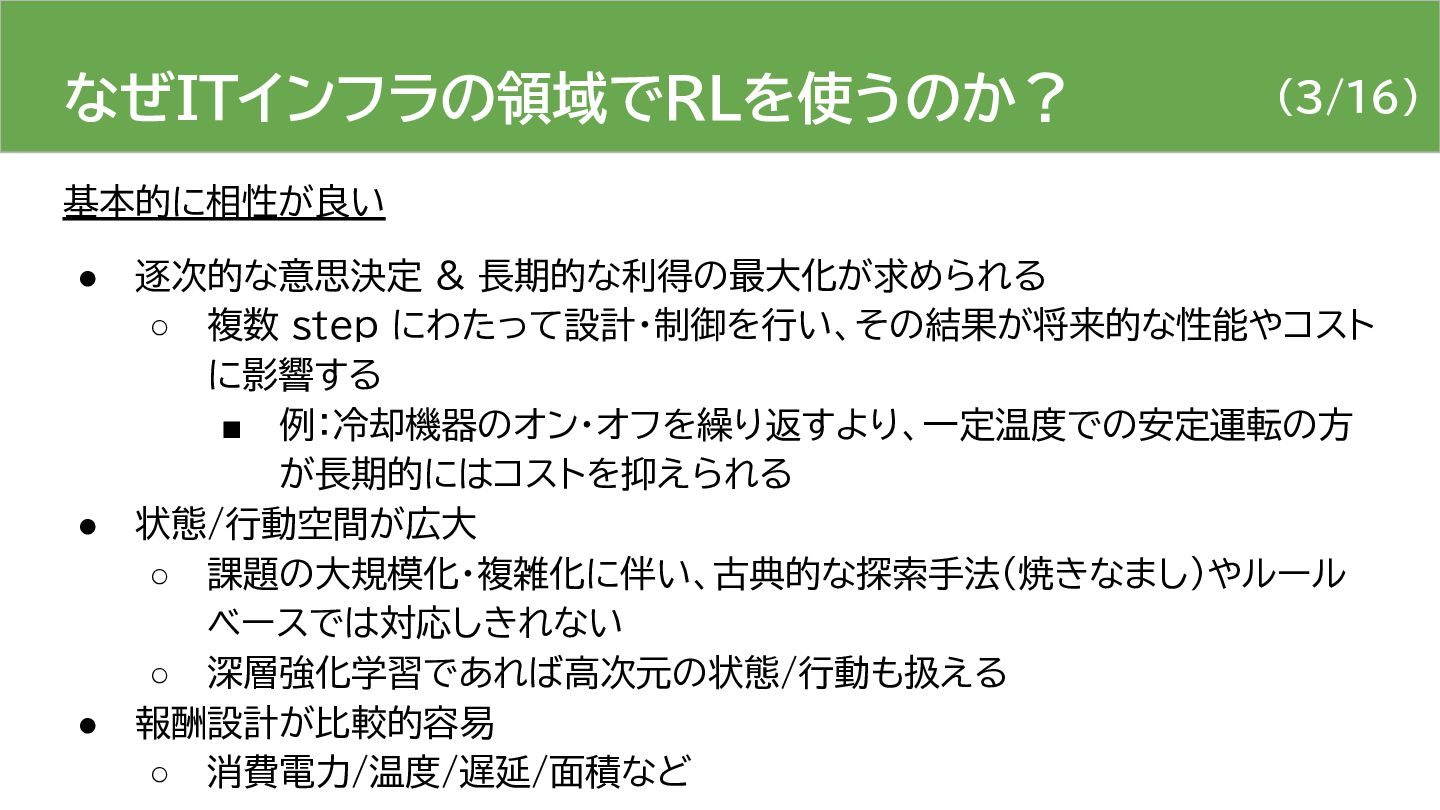 に影響する ▪ 例:冷却機器のオン・オフを繰り返すより、一定温度での安定運転の方 が長期的にはコストを抑えられる • 状態/行動空間が広大 ◦ 課題の大規模化・複雑化に伴い、古典的な探索手法(焼きなまし)やルール ベースでは対応しきれない ◦ 深層強化学習であれば高次元の状態/行動も扱える • 報酬設計が比較的容易 ◦ 消費電力/温度/遅延/面積など (3/16)