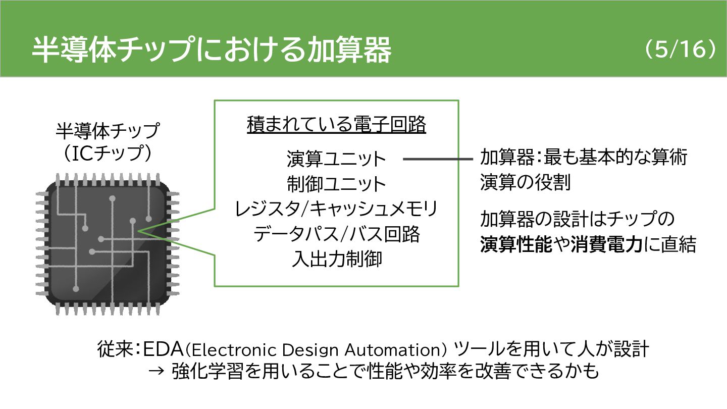 入出力制御 半導体チップ (ICチップ) 従来:EDA(Electronic Design Automation) ツールを用いて人が設計 → 強化学習を用いることで性能や効率を改善できるかも (5/16)