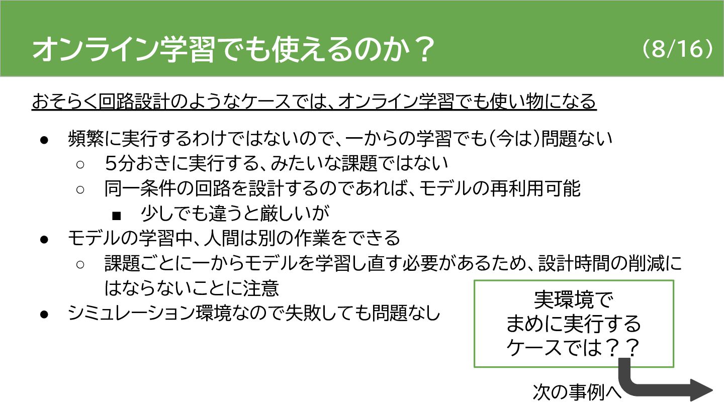 • モデルの学習中、人間は別の作業をできる ◦ 課題ごとに一からモデルを学習し直す必要があるため、設計時間の削減に はならないことに注意 • シミュレーション環境なので失敗しても問題なし 実環境で まめに実行する ケースでは?? 次の事例へ (8/16)