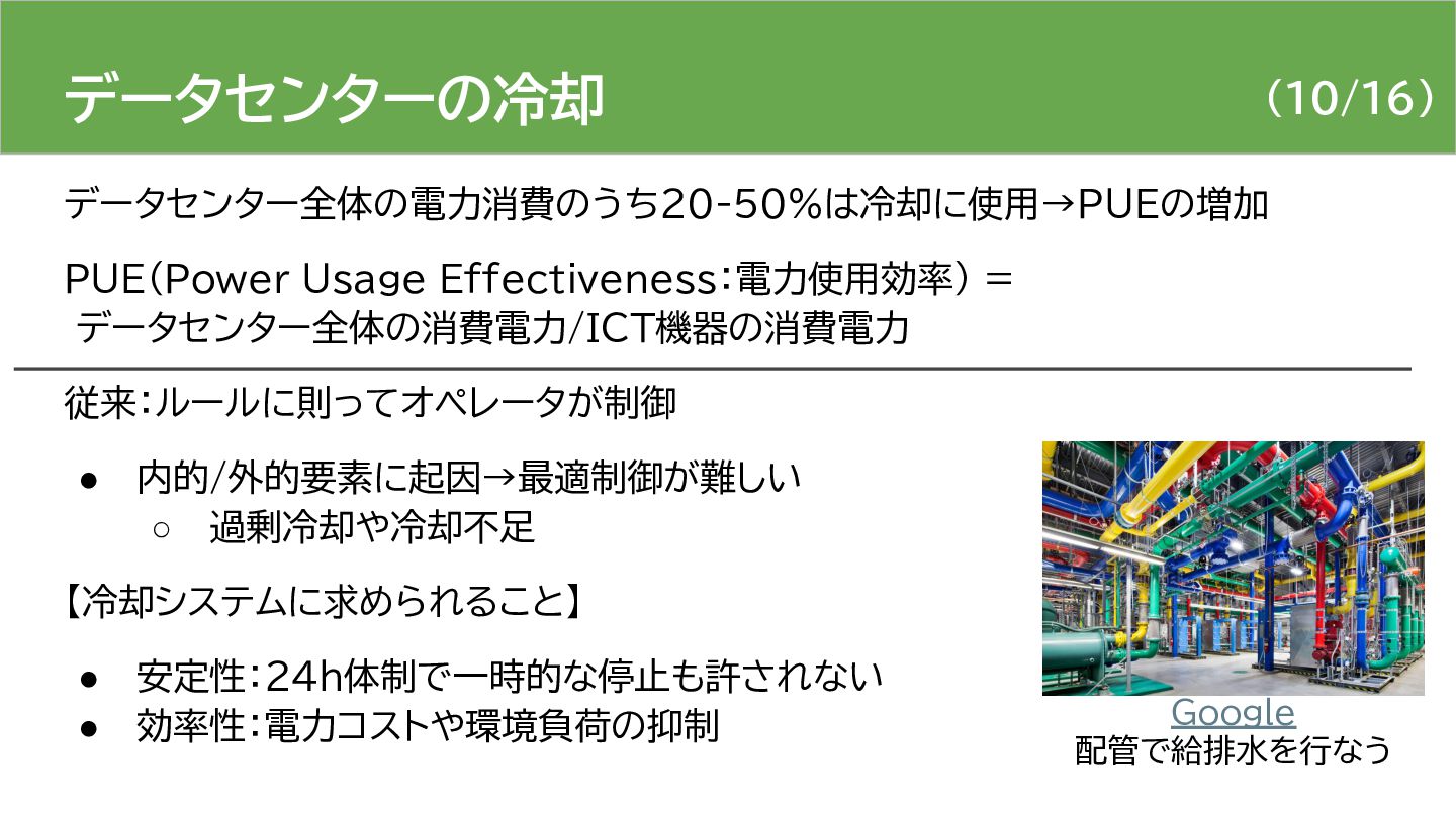 ◦ 過剰冷却や冷却不足 【冷却システムに求められること】 • 安定性:24h体制で一時的な停止も許されない • 効率性:電力コストや環境負荷の抑制 Google 配管で給排水を行なう (10/16)