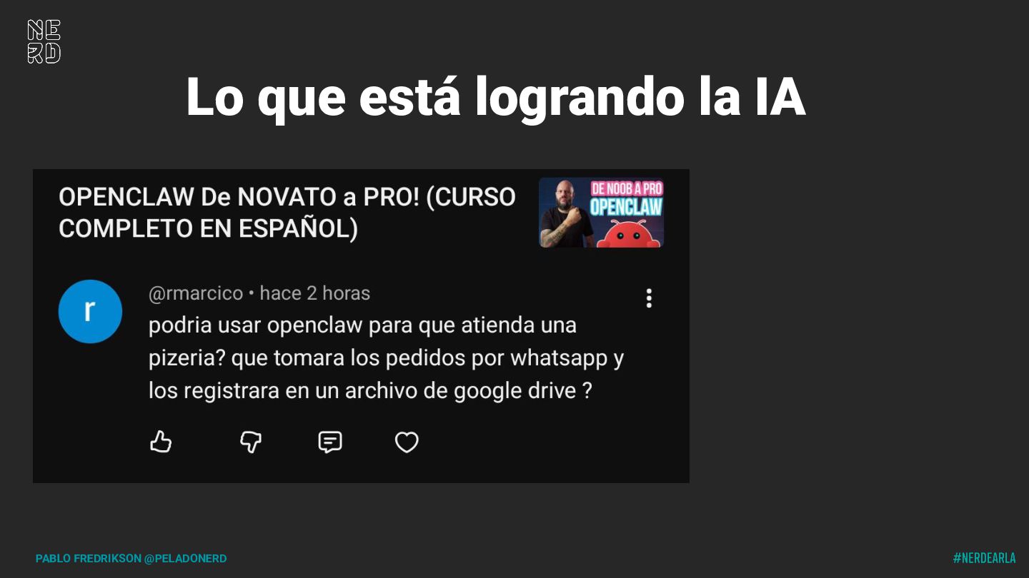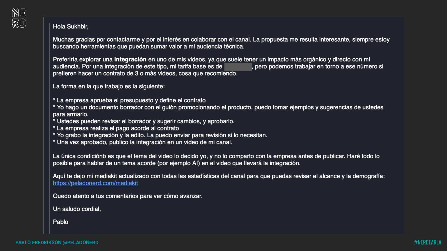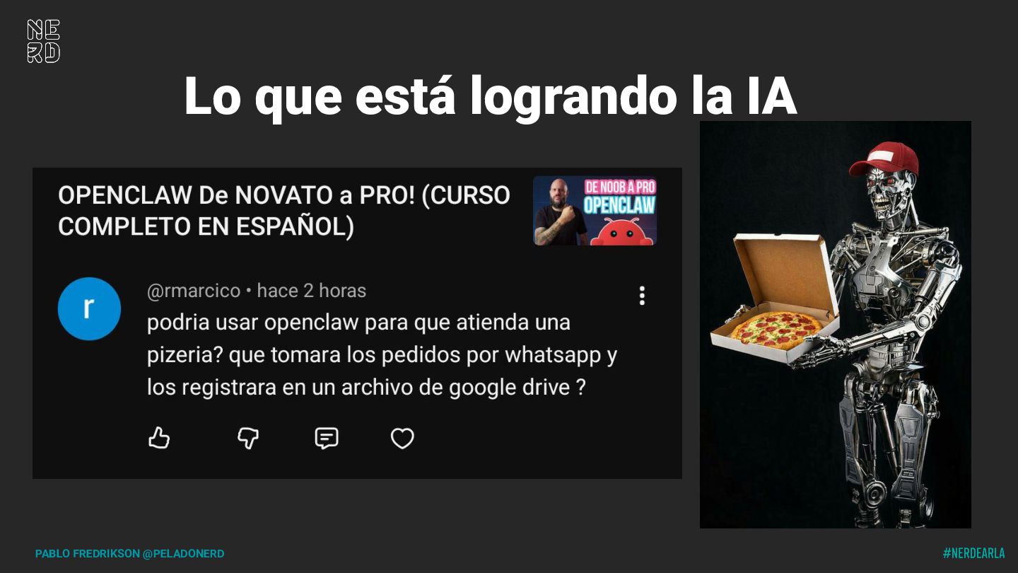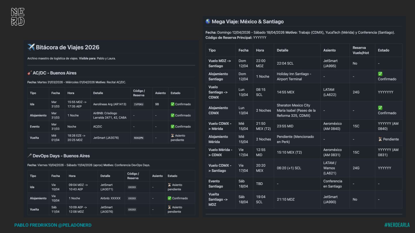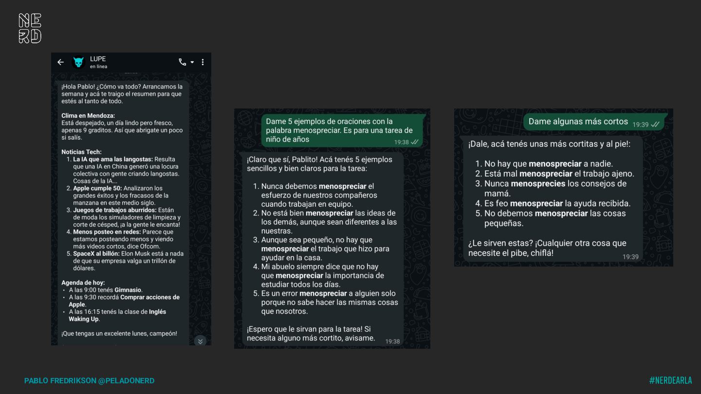 [email protected] (calendario), WhatsApp +549261XXXXXXX. • Preferencias comunicacionales: habla español argentino; prefiere respuestas concisas, que le muestres errores y no uses emojis en exceso. • Familia: pareja Laura (traductora), hijos; Laura: la llaman “Lau”. • Intereses personales: running (maratonista, PB 3:55; objetivo sub-3:40), tecnología, creador de contenido (canales YouTube: Pelado Nerd, Pelado Entrena, pablokbs). • Notas operativas: no enviar mails automáticos sin confirmación; para cámaras siempre usar Home Assistant; guardar PNRs y decisiones importantes en memoria de trabajo.