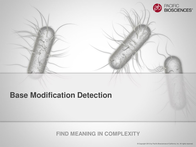 QV depends on coverage, which makes sense because higher coverage of a genomic position leads to higher confidence that the IPD ratio is significantly different from the baseline. Note that this can complicate the comparison of samples : if the coverage levels differ (which is common), a direct comparison of modification QVs and % detected may not be an apples-to- apples comparison. This is particularly problematic if the coverage levels are below 100x, where % detected is very sensitive to coverage. One way to handle this is to always work at >100x coverage, and to compare IPD ratios for each motif when considering: • Identical samples grown under different conditions • Biological replicates. 100 90 80 70 60 50 0 50 100 150 200 250 % Detected Total Coverage 6-mA Detection