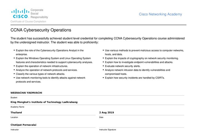 CCNA Cybersecurity Operations The student has successfully achieved student level credential for completing CCNA Cybersecurity Operations course administered by the undersigned instructor. The student was able to proficiently: Explain the role of the Cybersecurity Operations Analyst in the enterprise. Explain the Windows Operating System and Linux Operating System features and characteristics needed to support cybersecurity analyses. Explain the operation of network infrastructures. Analyze the operation of network protocols and services. Classify the various types of network attacks. Use network monitoring tools to identify attacks against network protocols and services. Use various methods to prevent malicious access to computer networks, hosts, and data. Explain the impacts of cryptography on network security monitoring. Explain how to investigate endpoint vulnerabilities and attacks. Evaluate network security alerts. Analyze network intrusion data to identify vulnerabilities and compromised hosts. Explain how security incidents are handled by CSIRTs. WEERACHAI YAEMVACHI Student King Mongkut's Institute of Technology Ladkrabang Academy Name Thailand Location 2 Aug 2019 Date Chotipat Pornavalai Instructor Instructor Signature