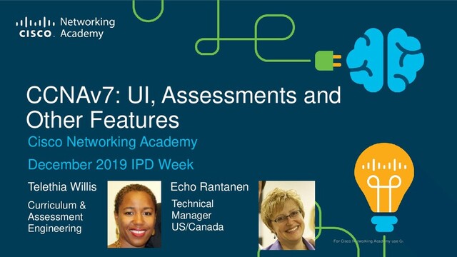 Cisco Networking Academy use Only Echo Rantanen Technical Manager US/Canada Cisco Networking Academy December 2019 IPD Week CCNAv7: UI, Assessments and Other Features Telethia Willis Curriculum & Assessment Engineering