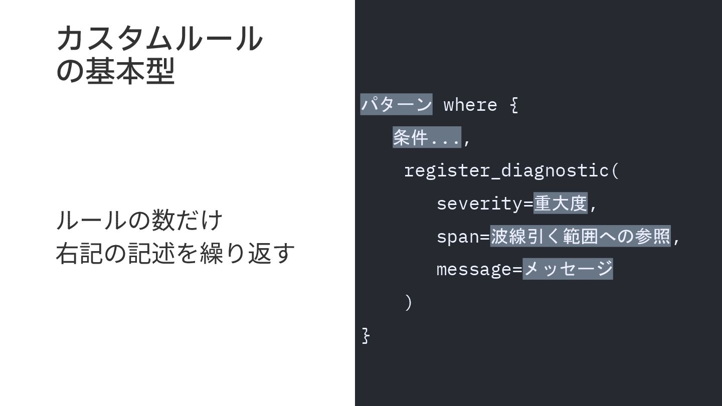 カスタムルール の基本型 ルールの数だけ 右記の記述を繰り返す パターン where { 条件..., register_diagnostic( severity=重大度,