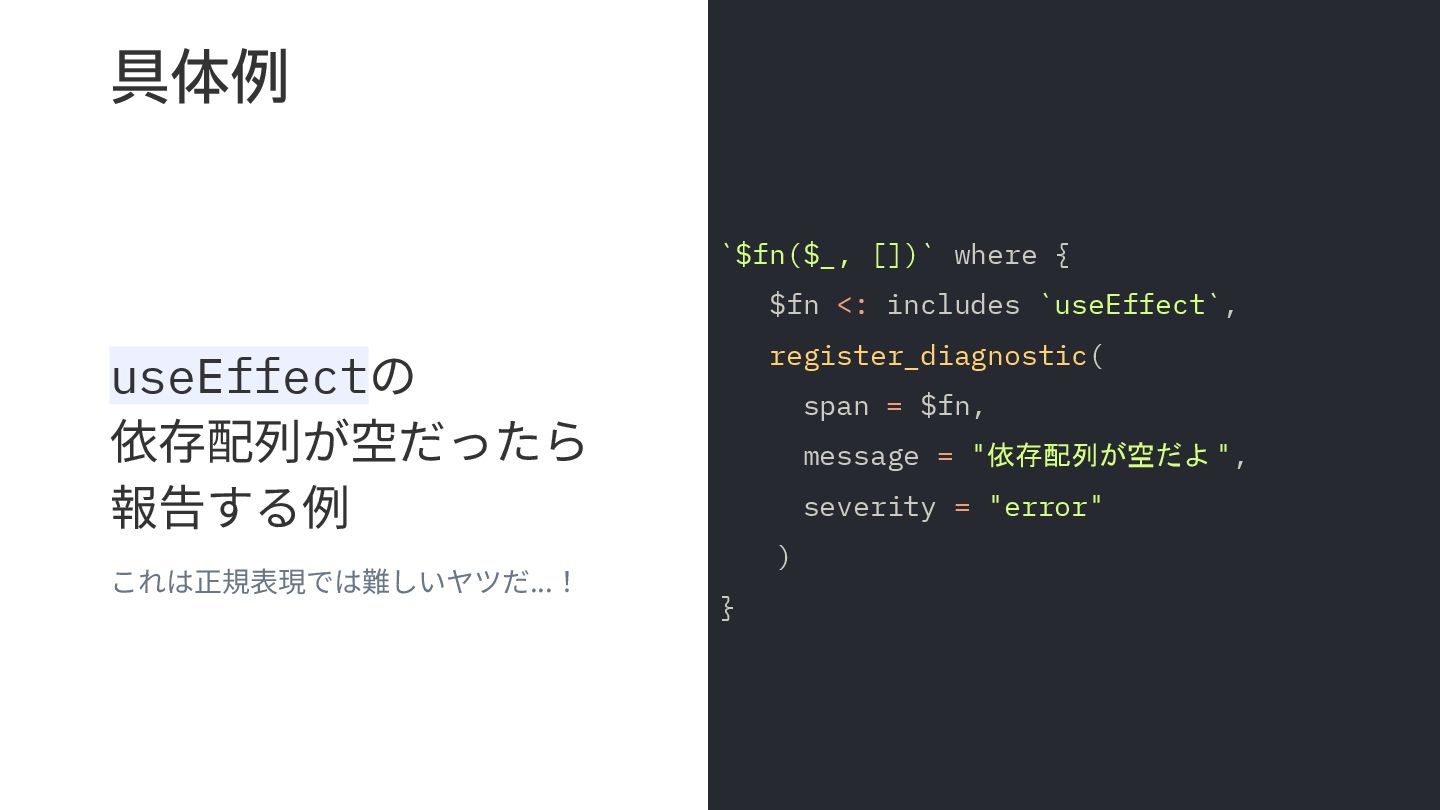 span = $fn, message = "依存配列が空だよ", severity = "error" ) } useEffectの 依存配列が空だったら 報告する例 これは正規表現では難しいヤツだ...!