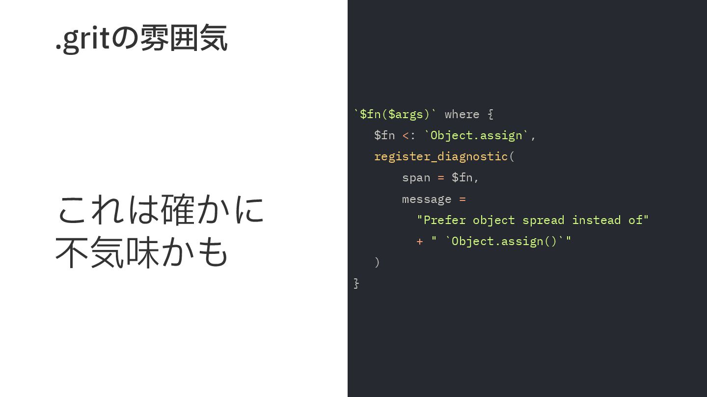 .gritの雰囲気 これは確かに 不気味かも `$fn($args)` where { $fn <: `Object.assign`, register_diagnostic(