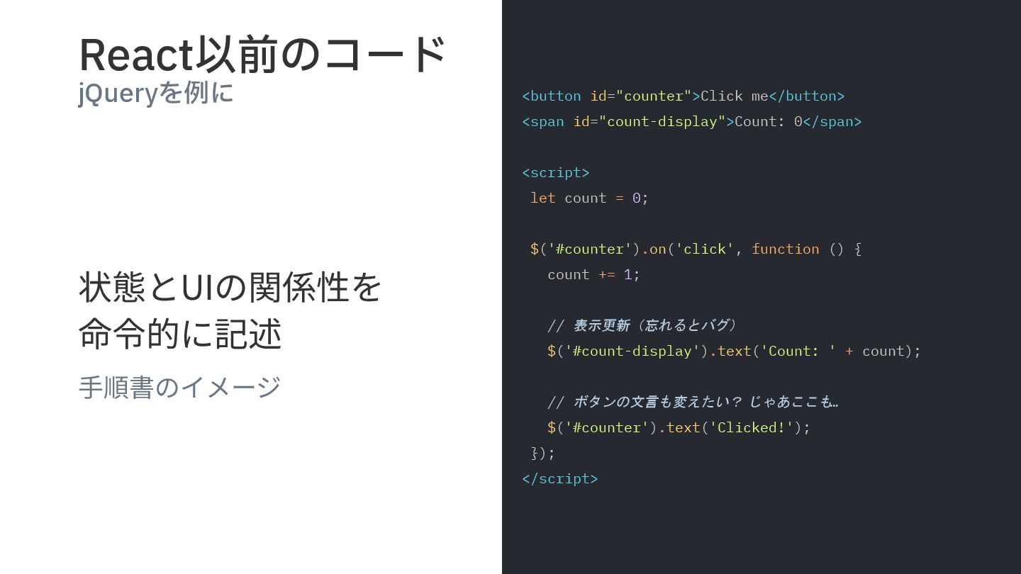 React以前のコード jQueryを例に 状態とUIの関係性を 命令的に記述 ⼿順書のイメージ <button id="counter">Click me</button> <span id="count-display">Count:
