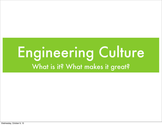 makes users happy. 2. Create a codebase that’s maintainable and not fragile. 3. Be intellectually excited by what we’re working on. 4. Do it with limited time and resources. As fast and lean as possible. And that’s why culture matters. Wednesday, October 9, 13