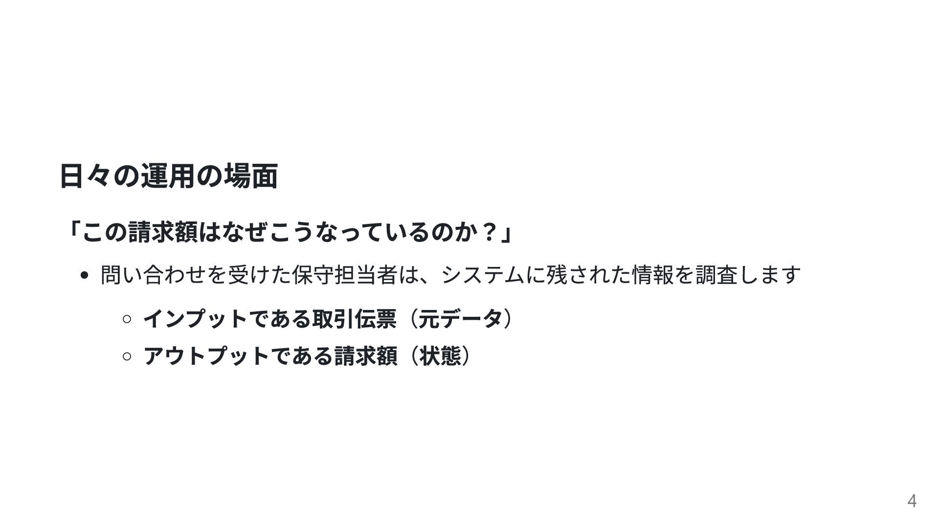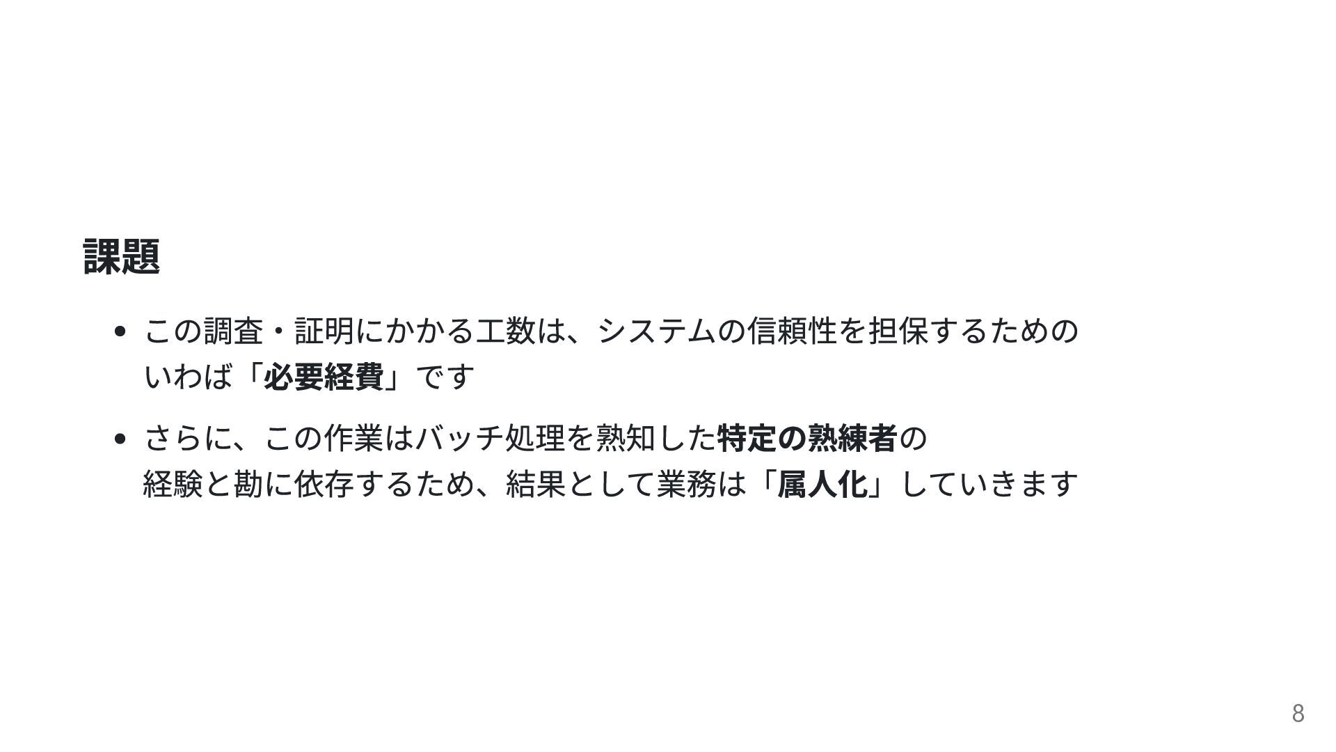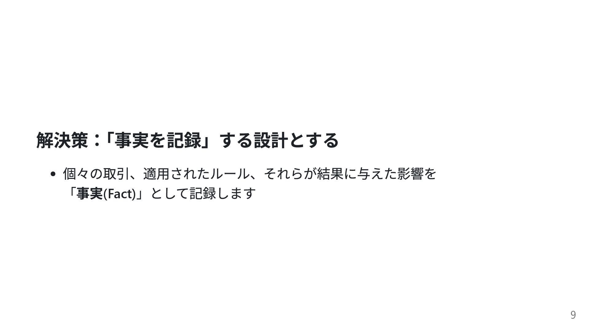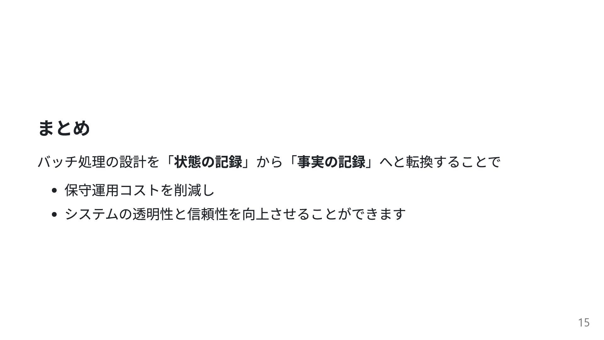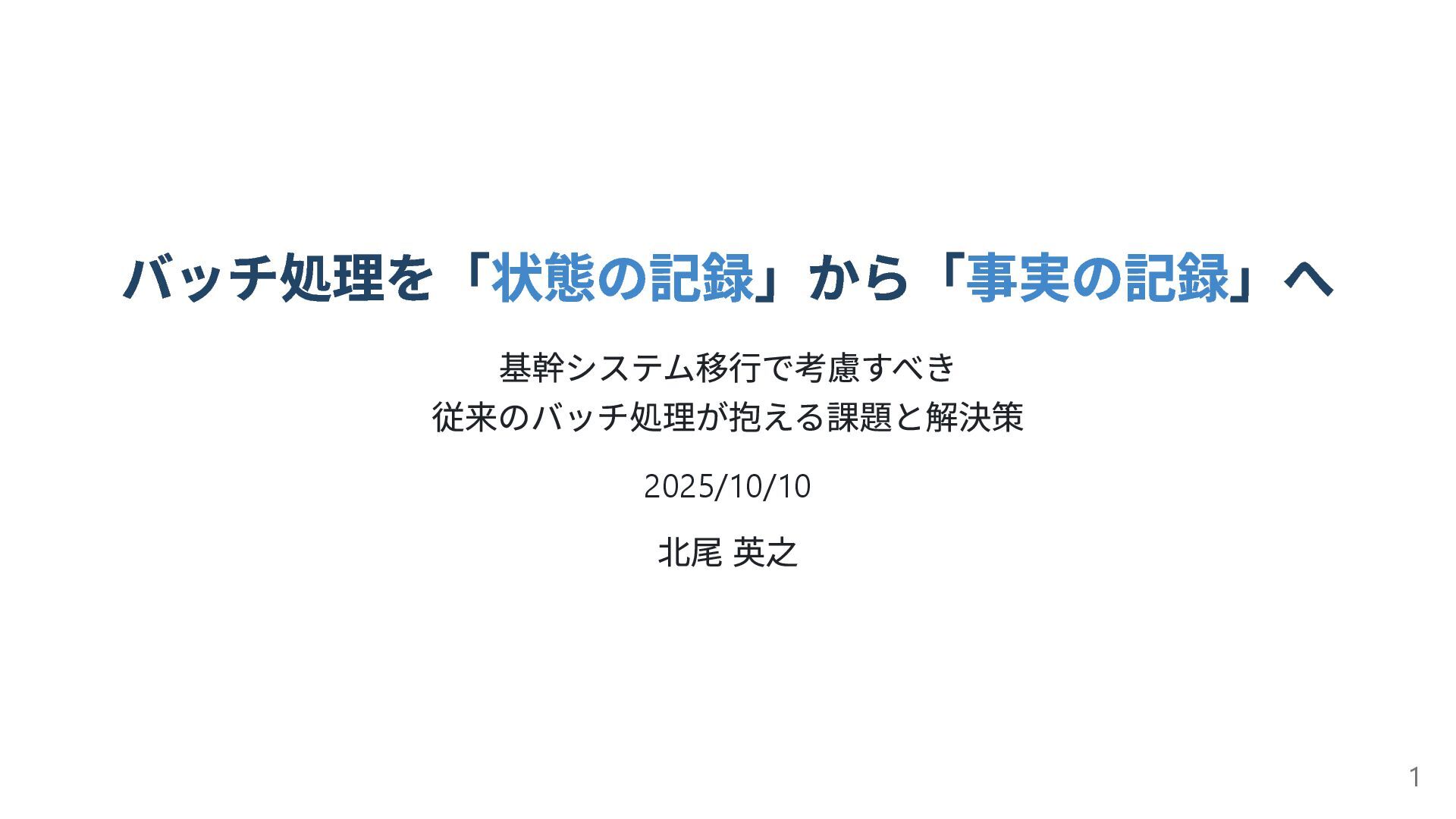 本資料では、この根深い課題を解決するため、設計パラダイムを「状態の更新」から「事実の記録」へと転換するアプローチを提案します。保守運用のコストを削減し、システムの透明性と信頼性を高めるための具体的な設計思想について解説します。