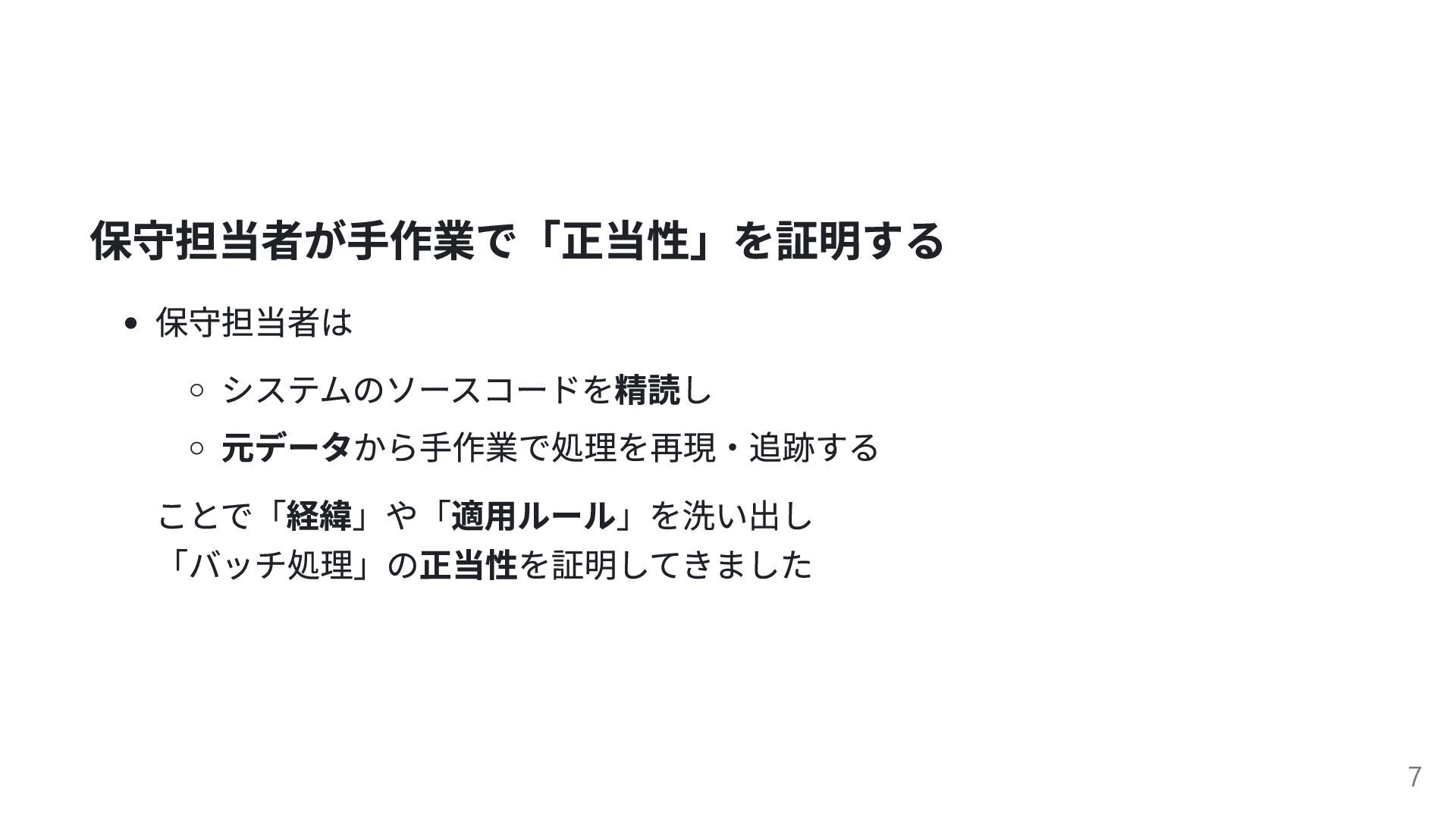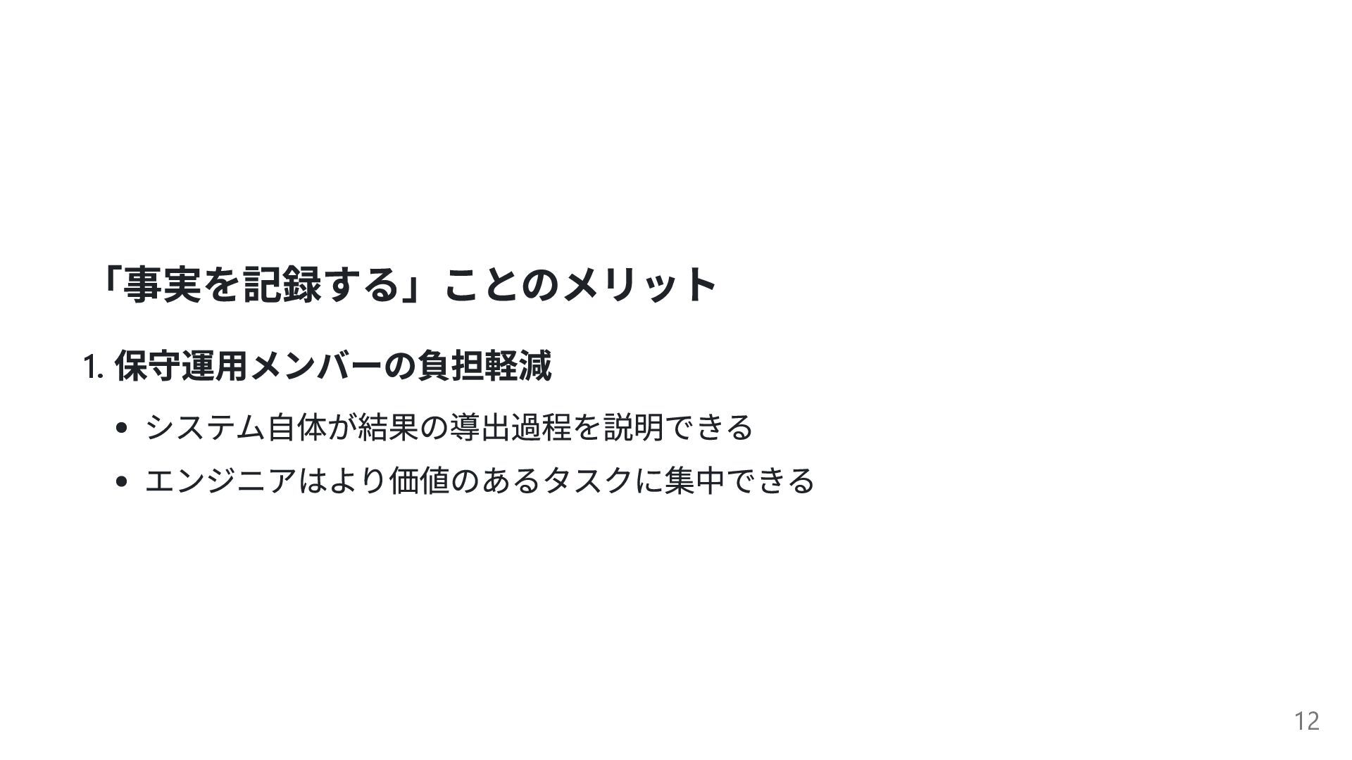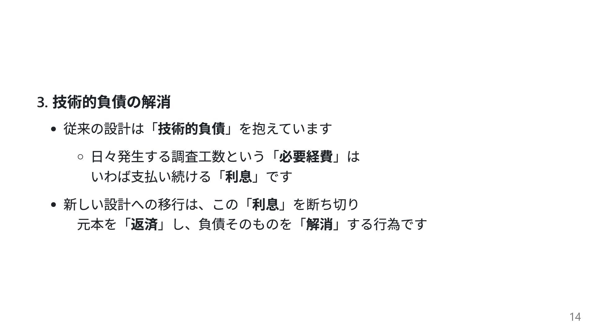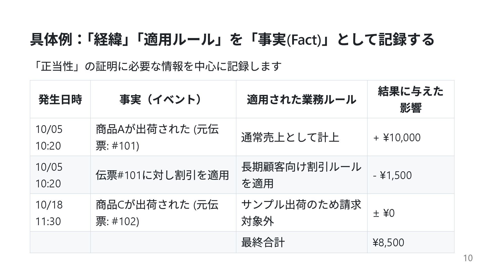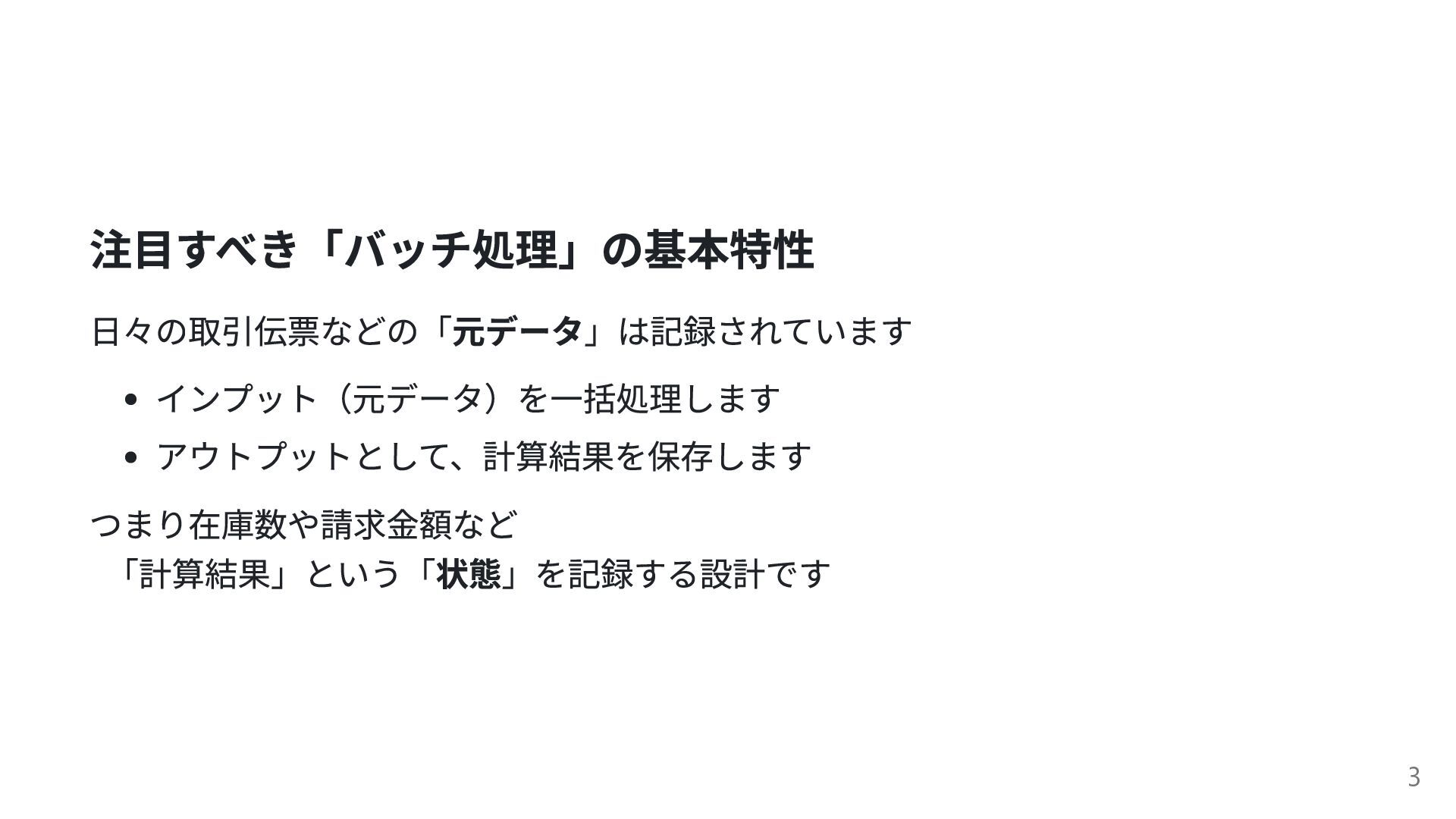 本資料では、この根深い課題を解決するため、設計パラダイムを「状態の更新」から「事実の記録」へと転換するアプローチを提案します。保守運用のコストを削減し、システムの透明性と信頼性を高めるための具体的な設計思想について解説します。