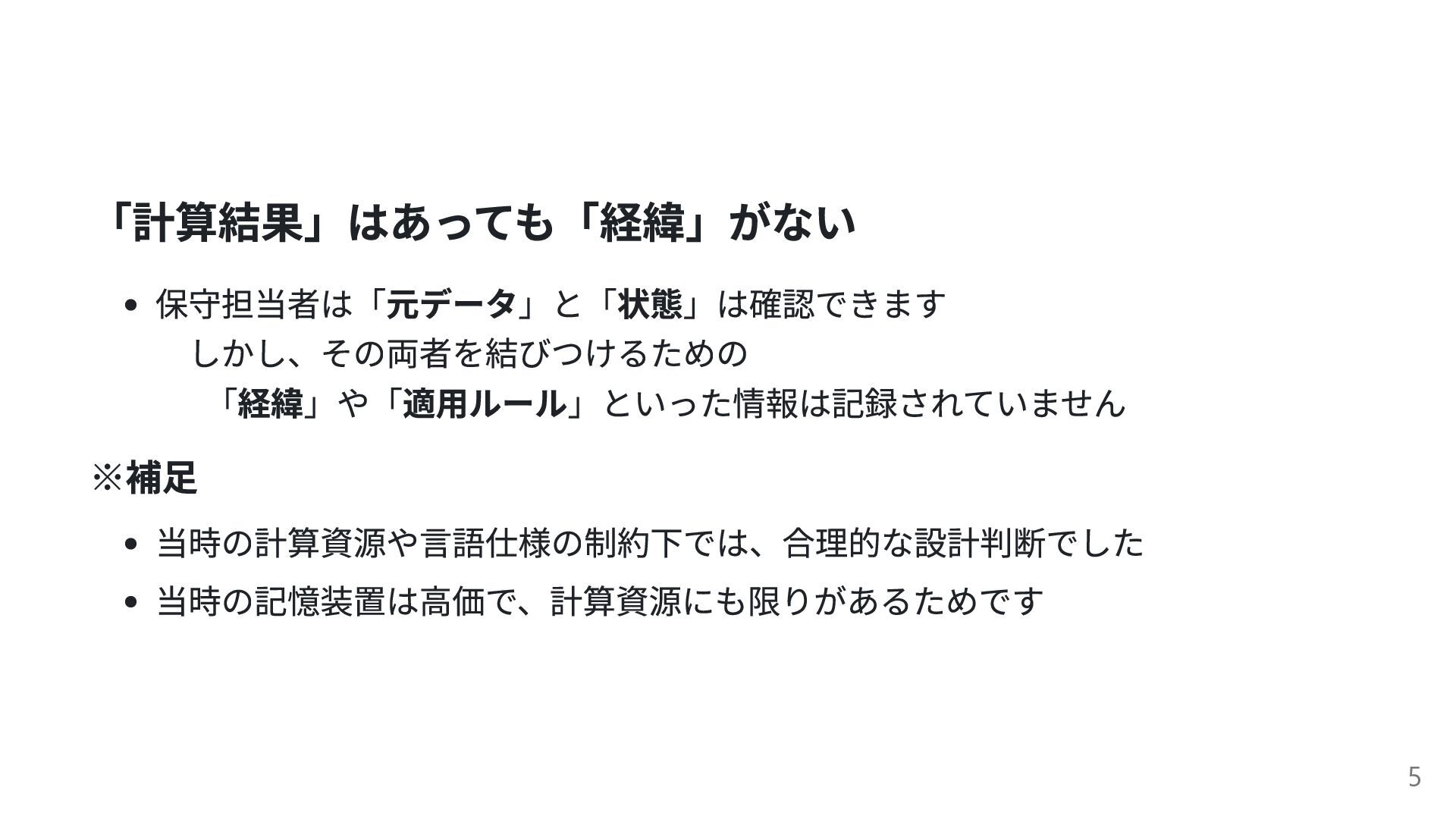 多くの基幹システム、特にCOBOLなどで構築された従来のバッチ処理は、計算結果という「状態」は記録しても、そこに至る「経緯」を失いがちです。その結果、調査は保守要員が手作業で実施し、業務は属人化していきます。