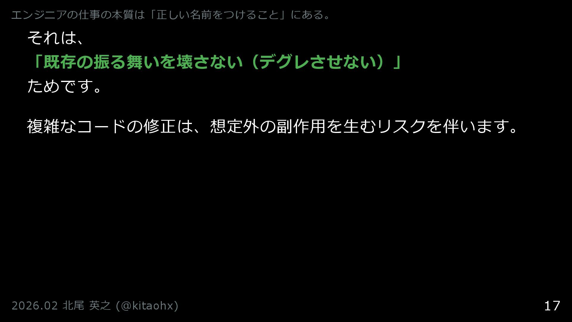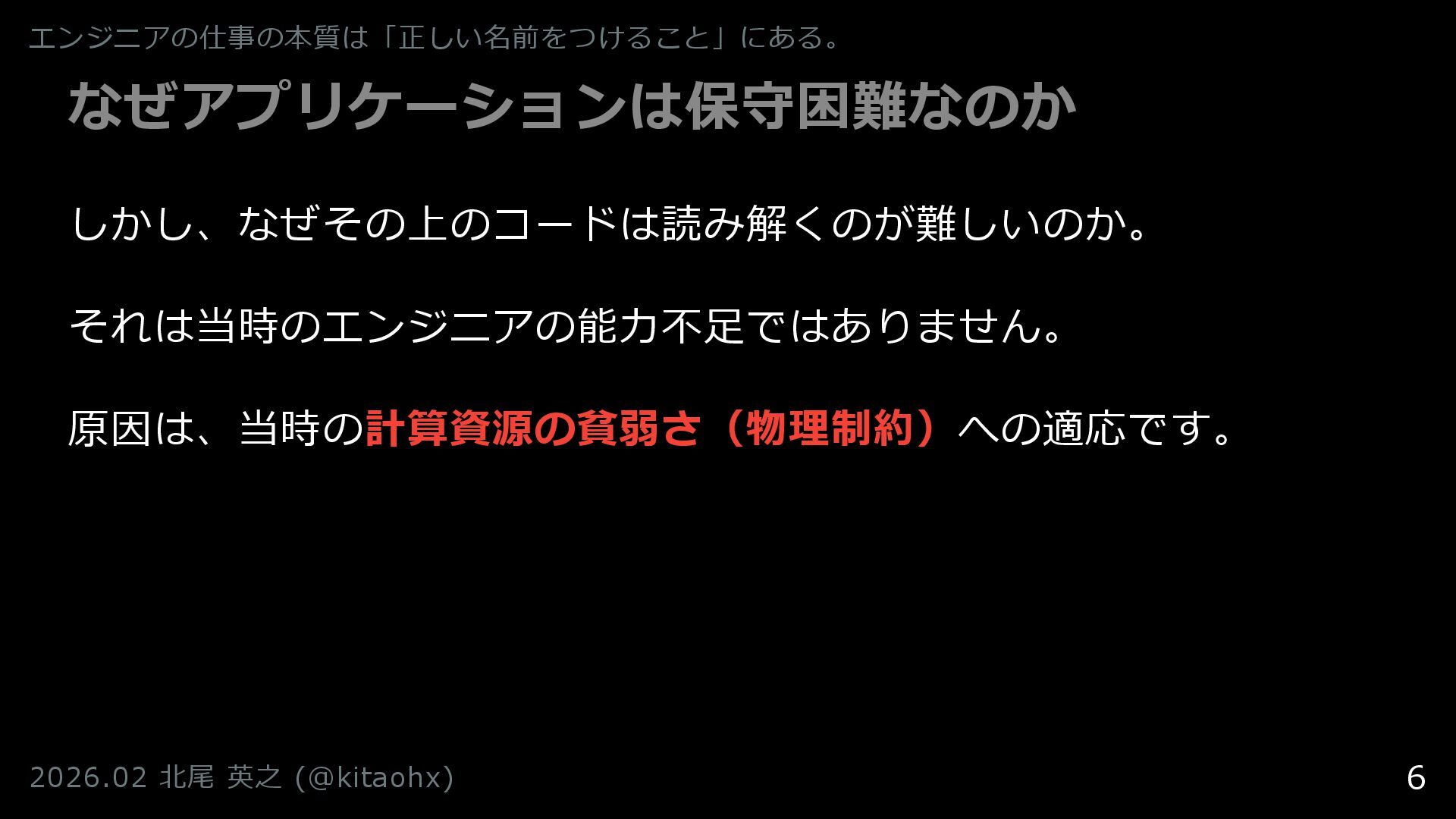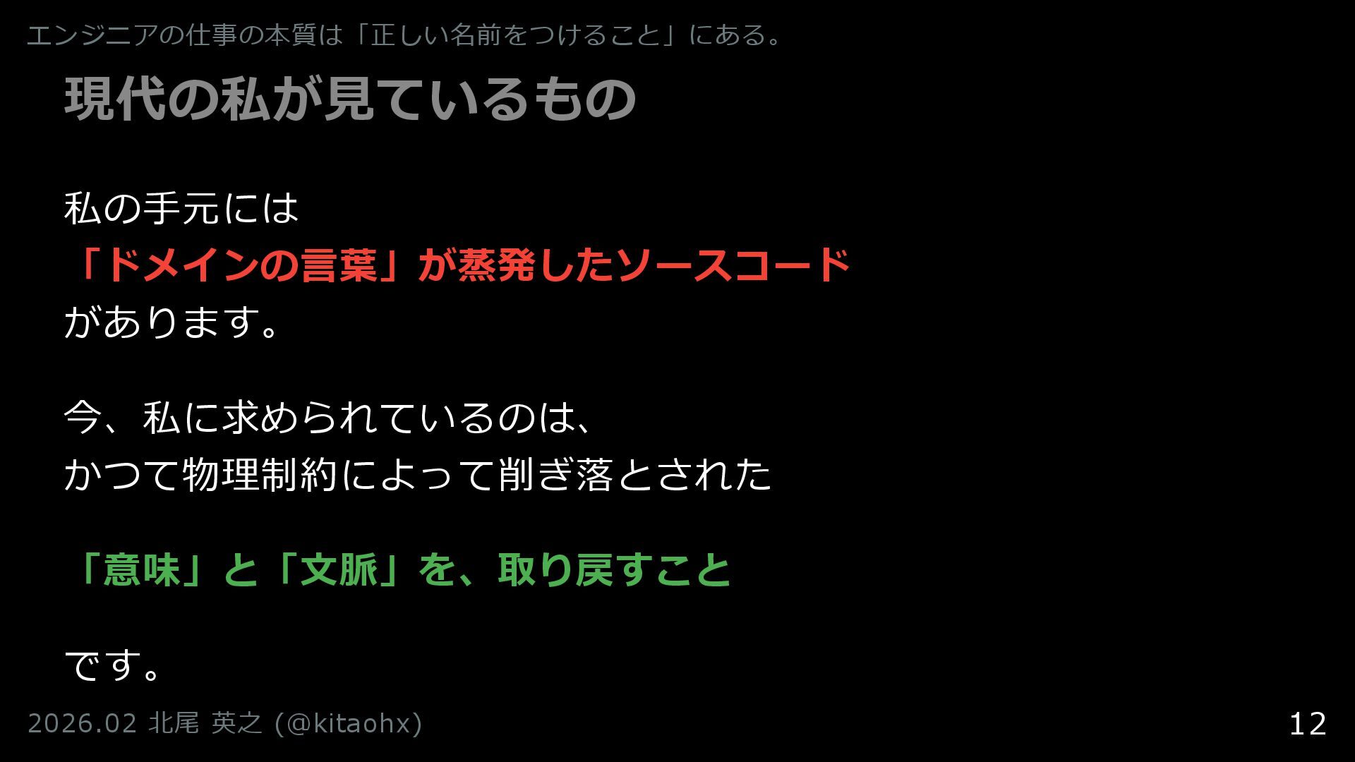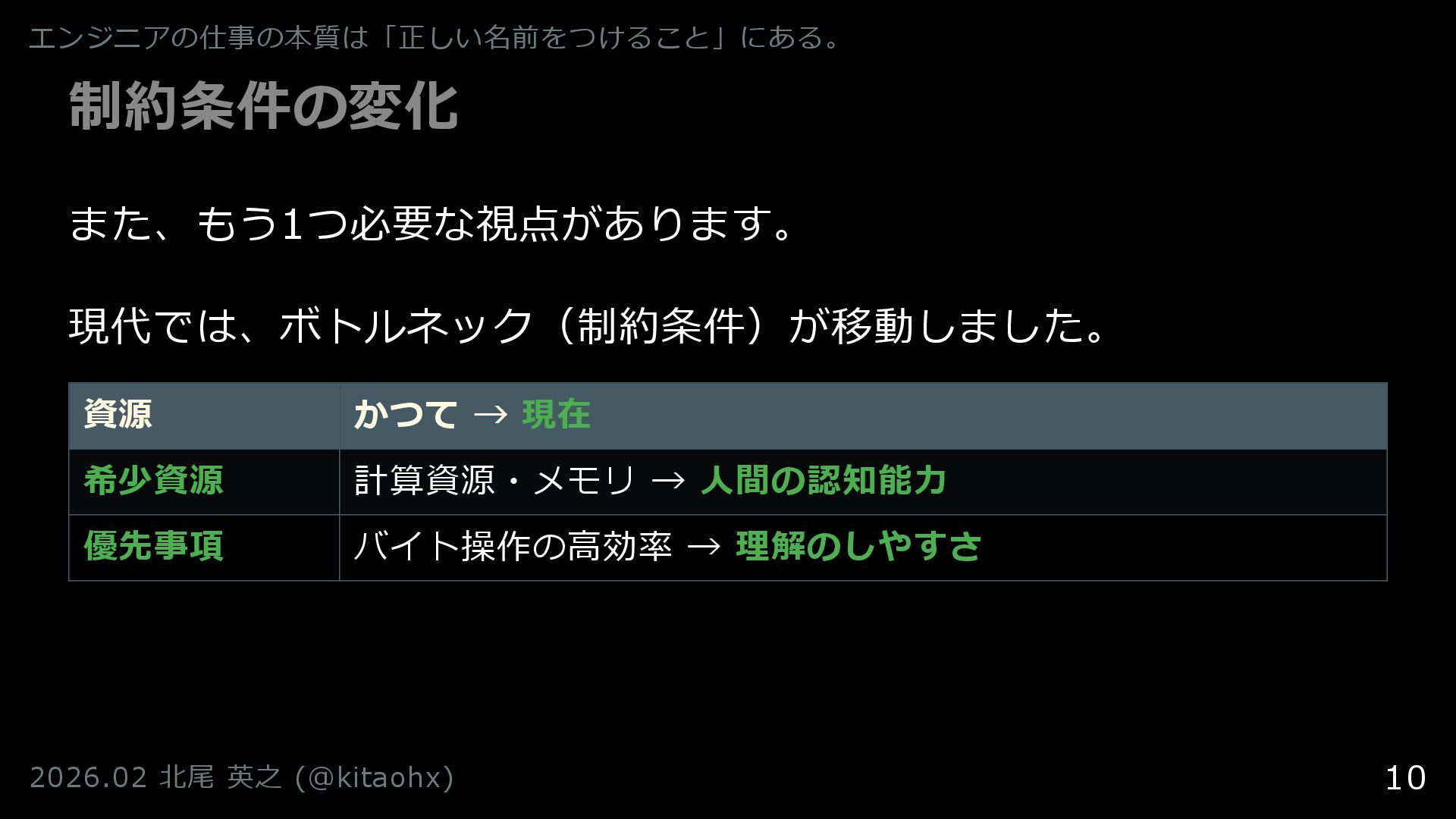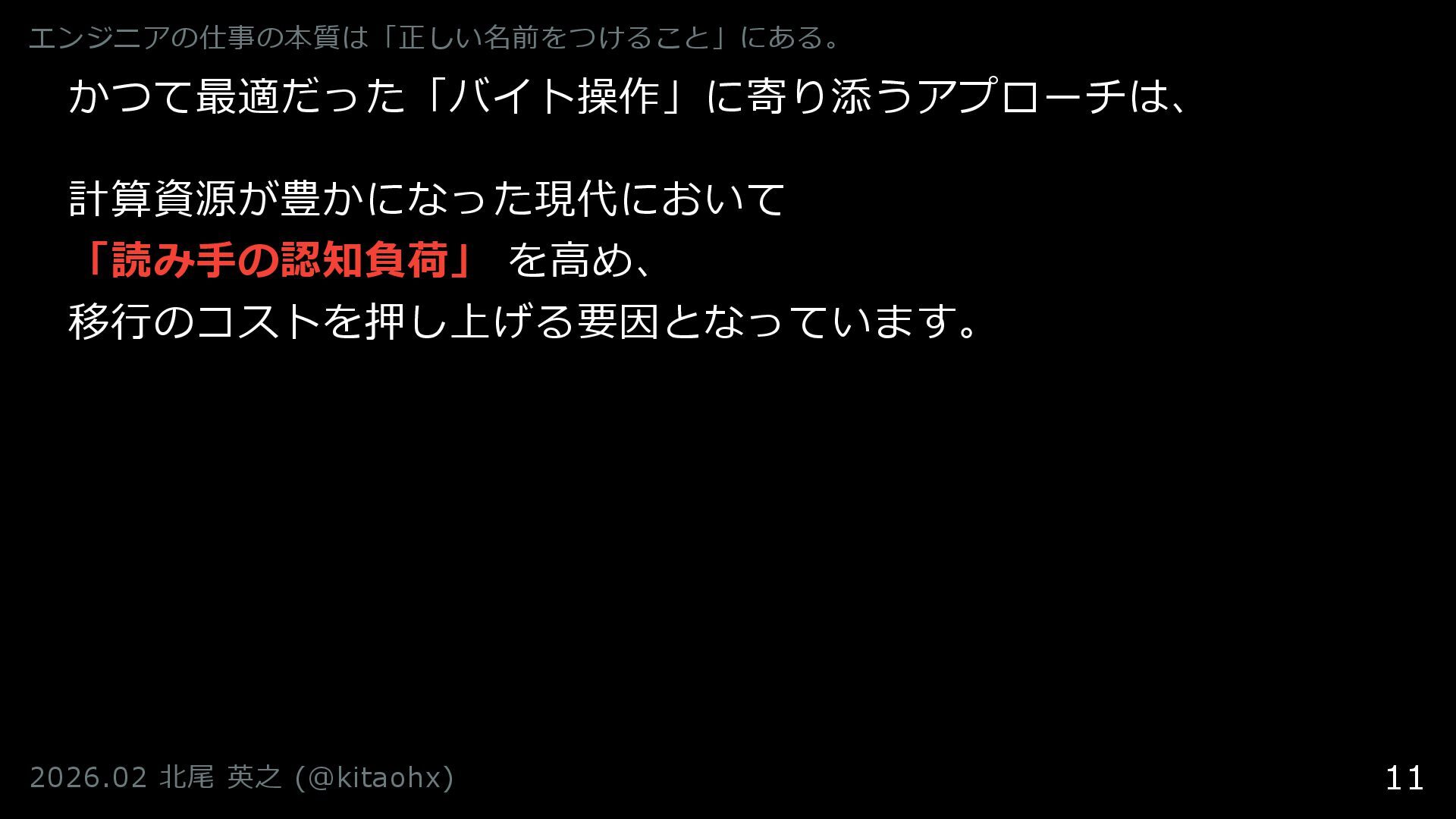 人間の認知能力 優先事項 バイト操作の高効率 → 理解のしやすさ エンジニアの仕事の本質は「正しい名前をつけること」にある。 2026.02 北尾 英之 (@kitaohx) 10