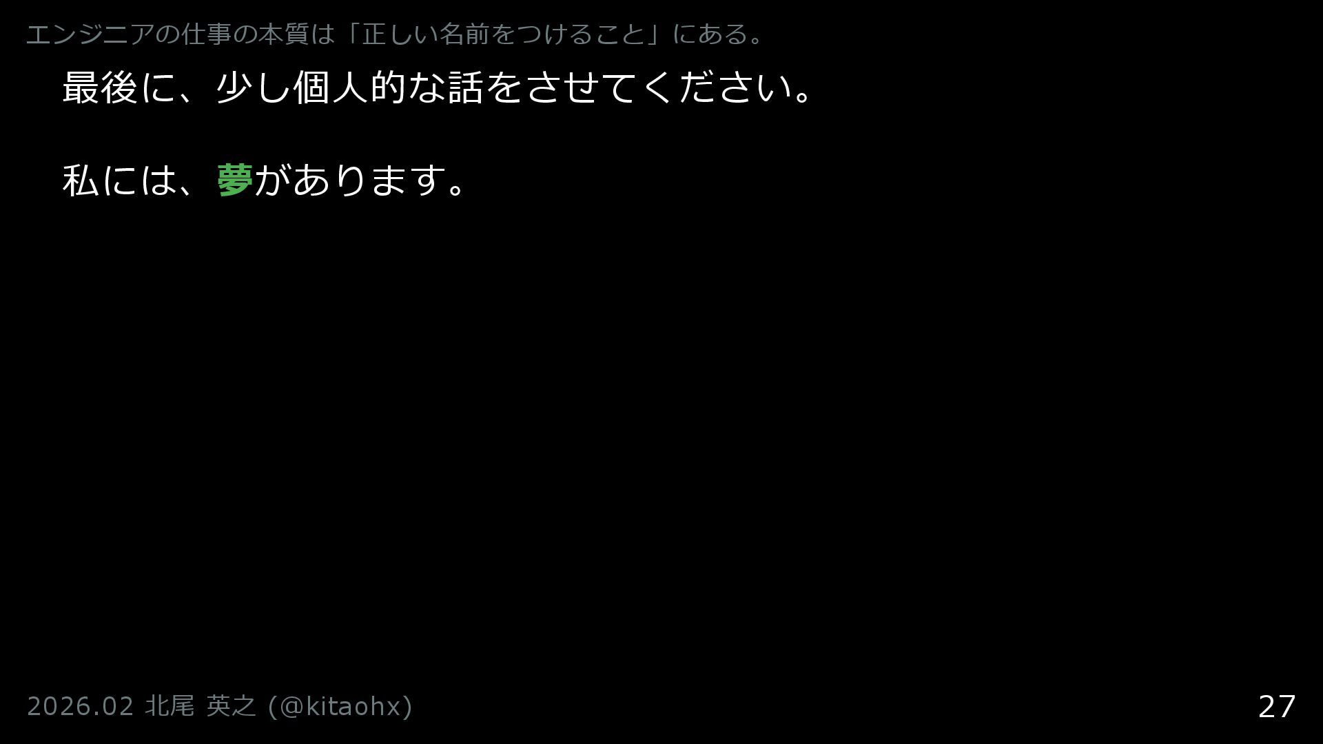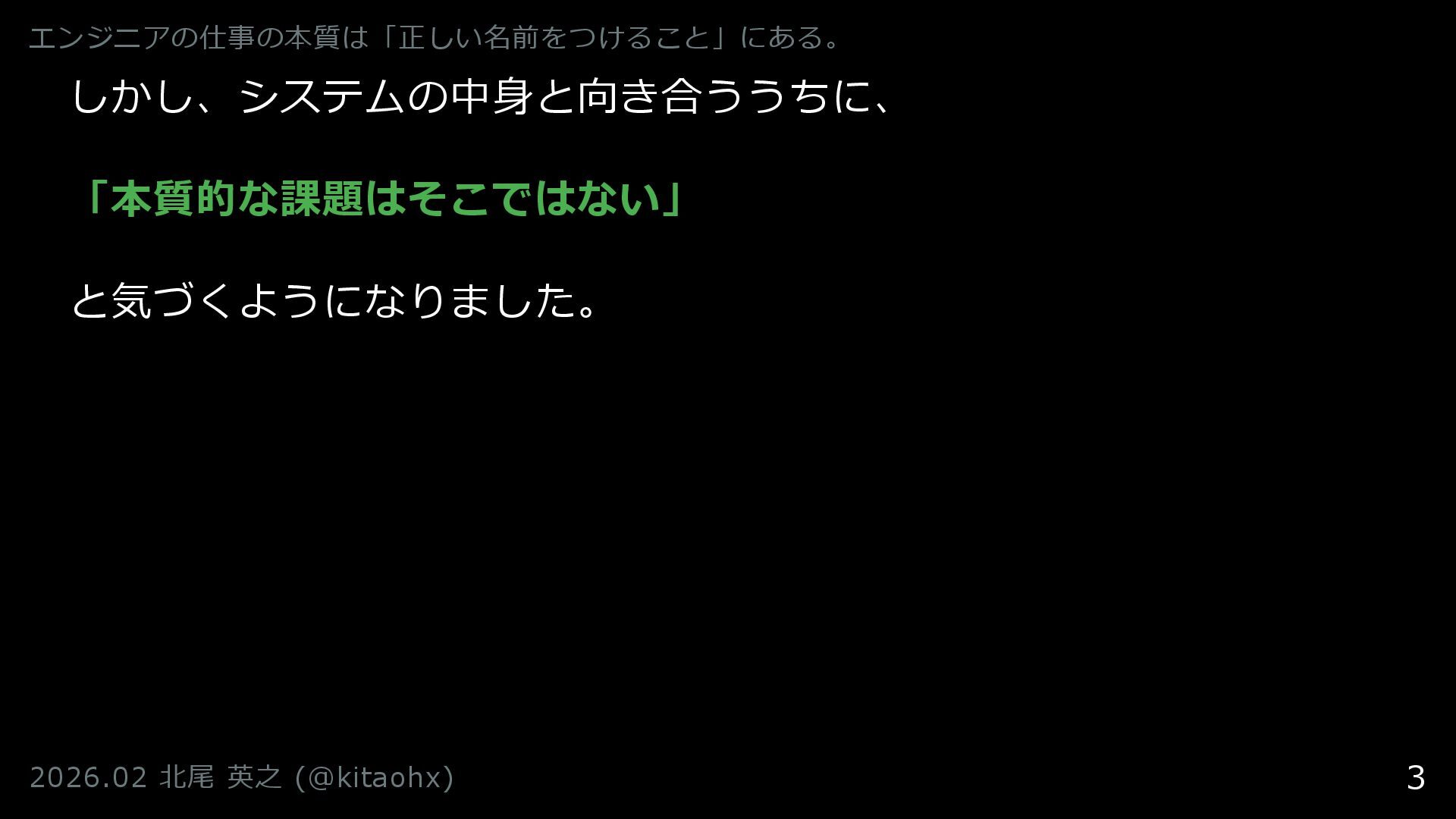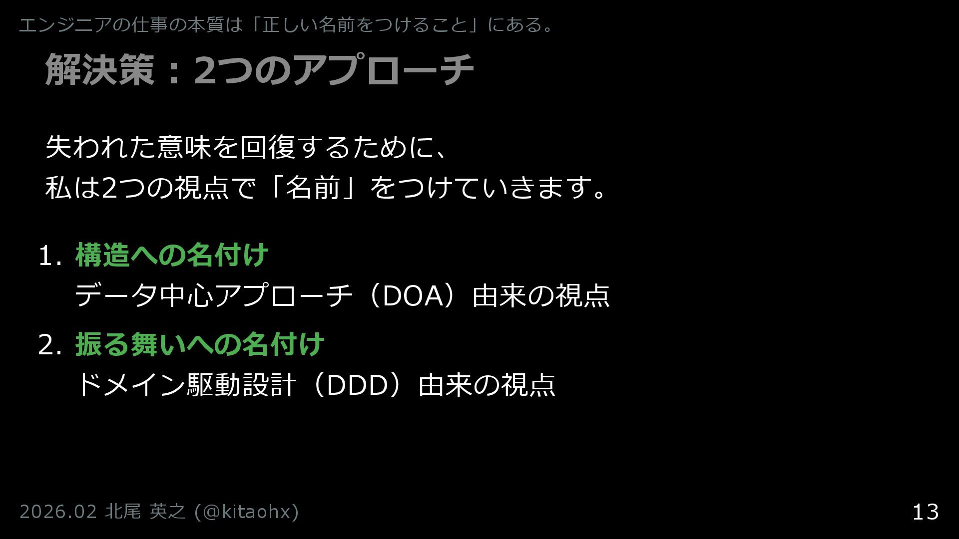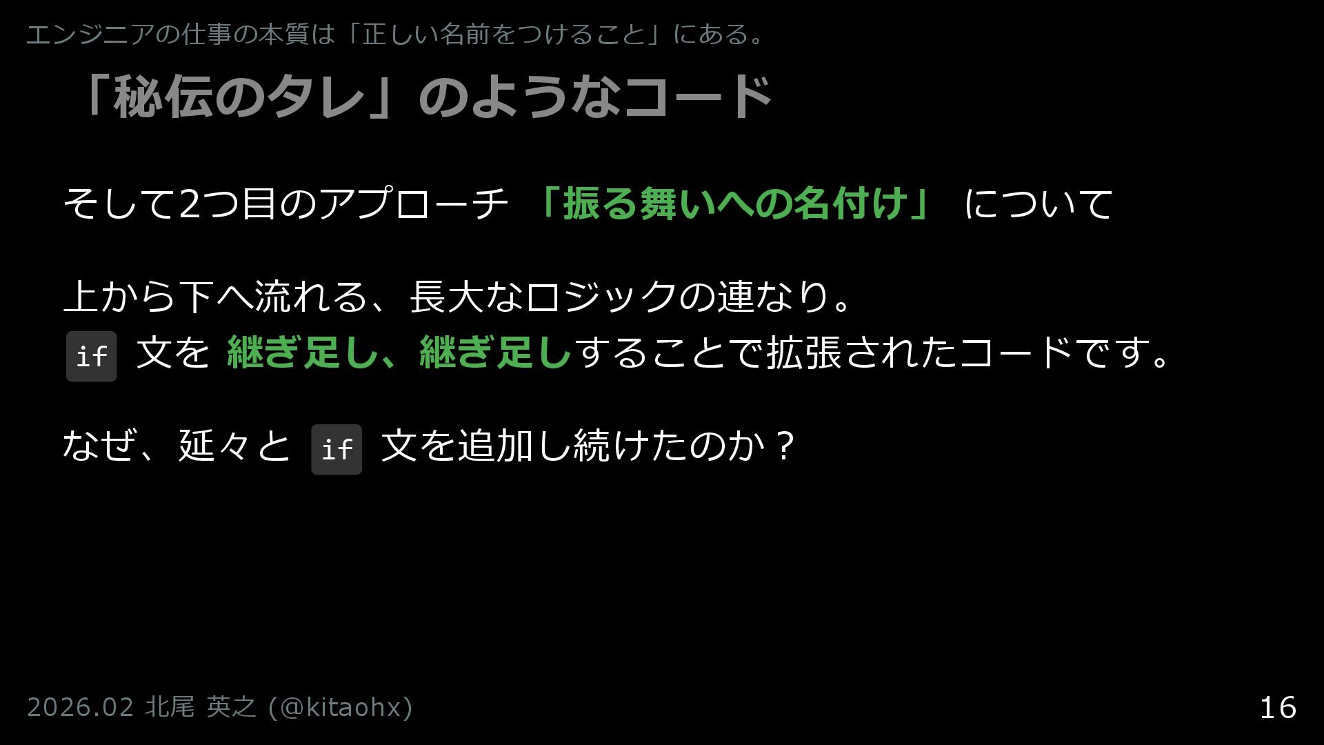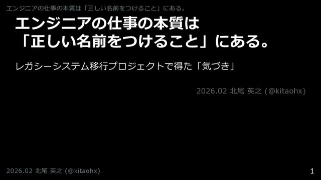 人間の認知能力 優先事項 バイト操作の高効率 → 理解のしやすさ エンジニアの仕事の本質は「正しい名前をつけること」にある。 2026.02 北尾 英之 (@kitaohx) 10