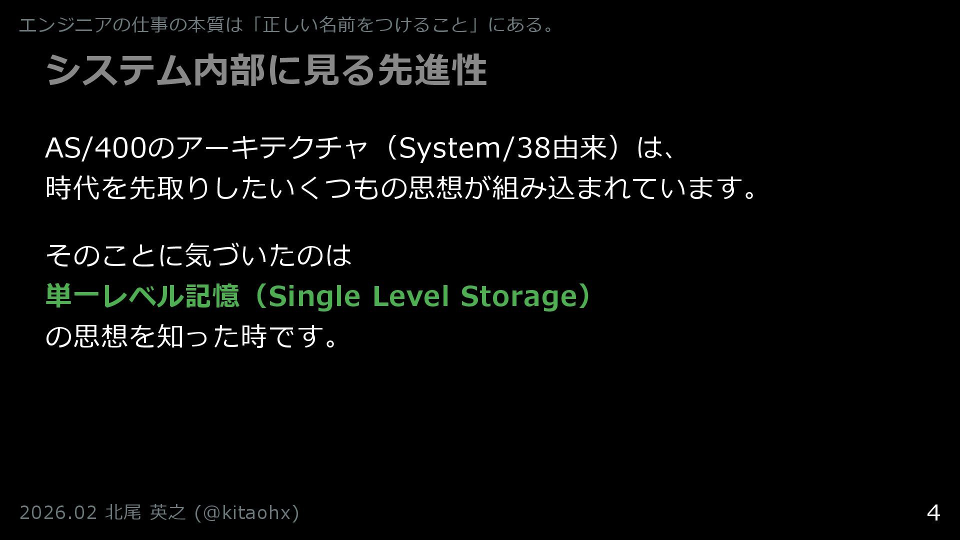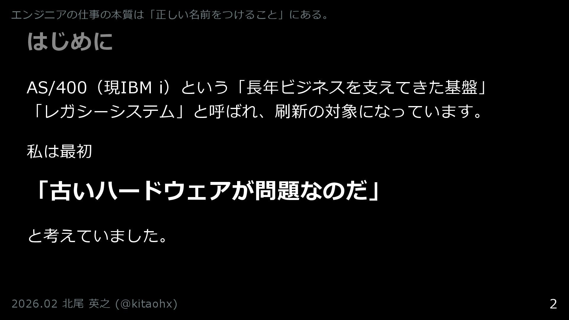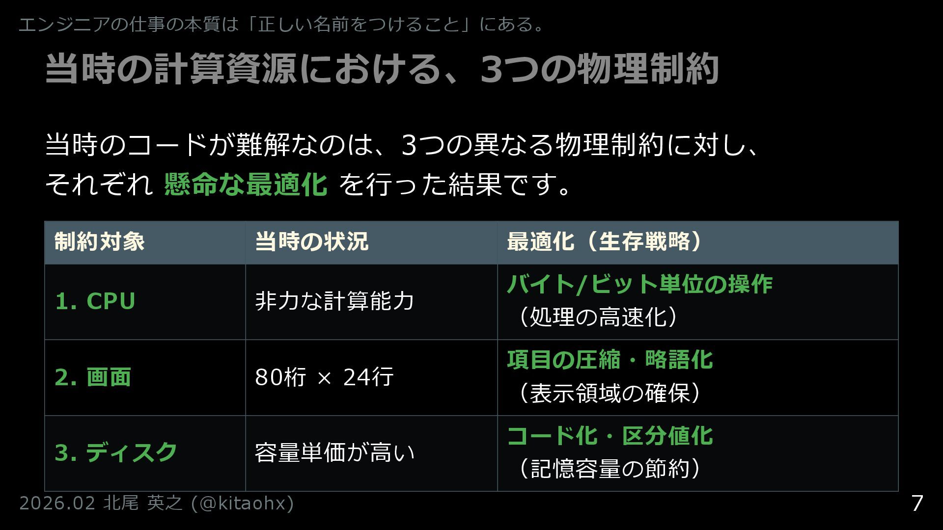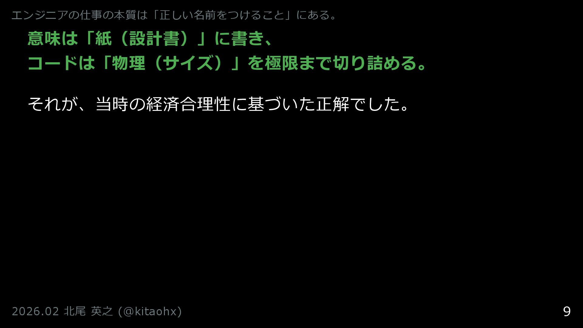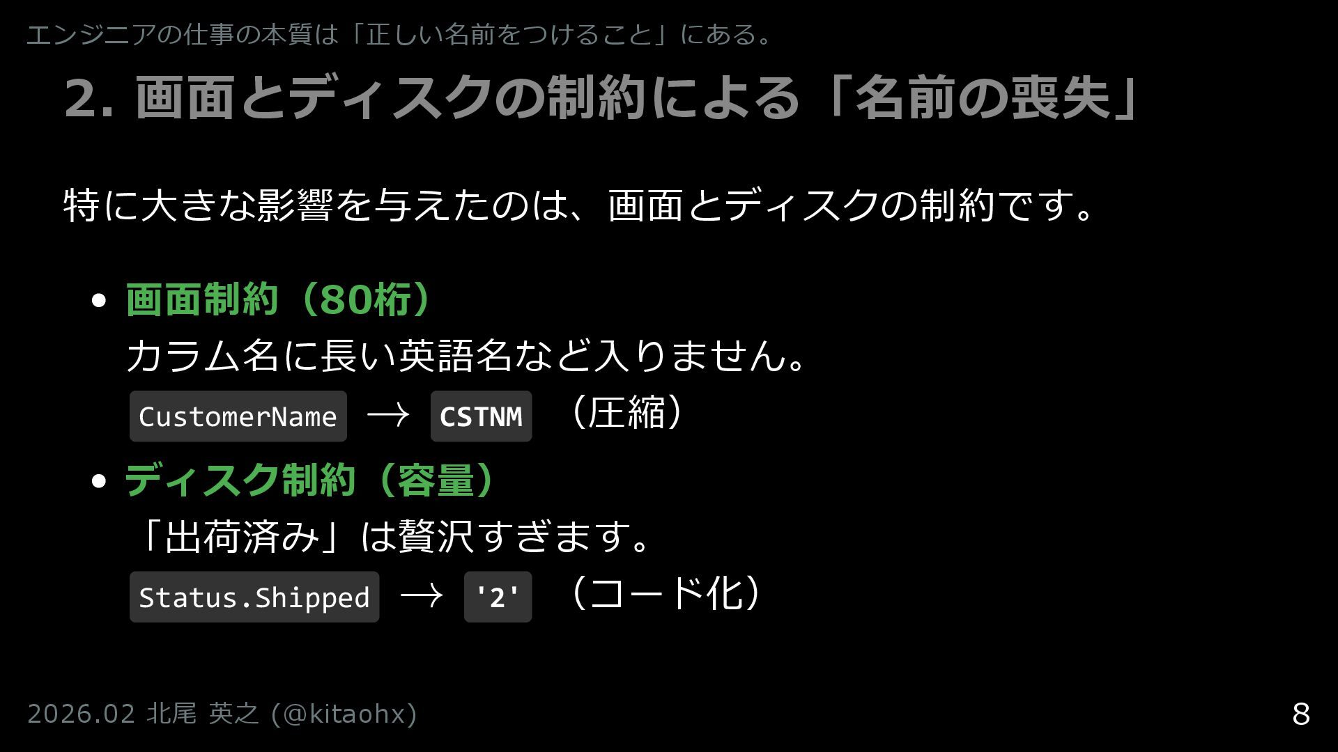 非力な計算能力 バイト/ビット単位の操作 (処理の高速化) 2. 画面 80桁 × 24行 項目の圧縮・略語化 (表示領域の確保) 3. ディスク 容量単価が高い コード化・区分値化 (記憶容量の節約) エンジニアの仕事の本質は「正しい名前をつけること」にある。 2026.02 北尾 英之 (@kitaohx) 7