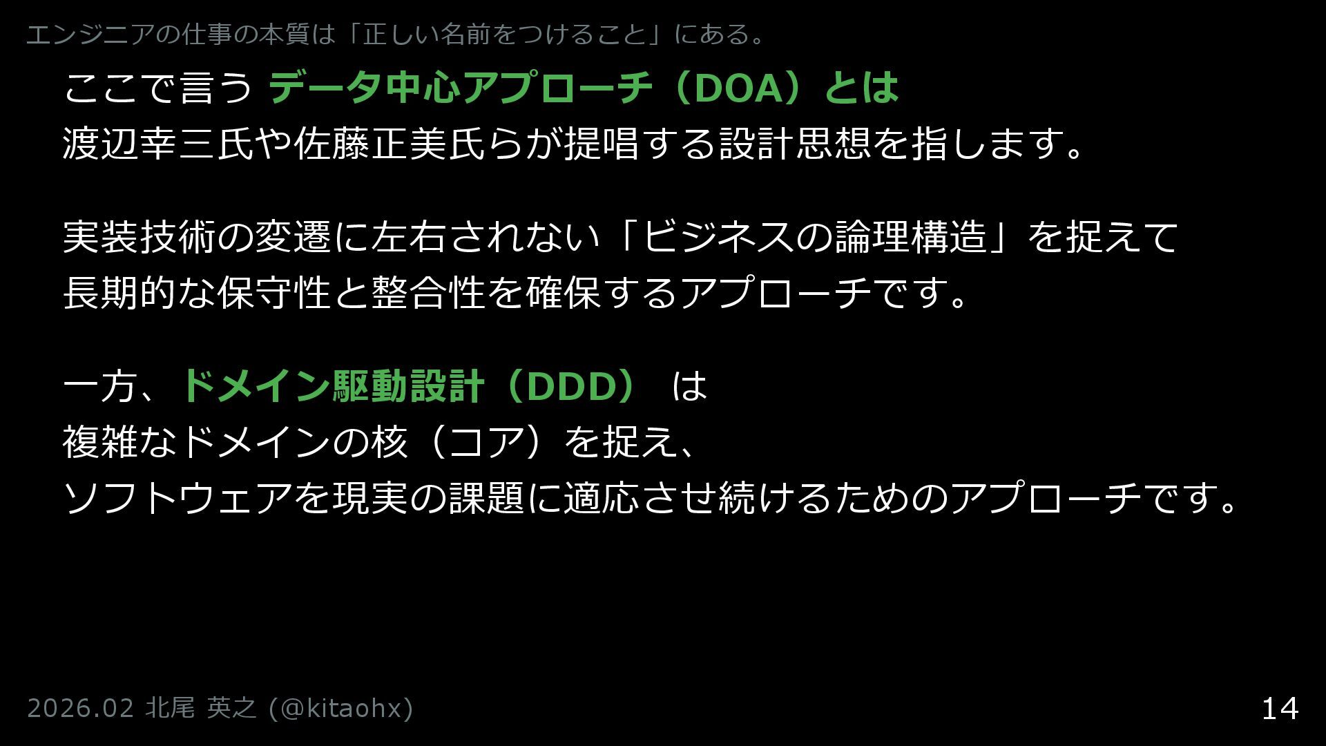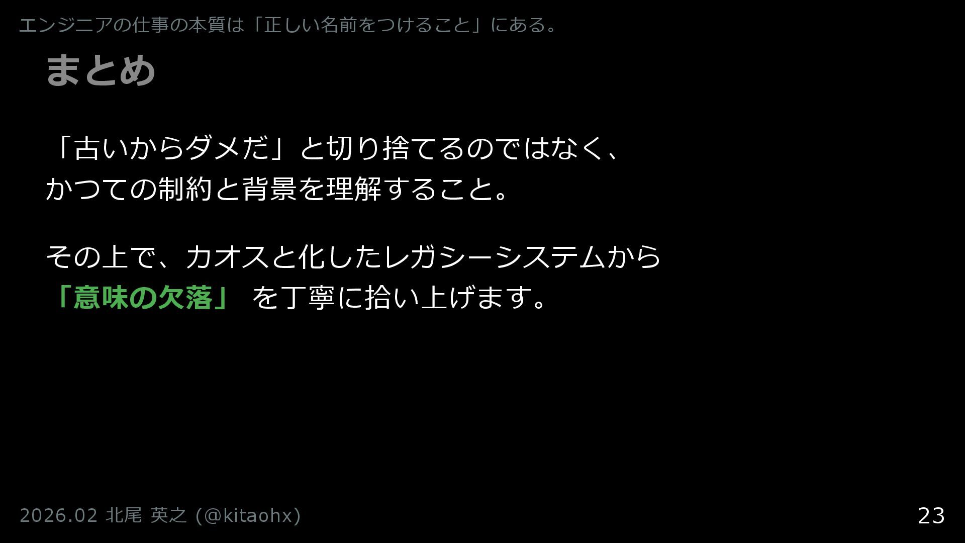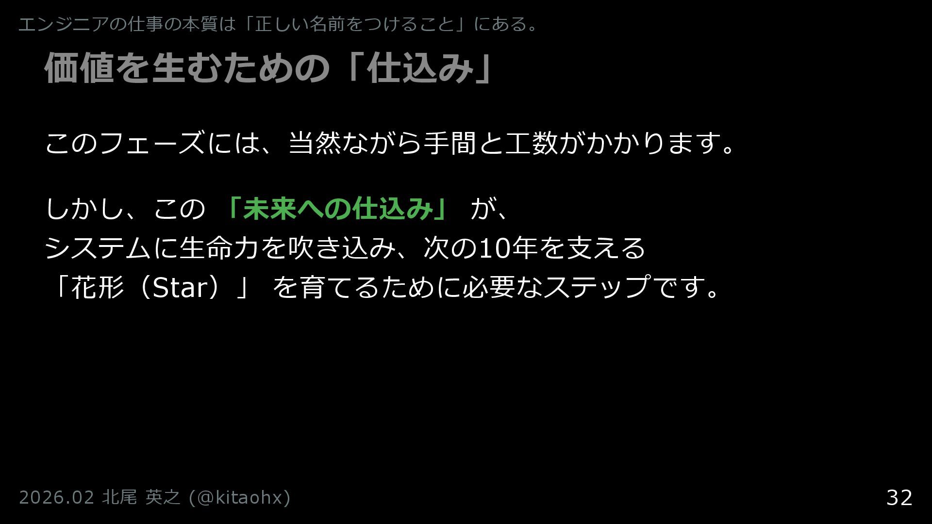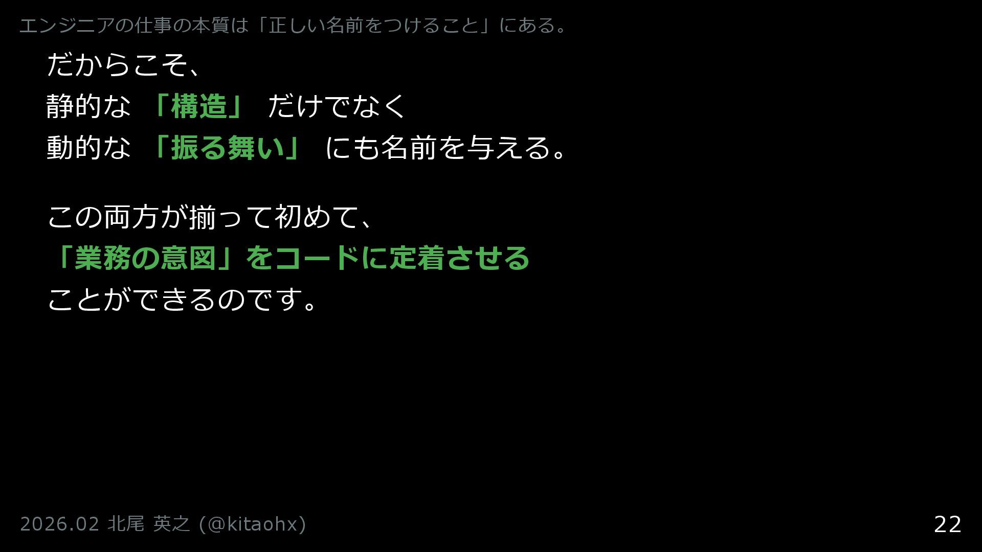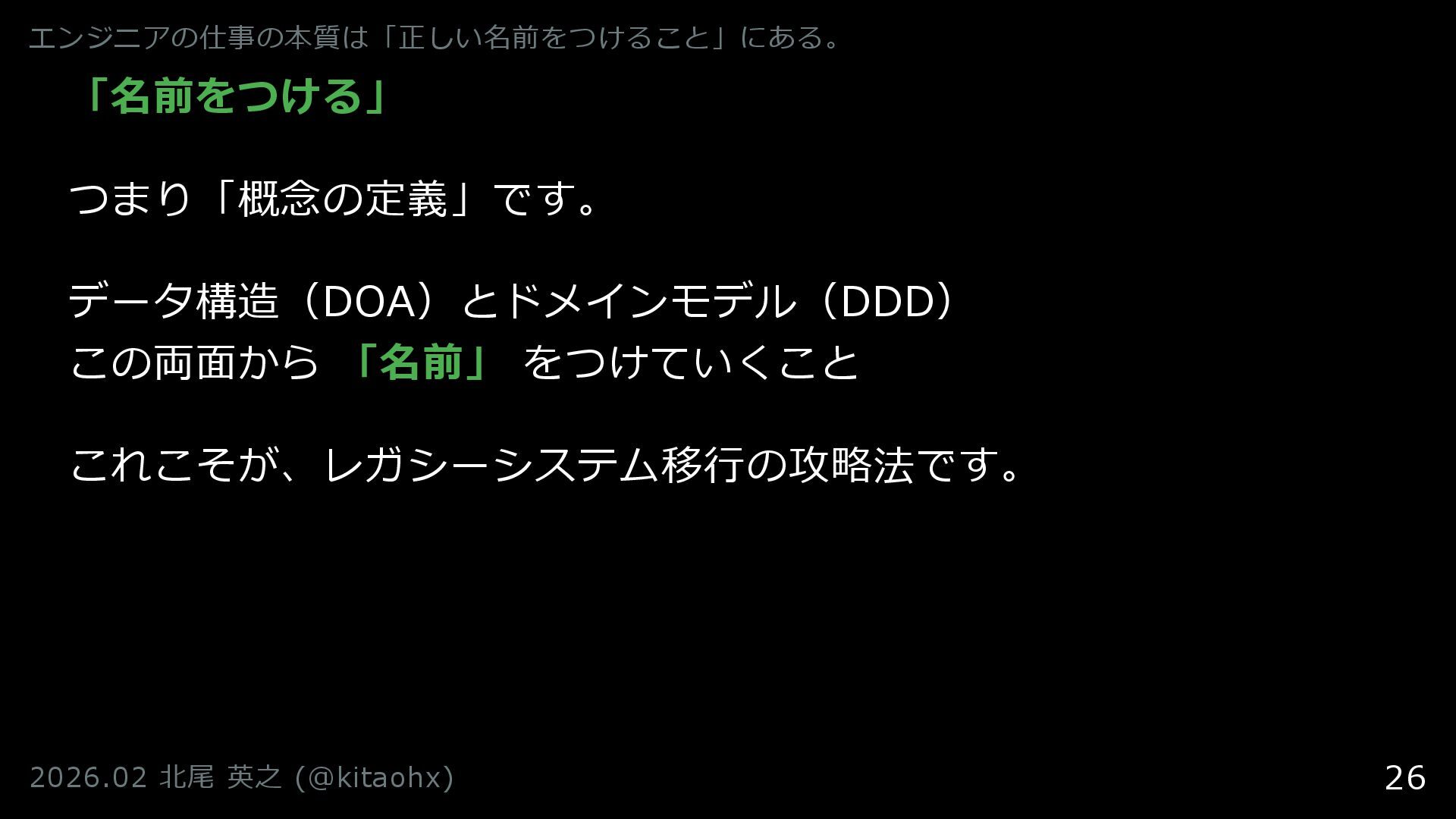 住所は顧客に 「何をする処理か?」の名づけ ロジックの塊に 「送料を算出する」と名付ける 「価値」の源泉 データの整合性と 長期的な再利用性 ビジネスルールの 変更に対する適応力 エンジニアの仕事の本質は「正しい名前をつけること」にある。 2026.02 北尾 英之 (@kitaohx) 25