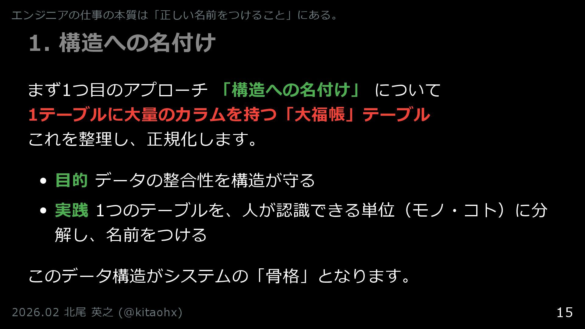 1つのテーブルを、人が認識できる単位(モノ・コト)に分 解し、名前をつける このデータ構造がシステムの「骨格」となります。 エンジニアの仕事の本質は「正しい名前をつけること」にある。 2026.02 北尾 英之 (@kitaohx) 15