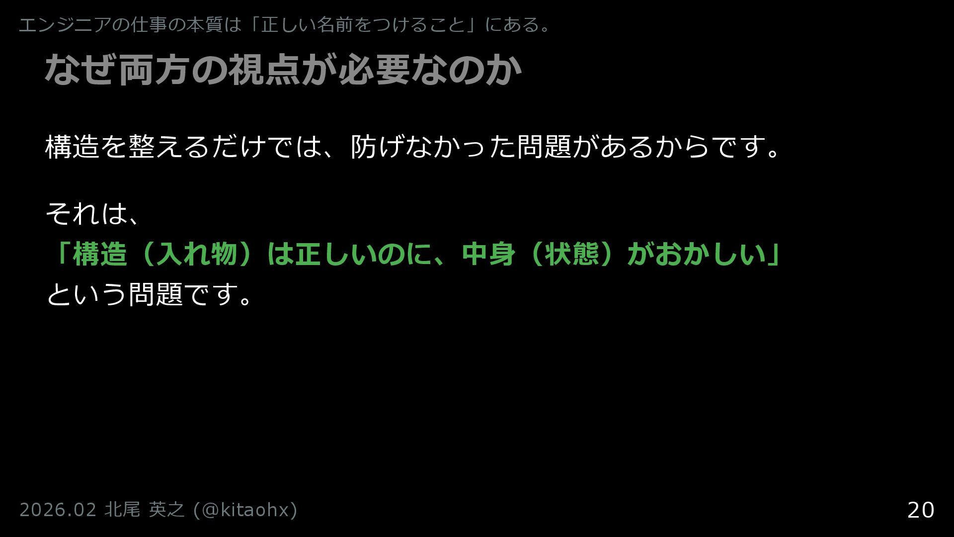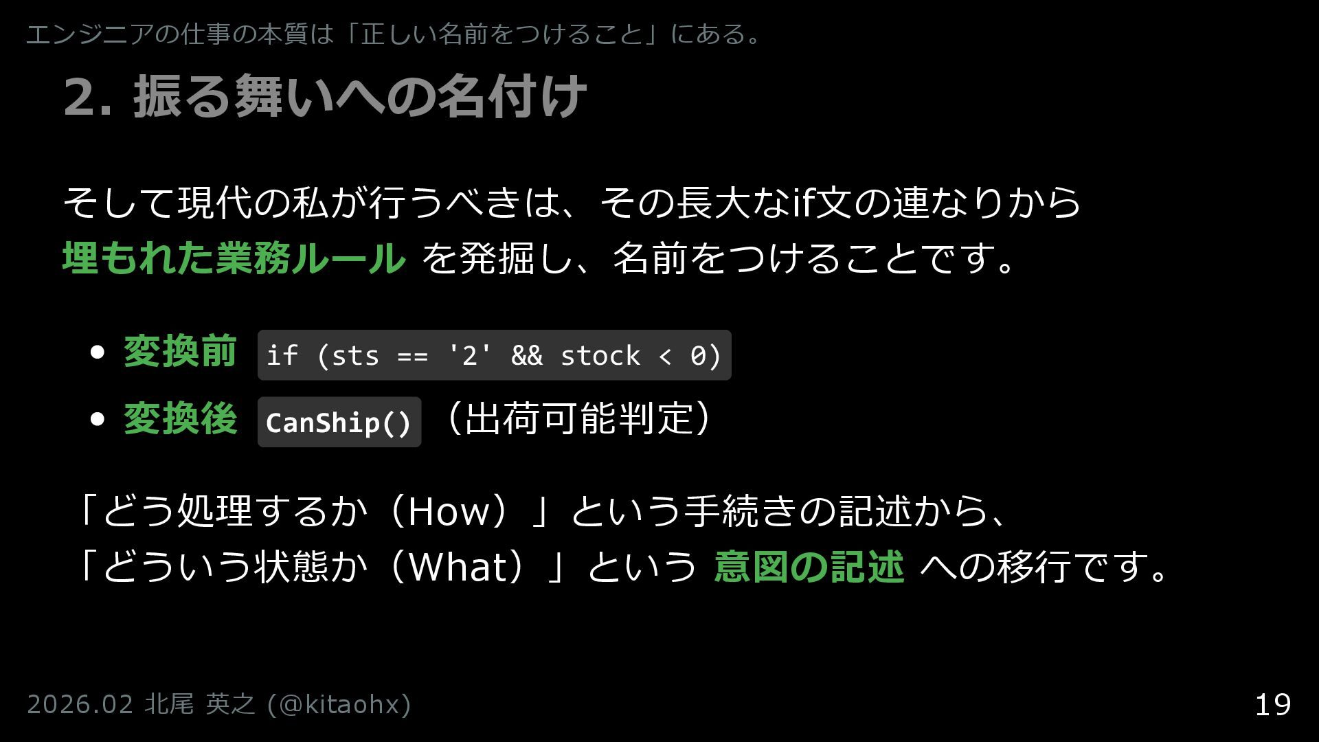 && stock < 0) 変換後 CanShip() (出荷可能判定) 「どう処理するか(How)」という手続きの記述から、 「どういう状態か(What)」という 意図の記述 への移行です。 エンジニアの仕事の本質は「正しい名前をつけること」にある。 2026.02 北尾 英之 (@kitaohx) 19