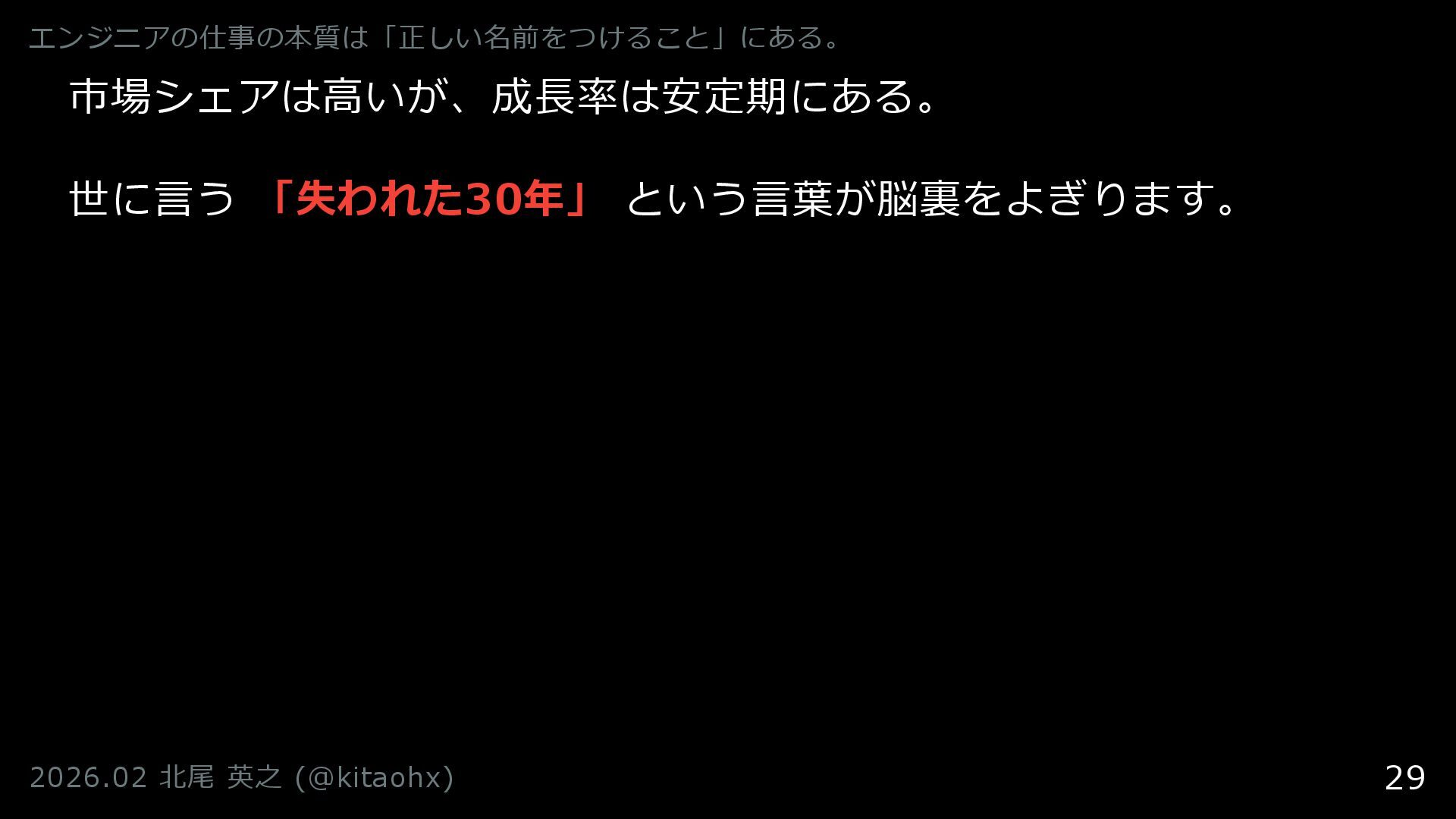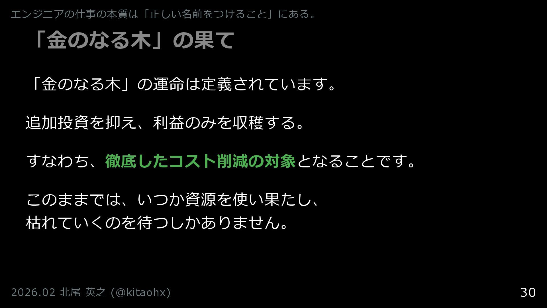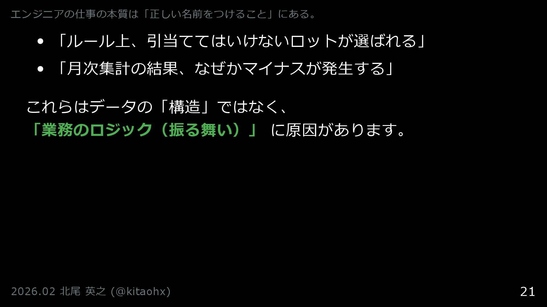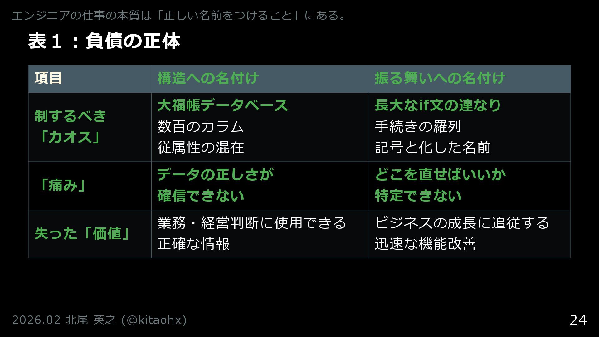 手続きの羅列 記号と化した名前 「痛み」 データの正しさが 確信できない どこを直せばいいか 特定できない 失った「価値」 業務・経営判断に使用できる 正確な情報 ビジネスの成長に追従する 迅速な機能改善 エンジニアの仕事の本質は「正しい名前をつけること」にある。 2026.02 北尾 英之 (@kitaohx) 24