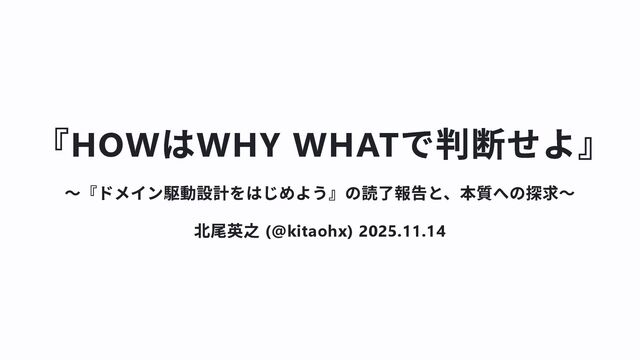 『ドメイン駆動設計をはじめよう』の読了レポートです。 なぜ開発現場は「HOW(どうやるか)」の話ばかりしてしまうのか。この「HOWの罠」に対し、本書の本質を「WHY(課題)→WHAT(ドメイン)→HOW(実装)」という「思考の順序」として捉え直しました。本質的な議論を始めるための「問い」を提案するスライドです。