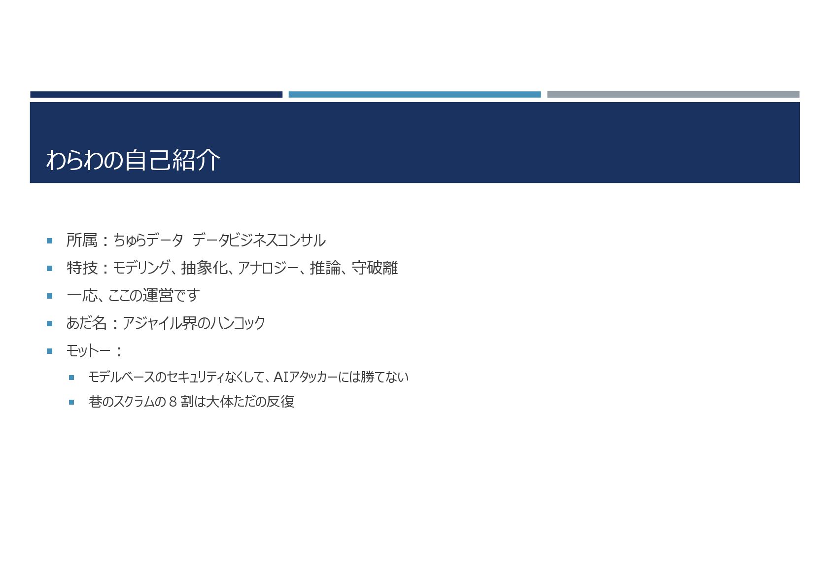わらわの自己紹介 所属:ちゅらデータ データビジネスコンサル 特技:モデリング、抽象化、アナロジー、推論、守破離 一応、ここの運営です あだ名:アジャイル界のハンコック