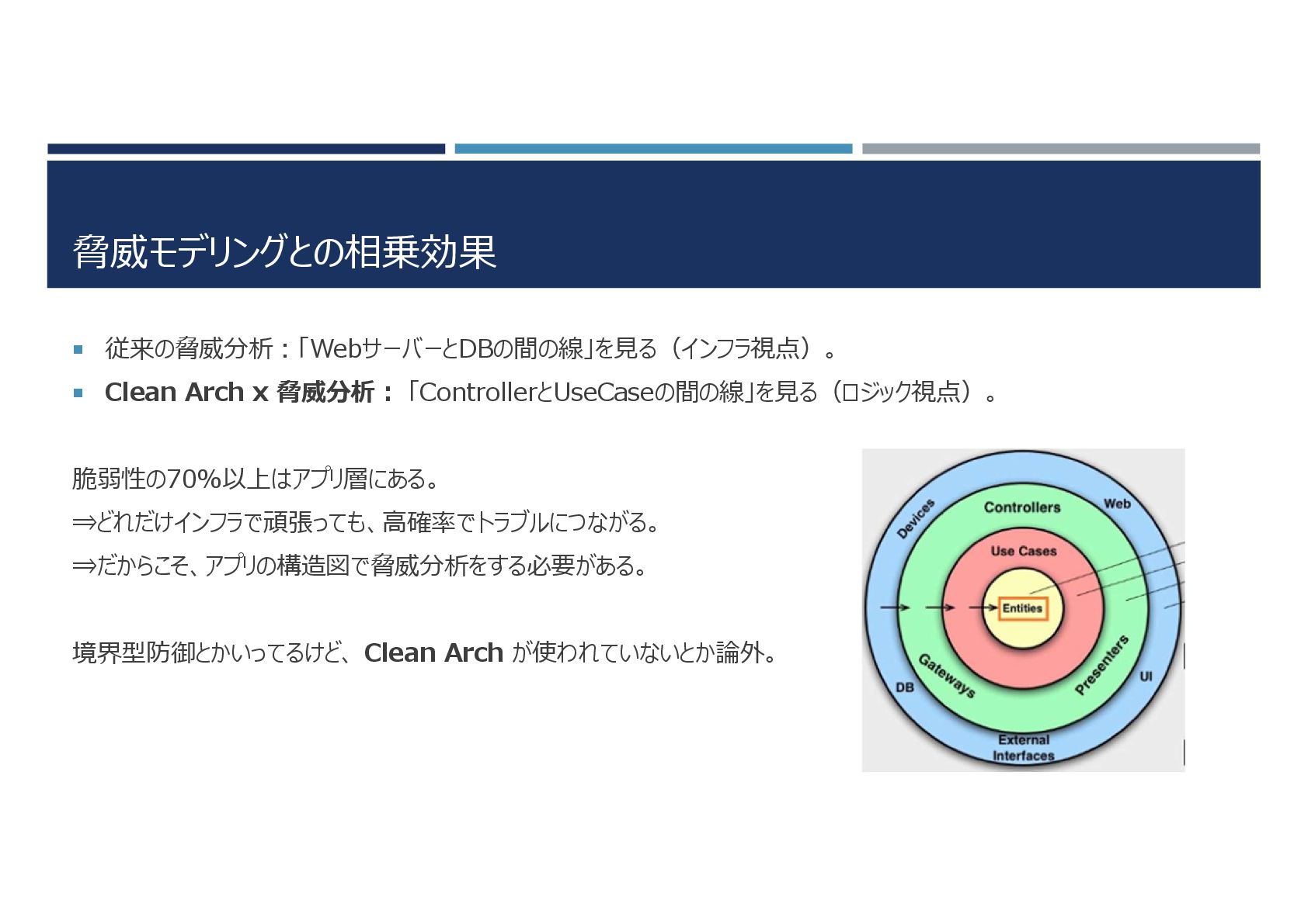 脅威モデリングとの相乗効果 従来の脅威分析:「WebサーバーとDBの間の線」を見る(インフラ視点)。 Clean Arch x 脅威分析: 「ControllerとUseCaseの間の線」を見る(ロジック視点)。 脆弱性の70%以上はアプリ層にある。