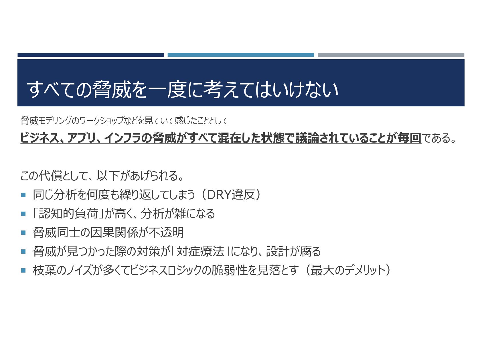 すべての脅威を一度に考えてはいけない 脅威モデリングのワークショップなどを見ていて感じたこととして ビジネス、アプリ、インフラの脅威がすべて混在した状態で議論されていることが毎回である。 この代償として、以下があげられる。 同じ分析を何度も繰り返してしまう(DRY違反) 「認知的負荷」が高く、分析が雑になる 脅威同士の因果関係が不透明