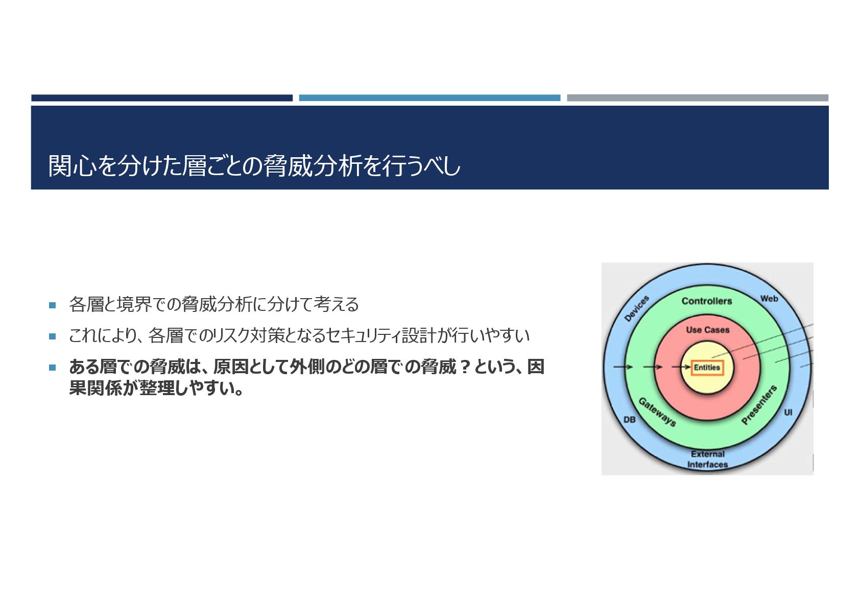 関心を分けた層ごとの脅威分析を行うべし 各層と境界での脅威分析に分けて考える これにより、各層でのリスク対策となるセキュリティ設計が行いやすい ある層での脅威は、原因として外側のどの層での脅威?という、因 果関係が整理しやすい。
